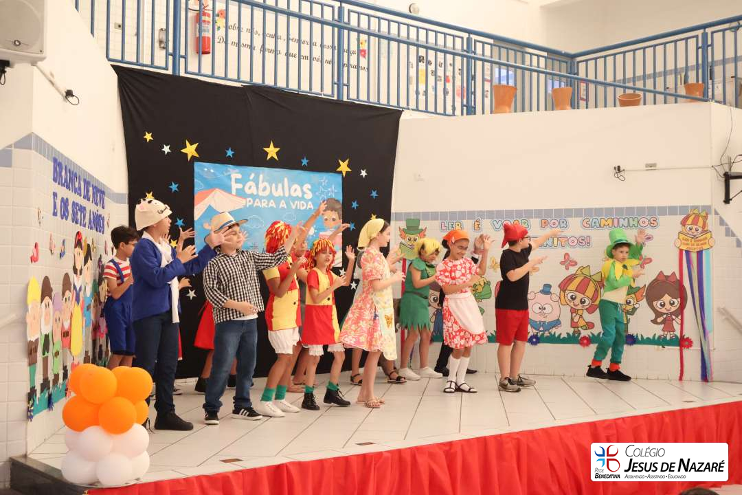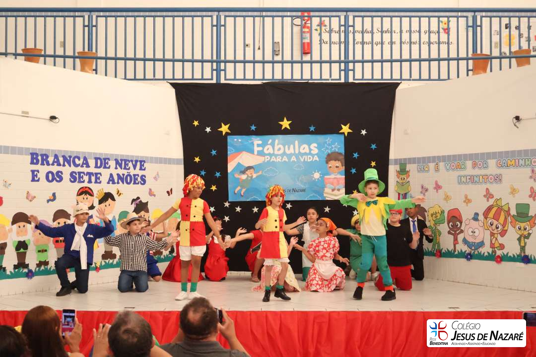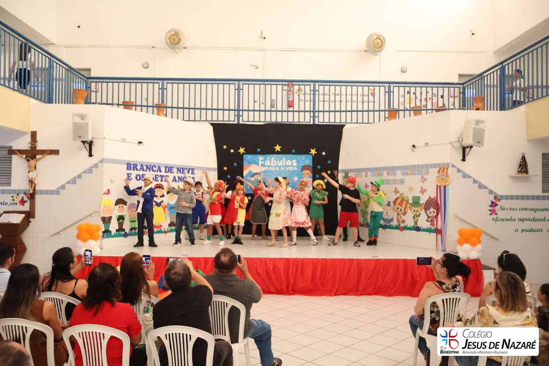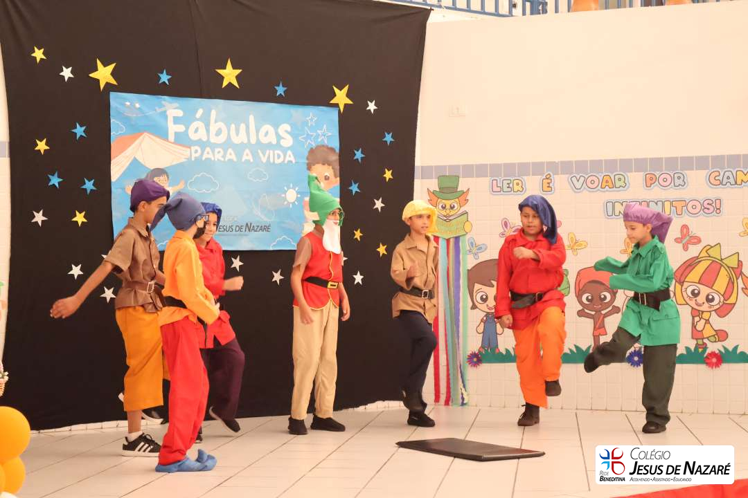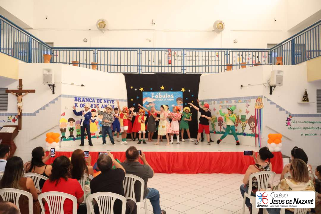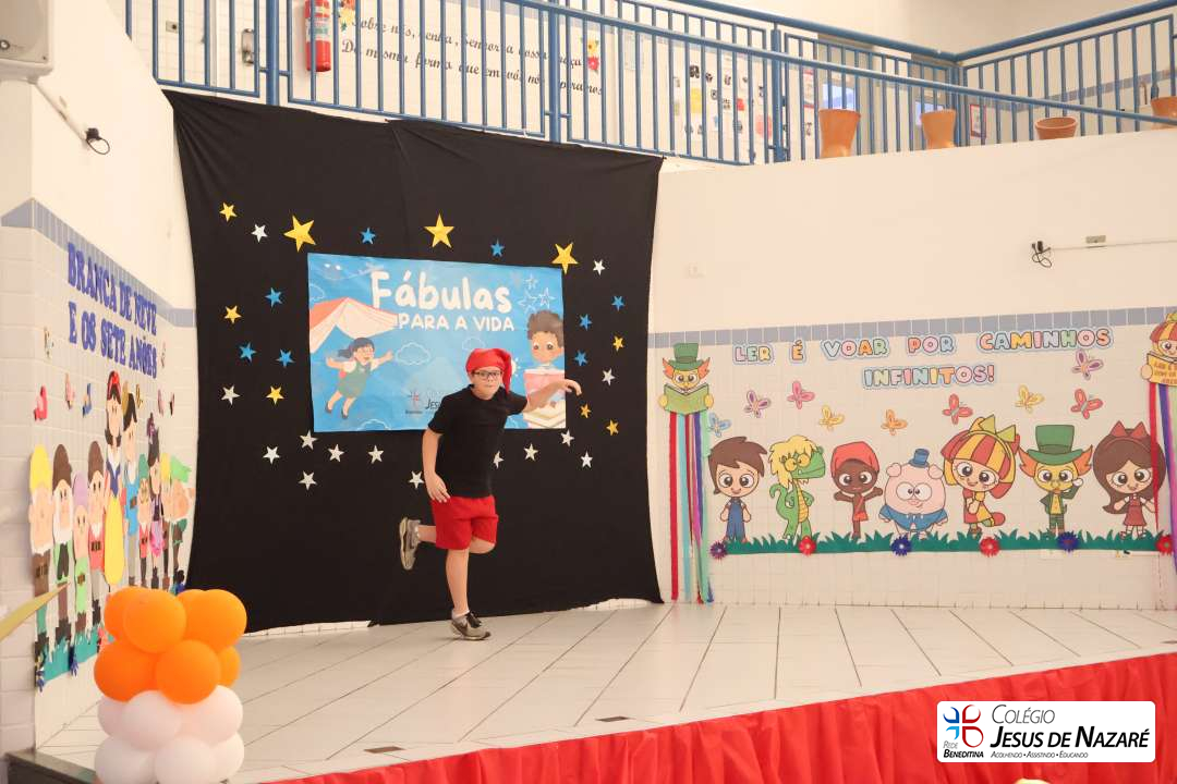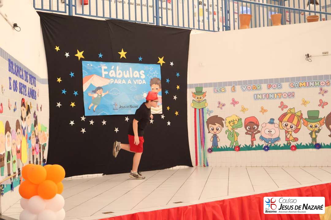 O 2º ano abriu sua participação com muita doçura e magia, trazendo ao palco histórias como Chapeuzinho Vermelho e Aladim, que encantaram a todos. Já o 3º ano emocionou com a sensibilidade do Pequeno Príncipe, lembrando-nos da amizade e de ver com o coração. O 4º ano brilhou com a criatividade do Sítio do Picapau Amarelo e a delicadeza da Branca de Neve. E o 5º ano encerrou em grande estilo com as fábulas, transmitindo lições preciosas para a vida.