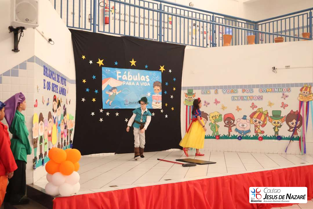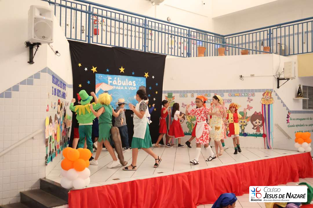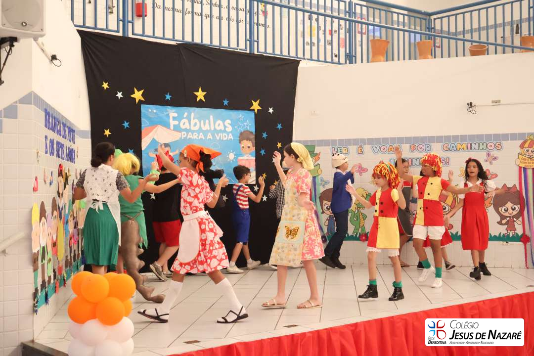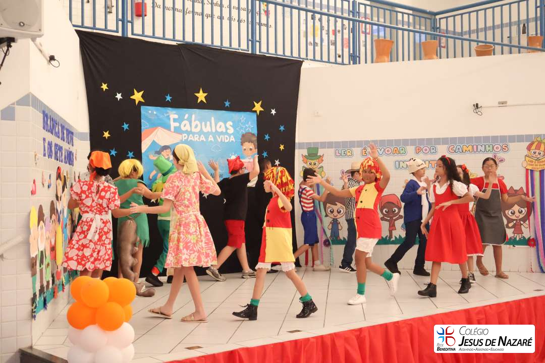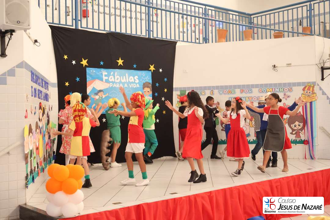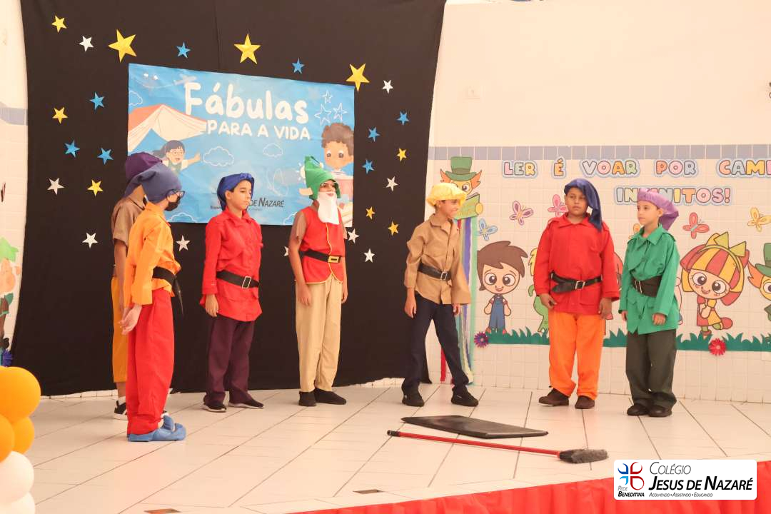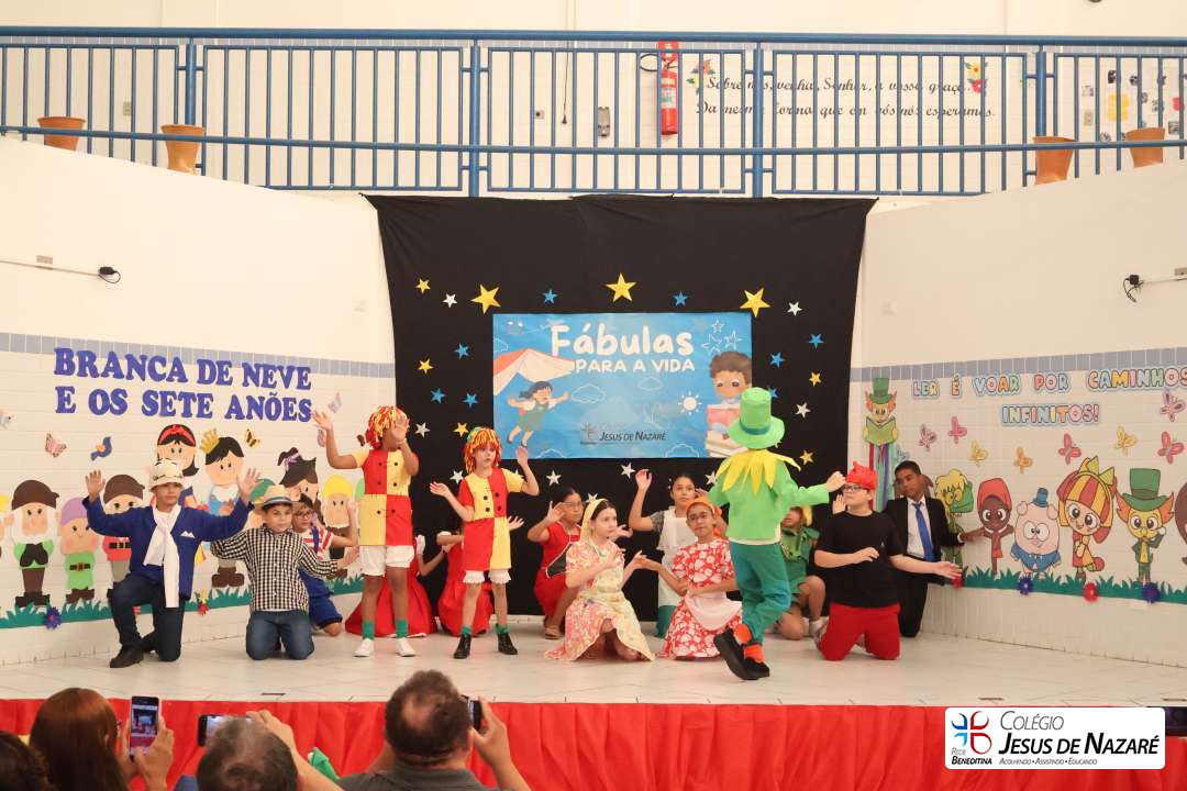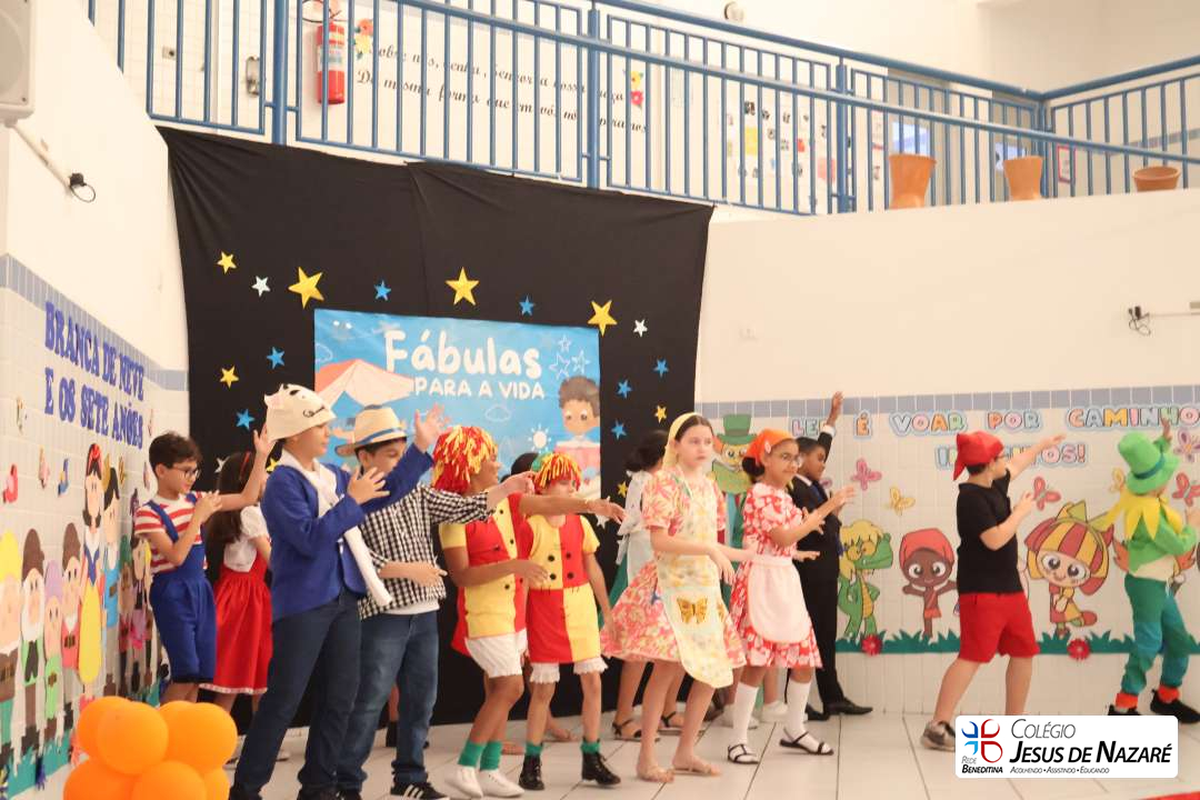O 2º ano abriu sua participação com muita doçura e magia, trazendo ao palco histórias como Chapeuzinho Vermelho e Aladim, que encantaram a todos. Já o 3º ano emocionou com a sensibilidade do Pequeno Príncipe, lembrando-nos da amizade e de ver com o coração. O 4º ano brilhou com a criatividade do Sítio do Picapau Amarelo e a delicadeza da Branca de Neve. E o 5º ano encerrou em grande estilo com as fábulas, transmitindo lições preciosas para a vida.