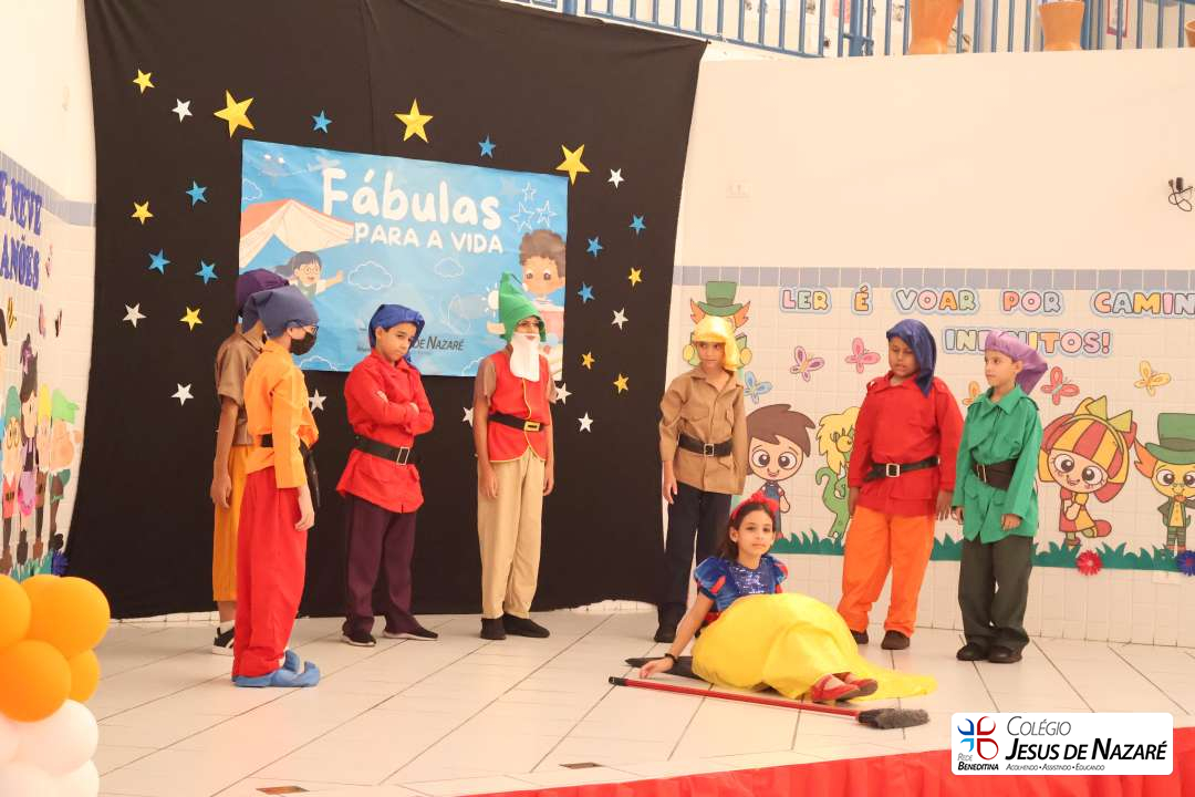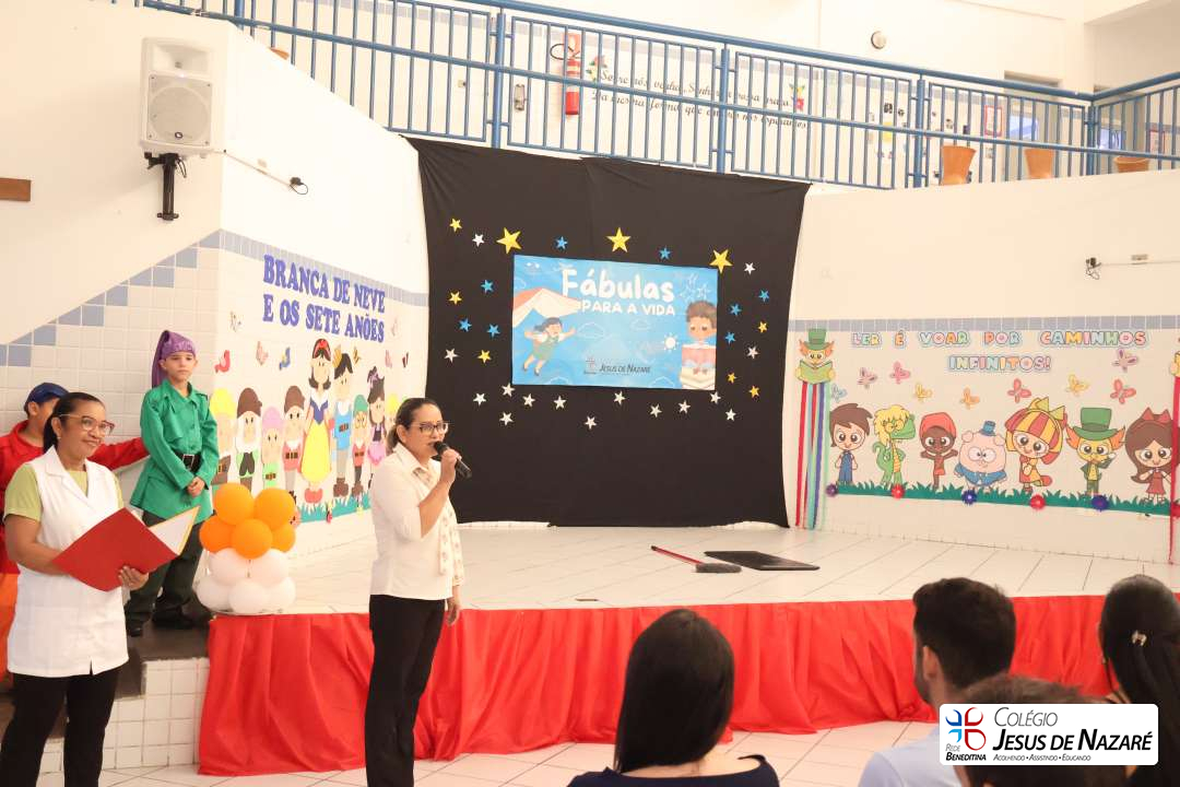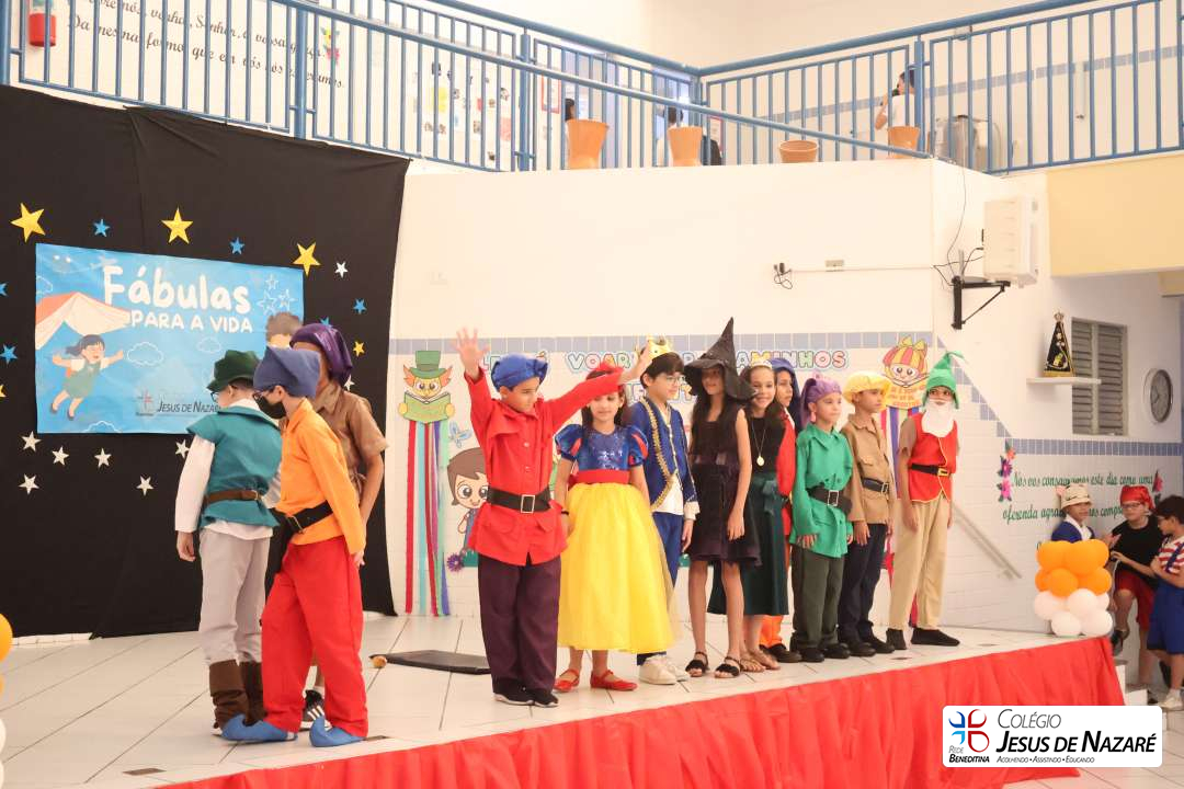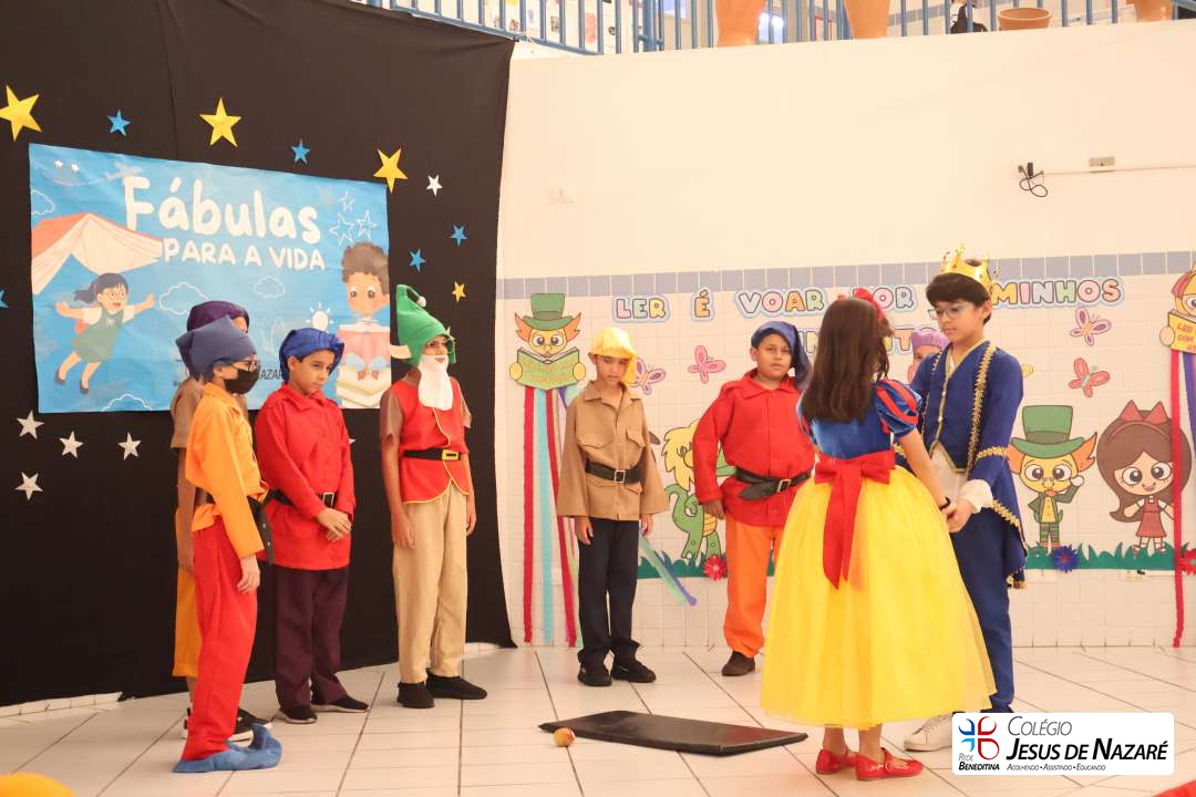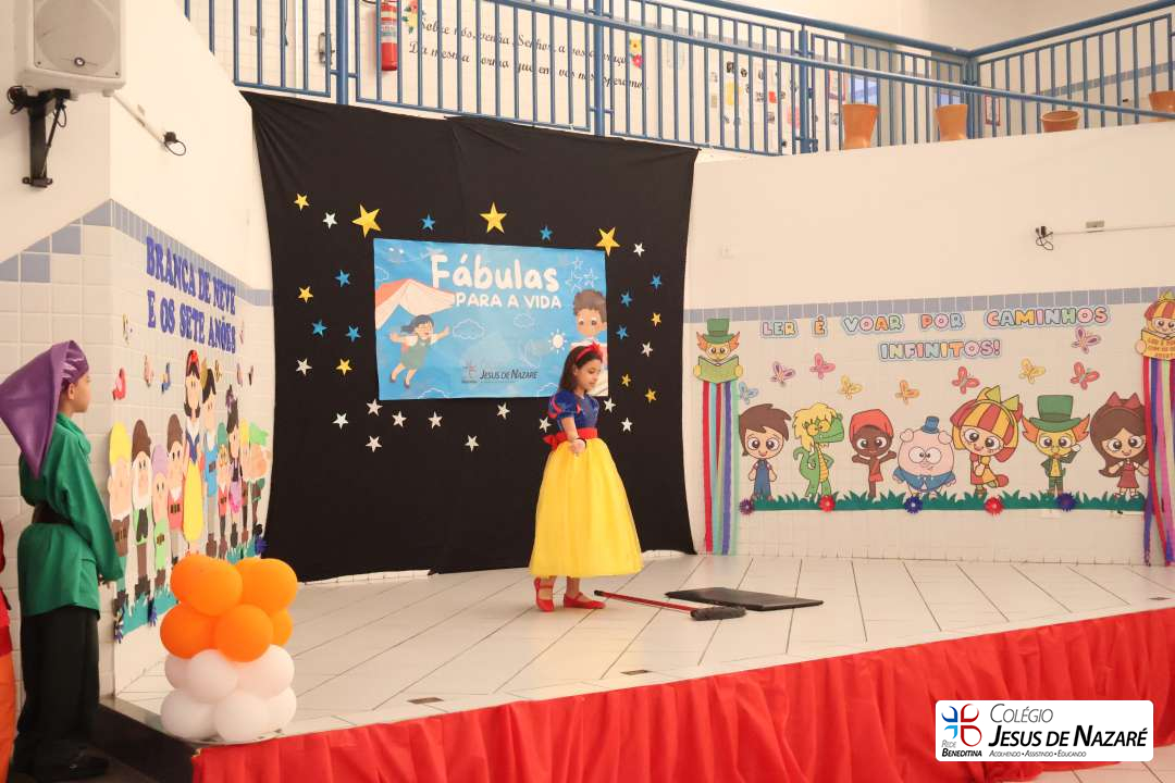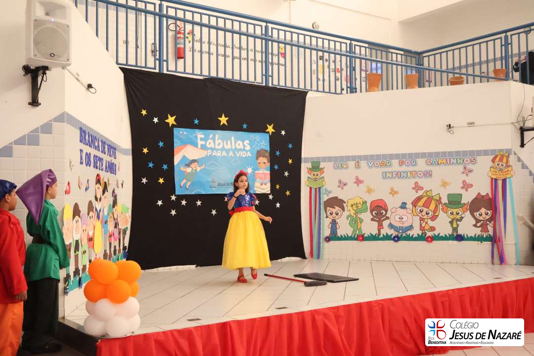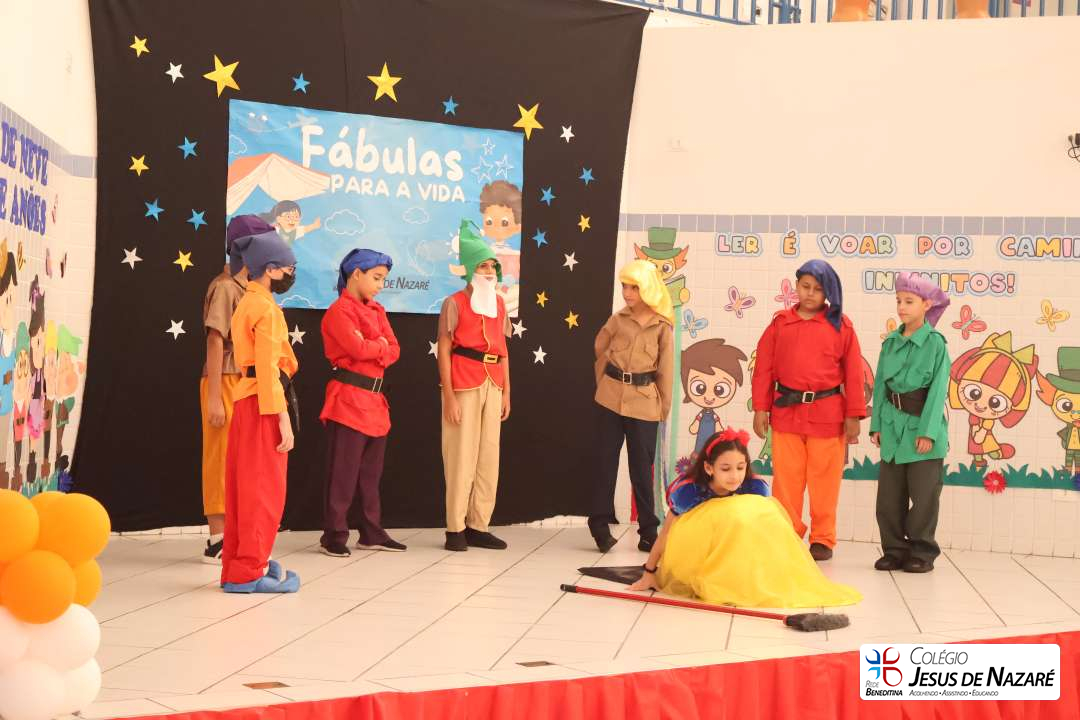 O 2º ano abriu sua participação com muita doçura e magia, trazendo ao palco histórias como Chapeuzinho Vermelho e Aladim, que encantaram a todos. Já o 3º ano emocionou com a sensibilidade do Pequeno Príncipe, lembrando-nos da amizade e de ver com o coração. O 4º ano brilhou com a criatividade do Sítio do Picapau Amarelo e a delicadeza da Branca de Neve. E o 5º ano encerrou em grande estilo com as fábulas, transmitindo lições preciosas para a vida.
