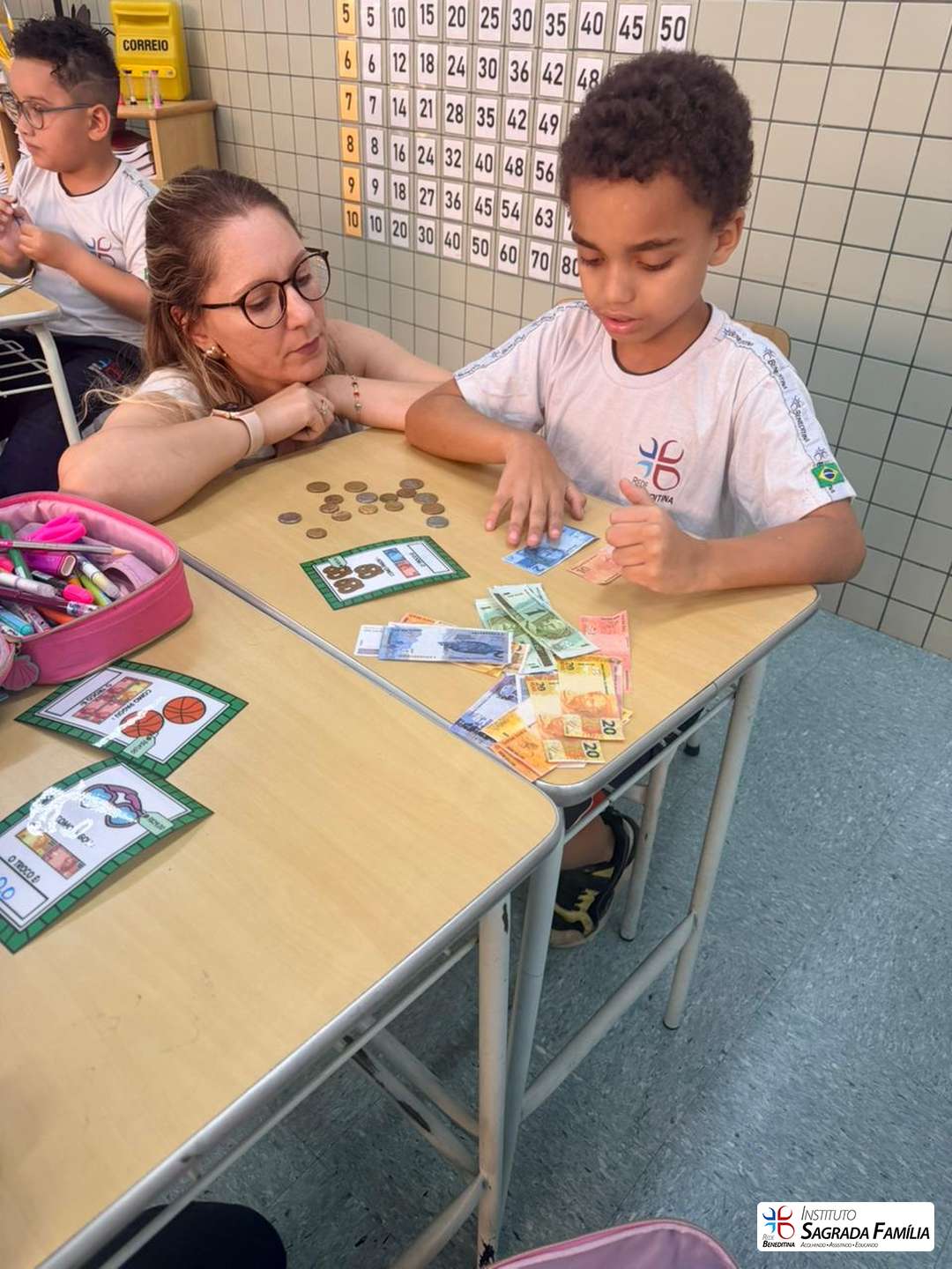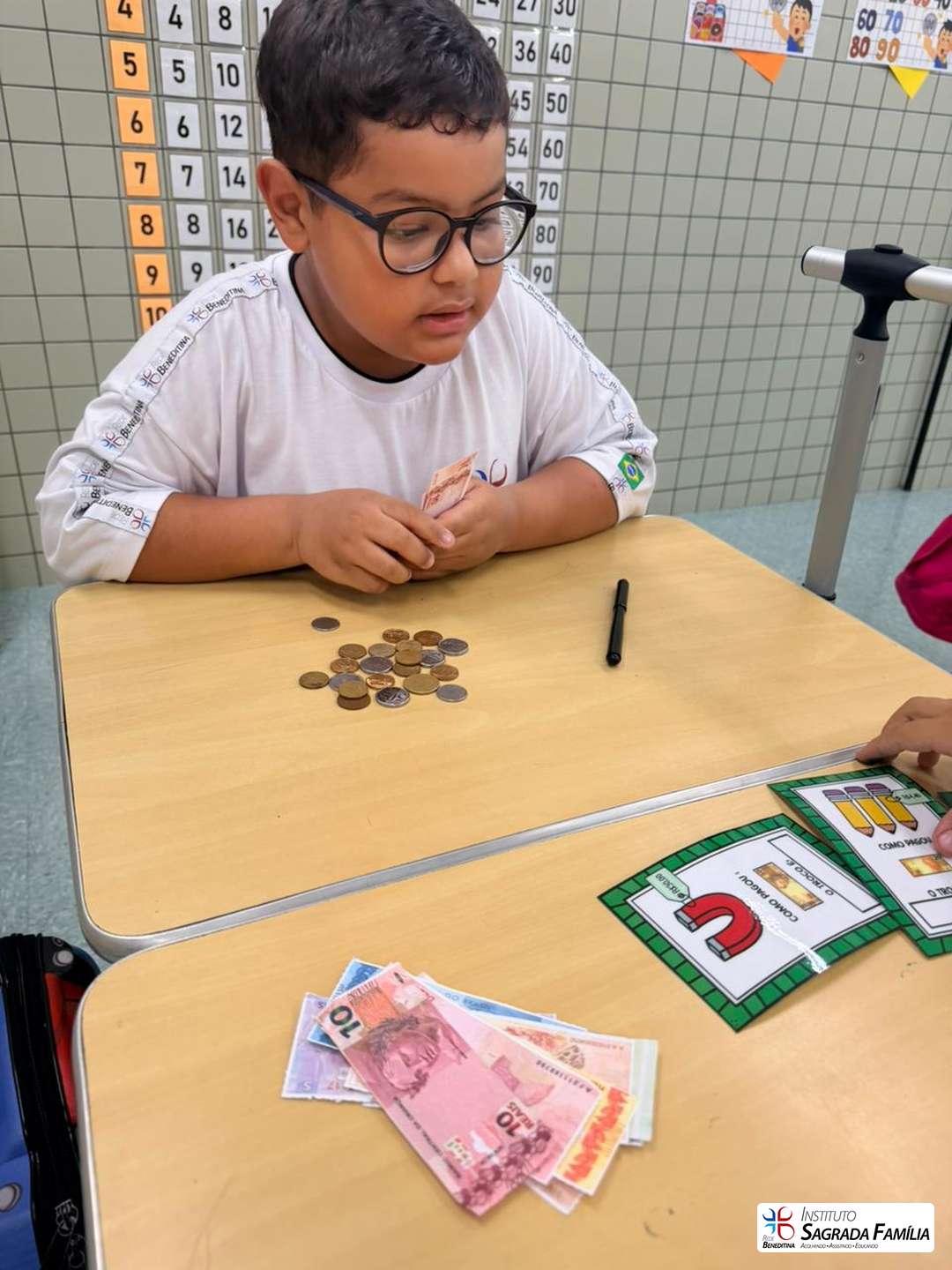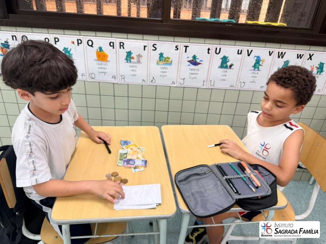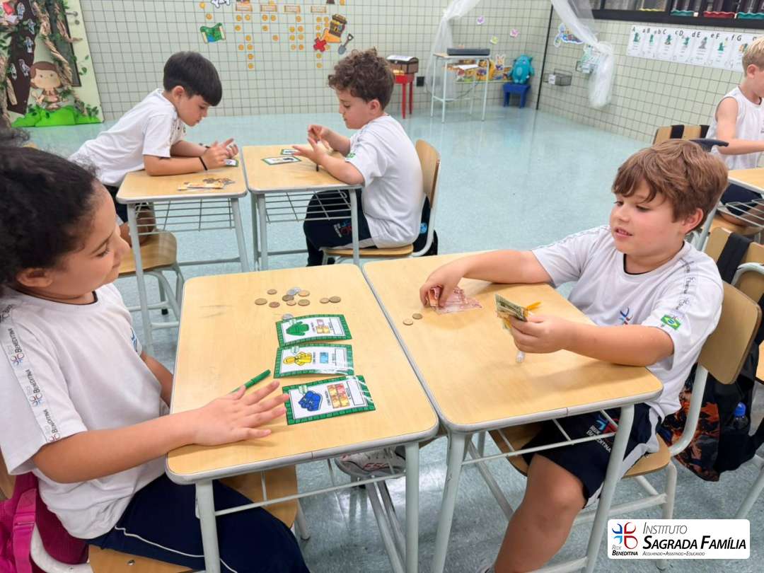 Durante a atividade, os estudantes simularam situações do cotidiano, calculando valores e identificando o troco correto a ser devolvido aos colegas. A dinâmica favoreceu não apenas a compreensão de conceitos matemáticos, mas também o desenvolvimento da autonomia, da atenção e da interação entre os alunos.