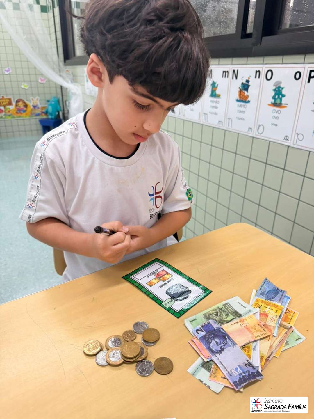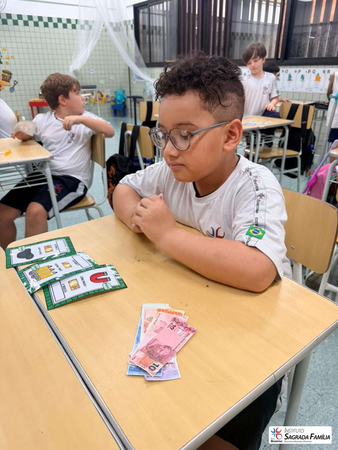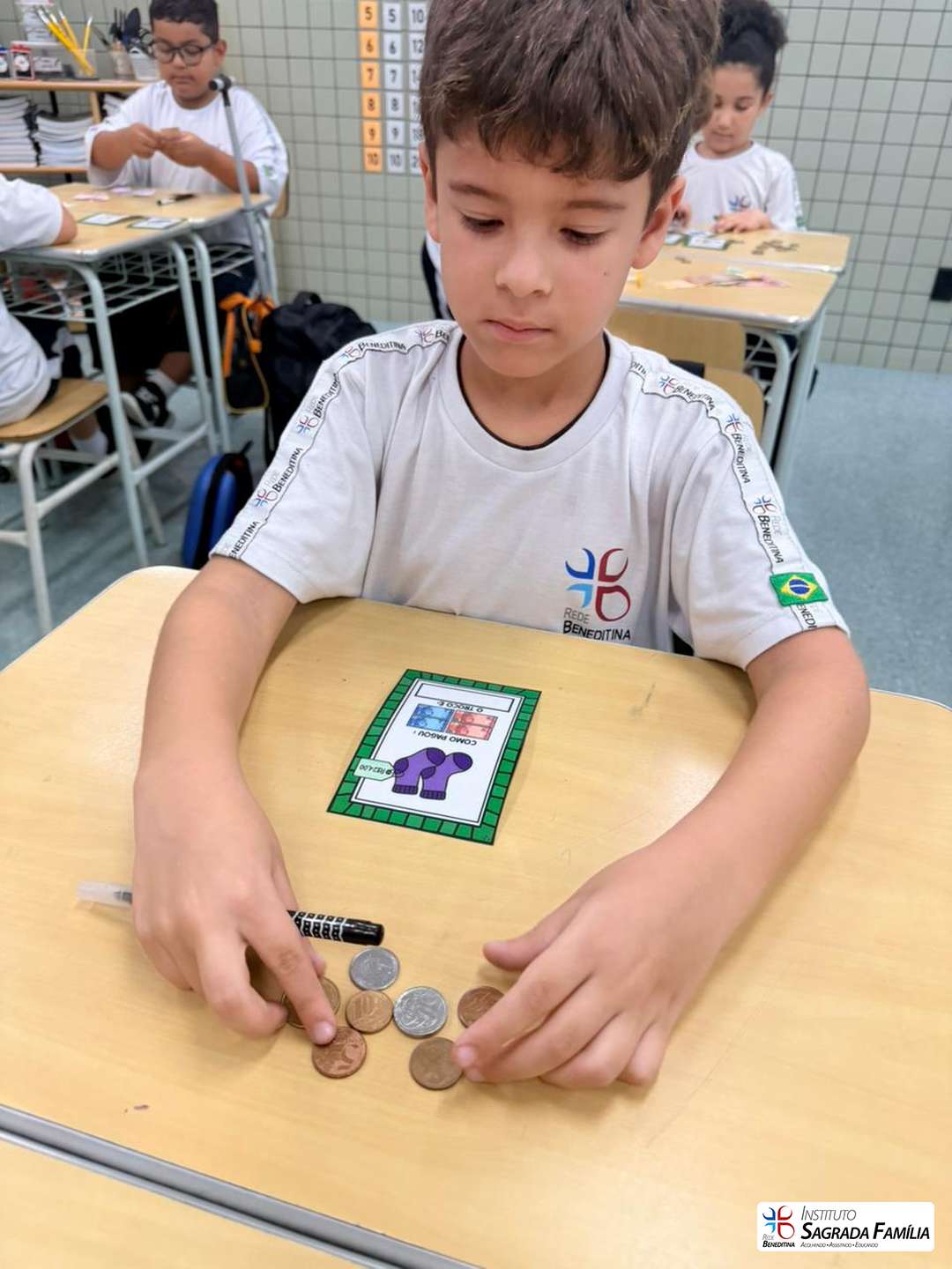 Durante a atividade, os estudantes simularam situações do cotidiano, calculando valores e identificando o troco correto a ser devolvido aos colegas. A dinâmica favoreceu não apenas a compreensão de conceitos matemáticos, mas também o desenvolvimento da autonomia, da atenção e da interação entre os alunos.