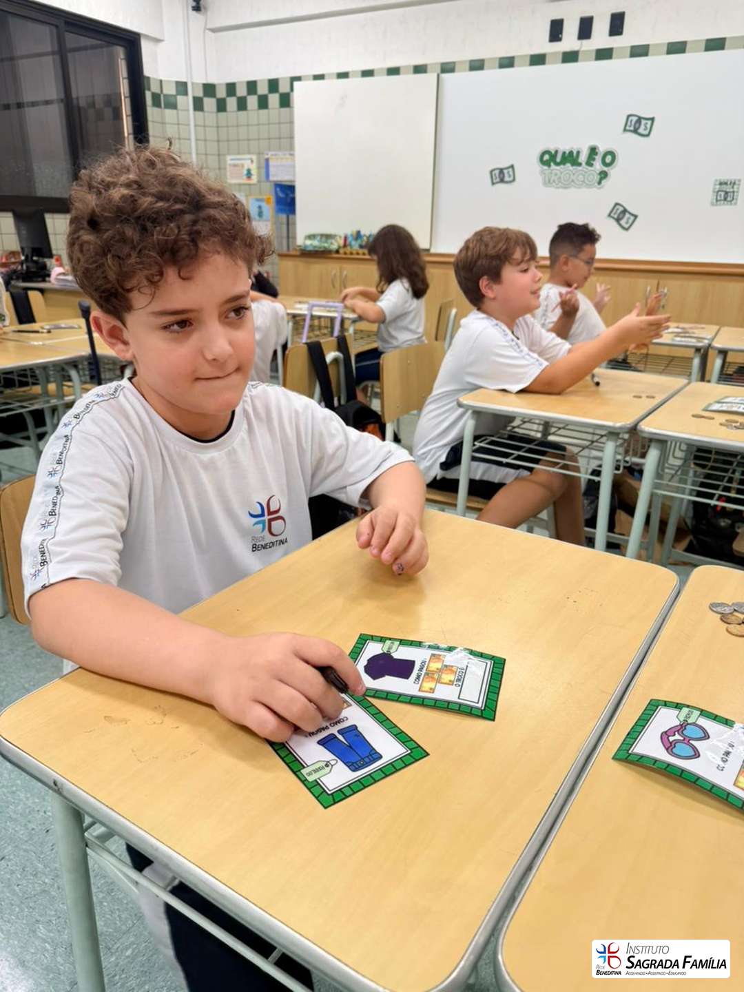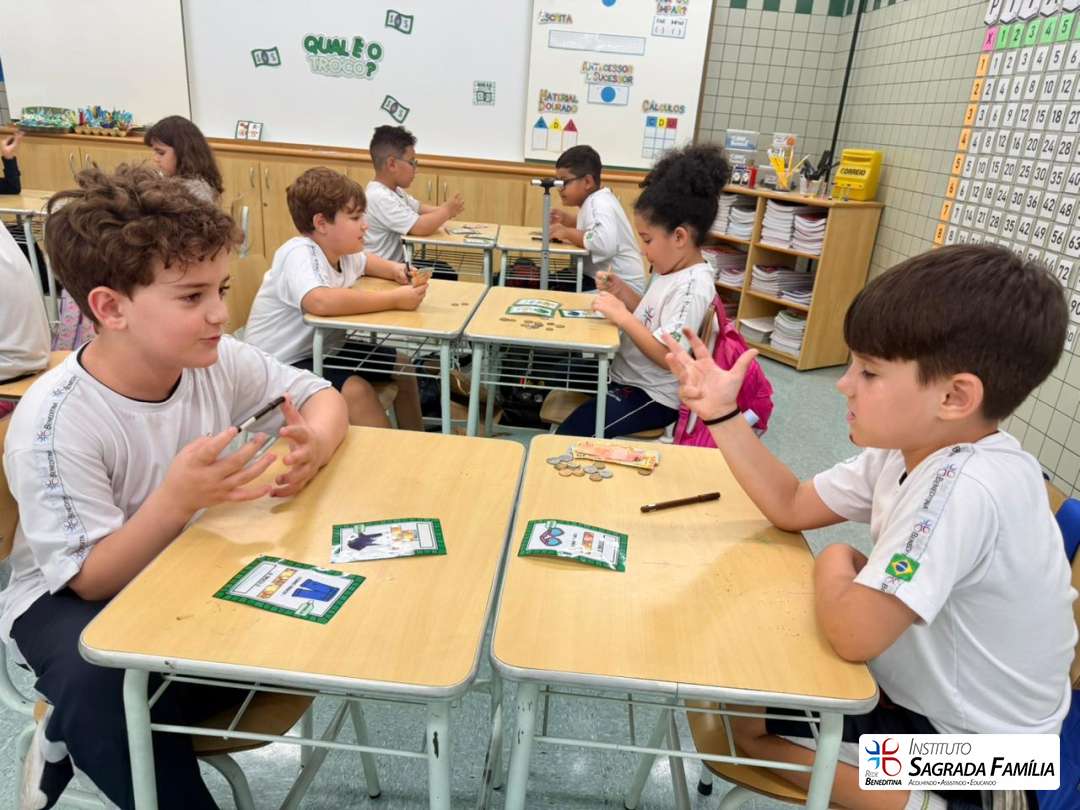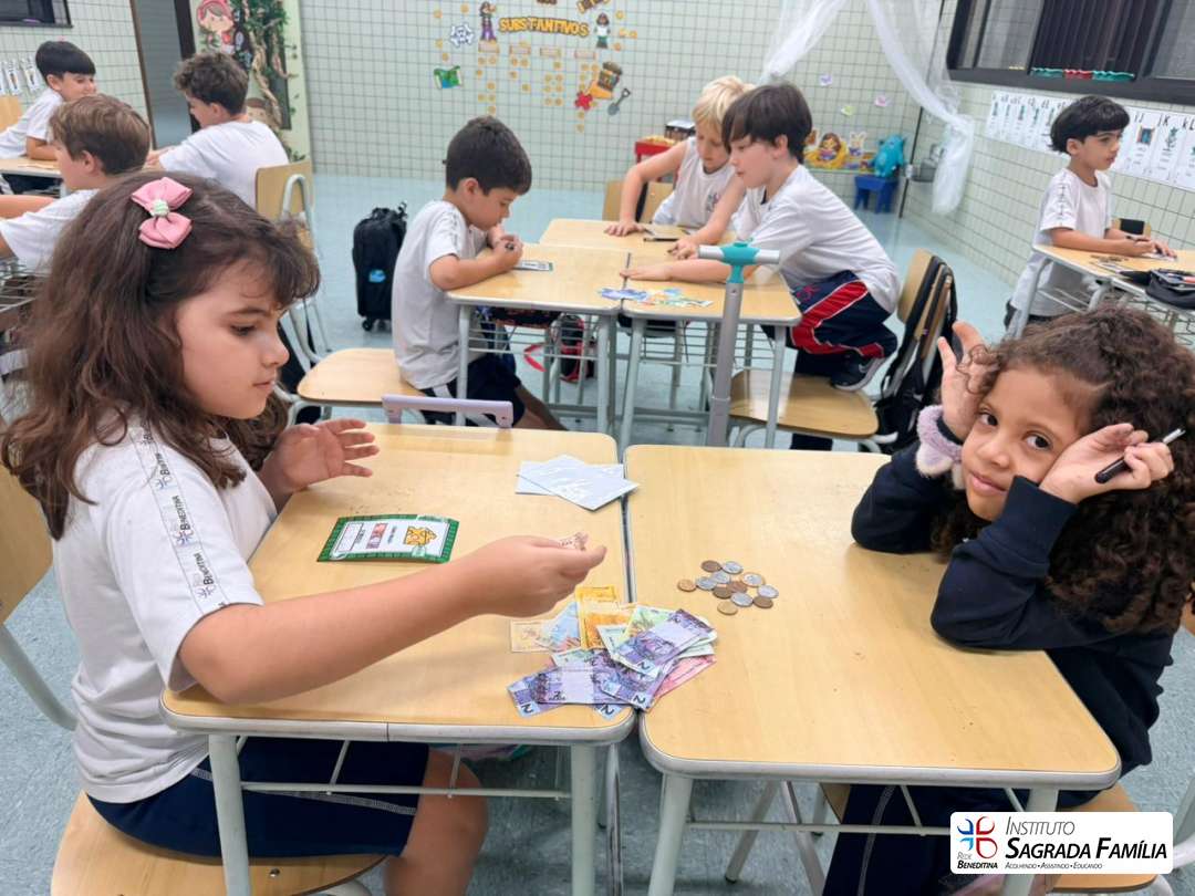 Os alunos dos anos iniciais participaram da atividade “Qual é o troco?”, uma proposta pedagógica que estimula o desenvolvimento do raciocínio lógico-matemático de forma prática e significativa.