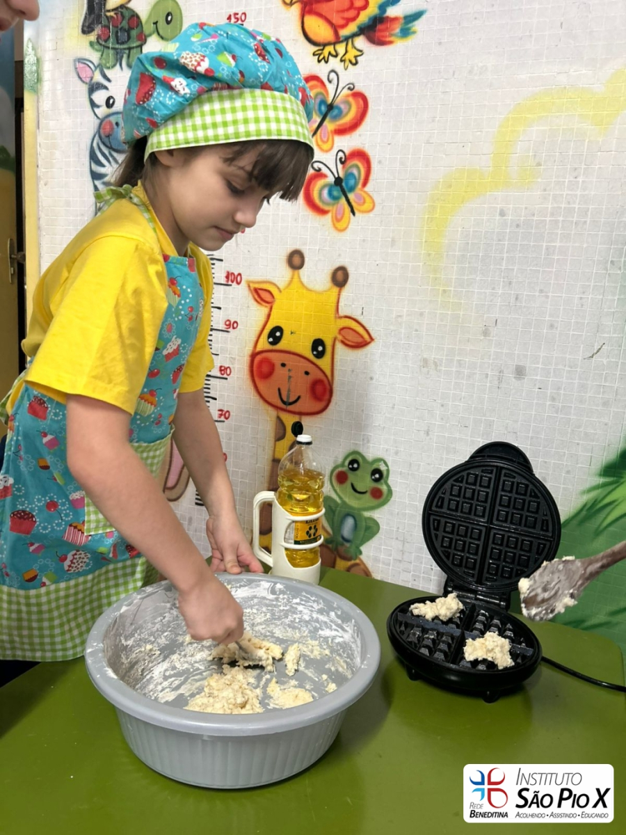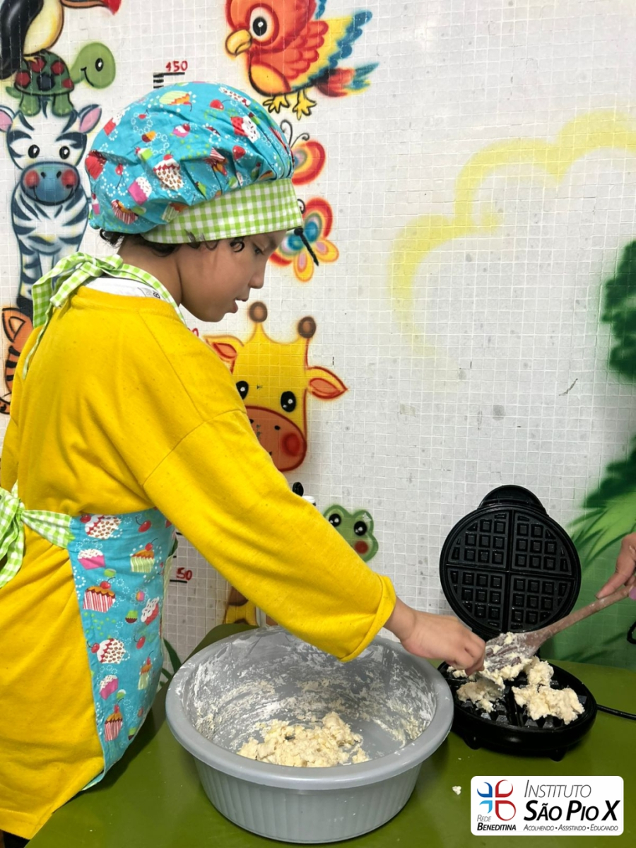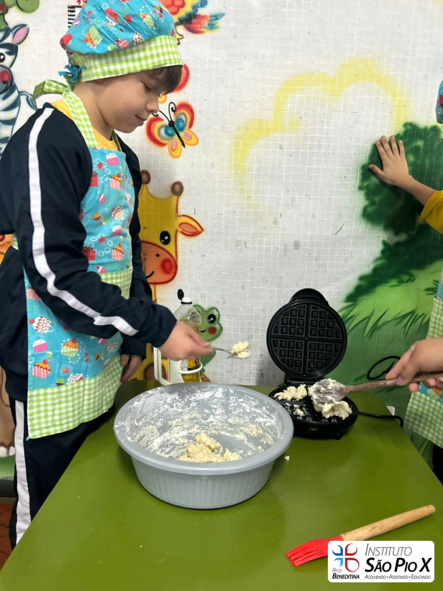 A turma preparou um saboroso waffle de pão de queijo, unindo criatividade, trabalho em equipe e muito apetite.