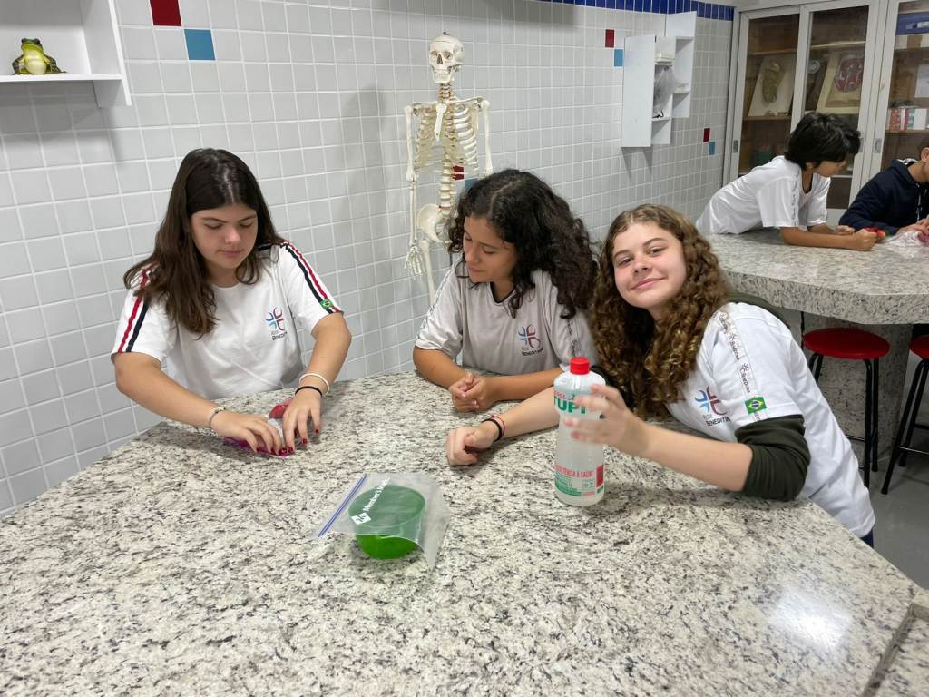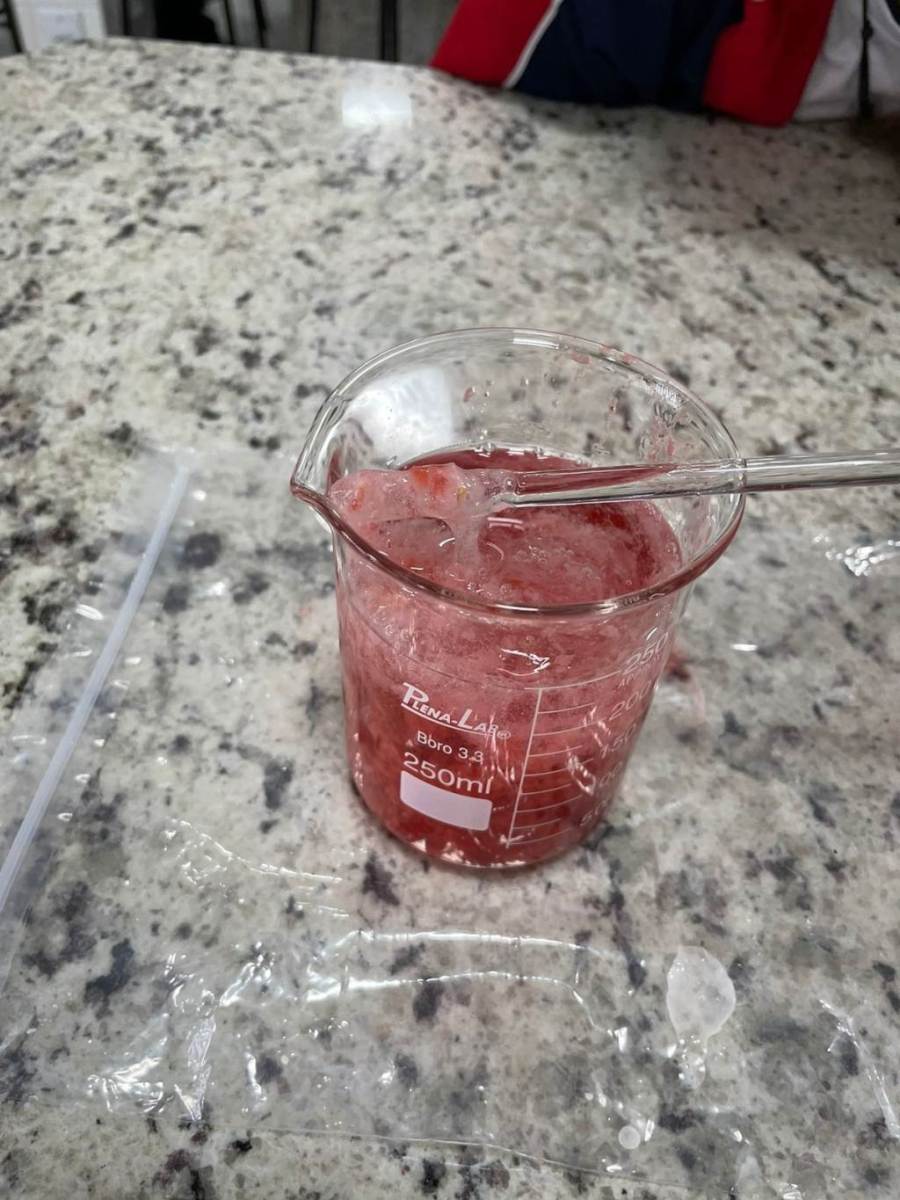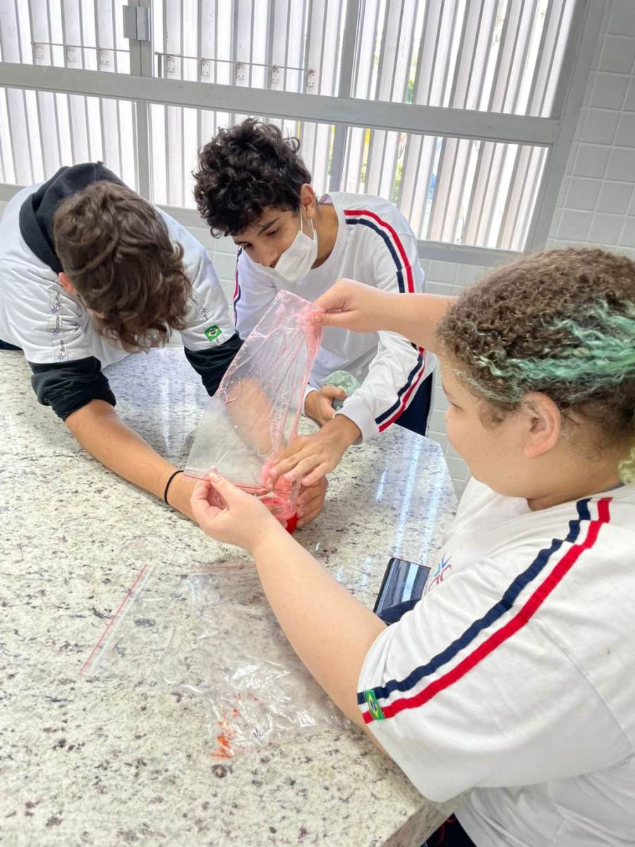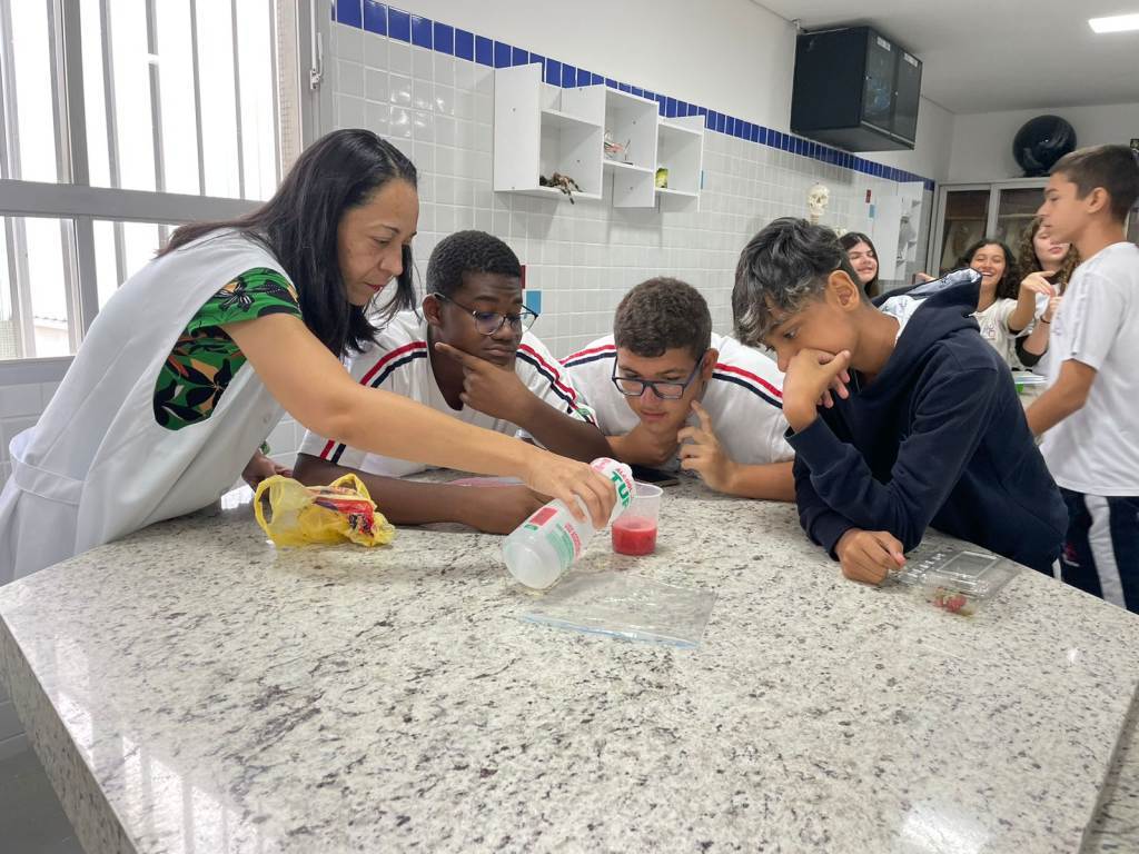 Aula prática onde os alunos do 9º ano realizaram a extração do DNA das células do morango utilizando uma solução extratora, capaz de quebrar a parede celular e as membranas, liberando assim o DNA contido no núcleo.