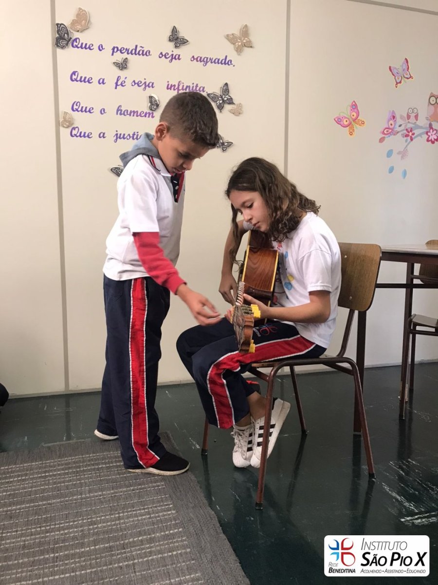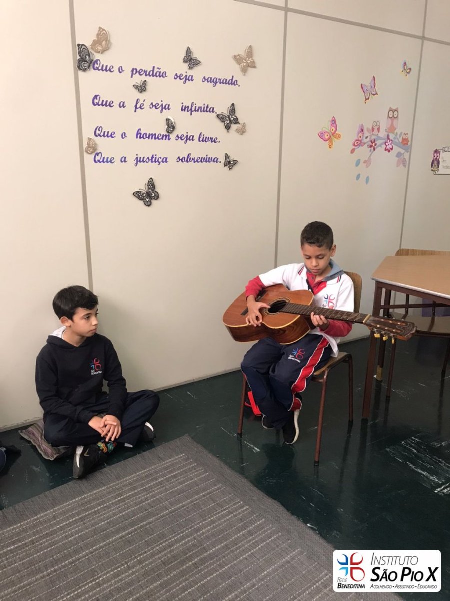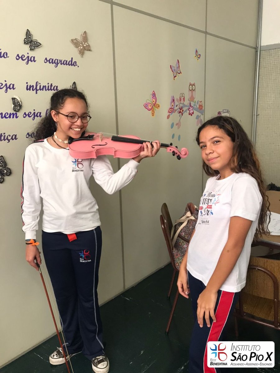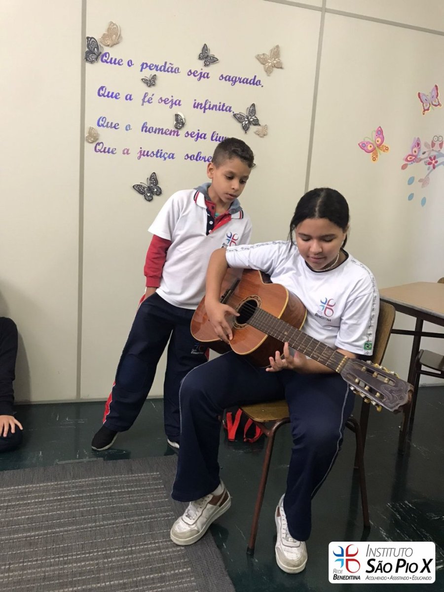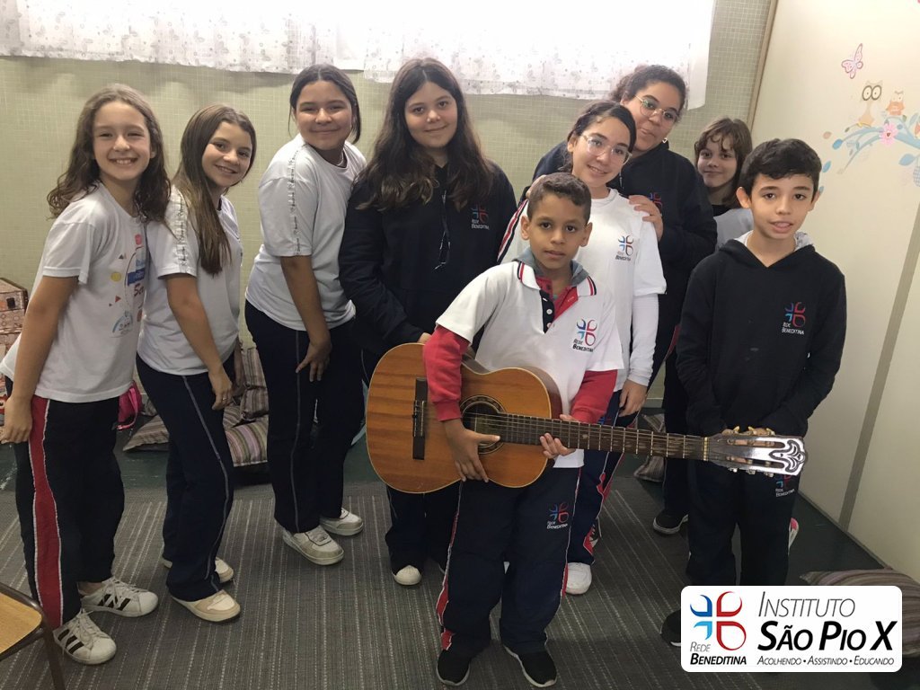 A turma do 6º ano A e B encerrou o 1º semestre com música. Livremente os alunos poderiam trazer algum instrumento para esta última aula de Ensino Religioso.