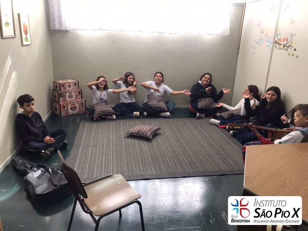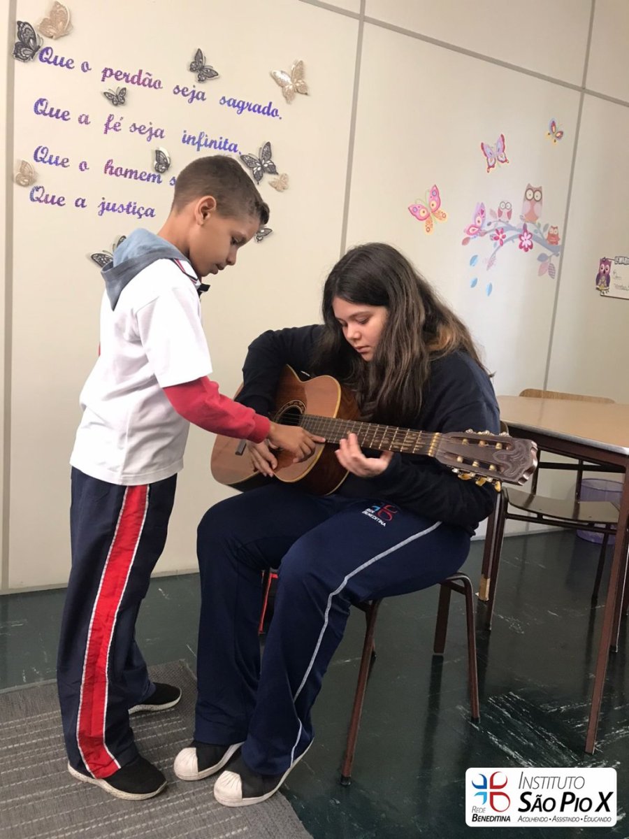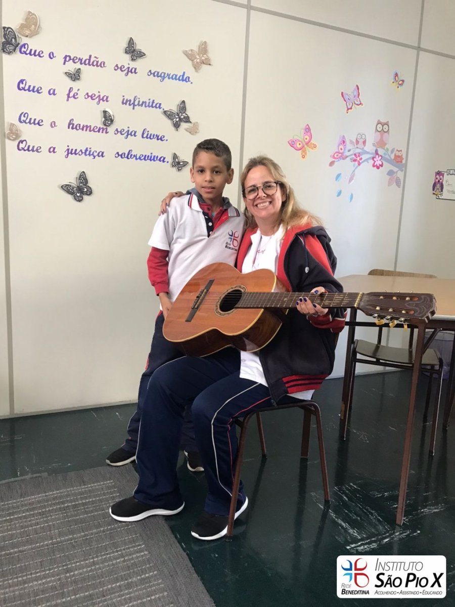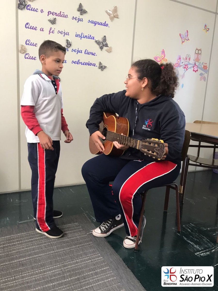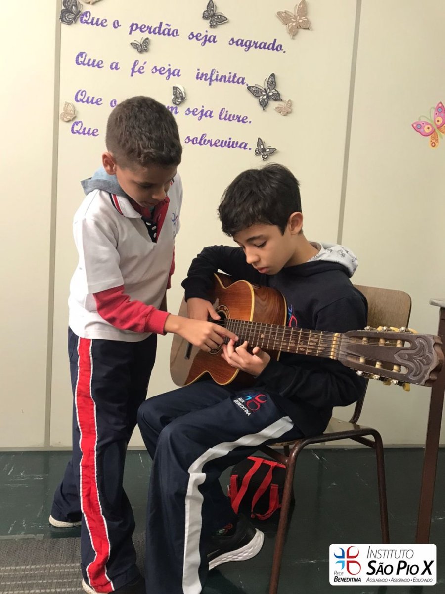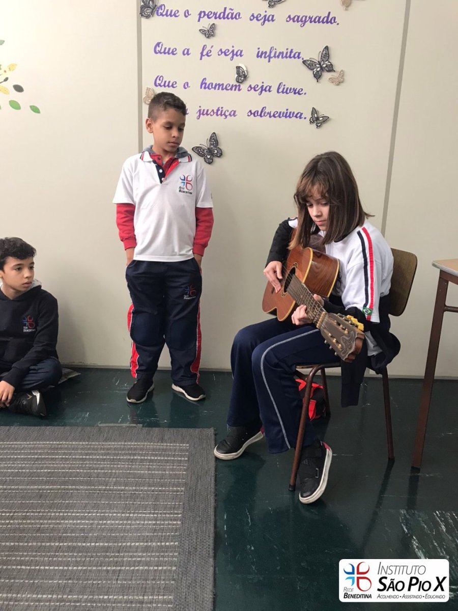 A turma do 6º ano A e B encerrou o 1º semestre com música. Livremente os alunos poderiam trazer algum instrumento para esta última aula de Ensino Religioso.