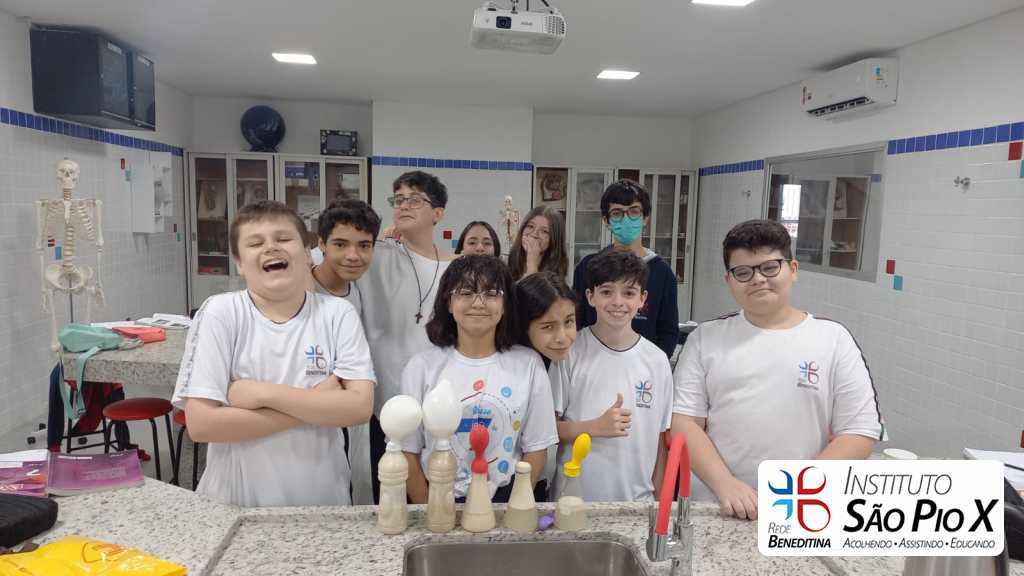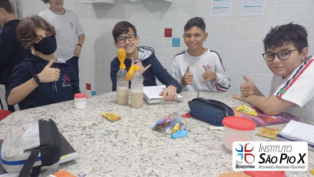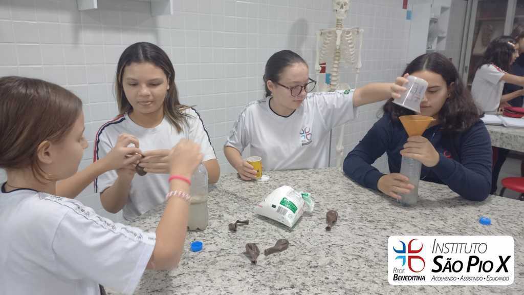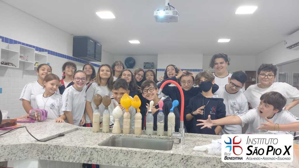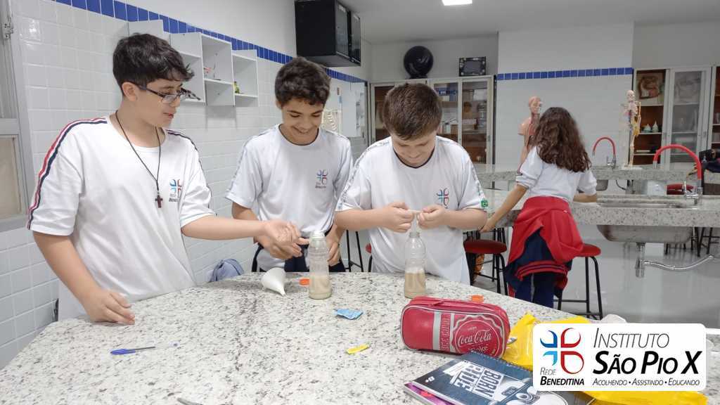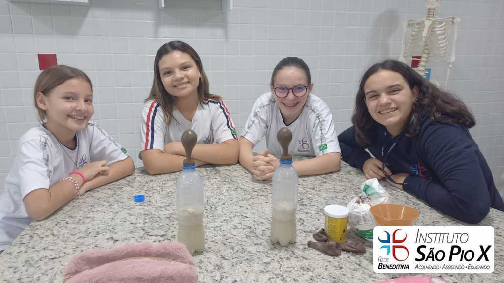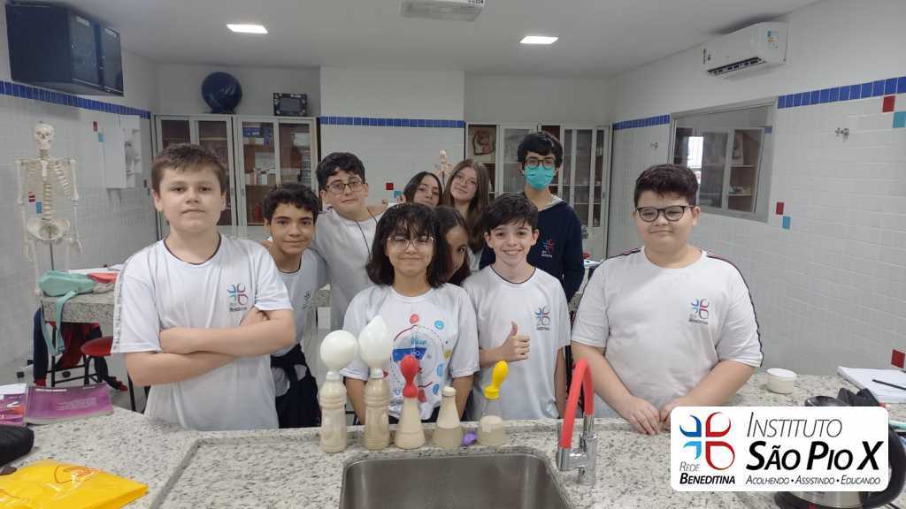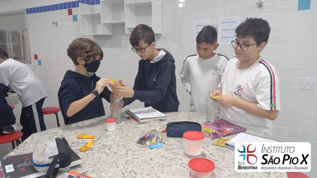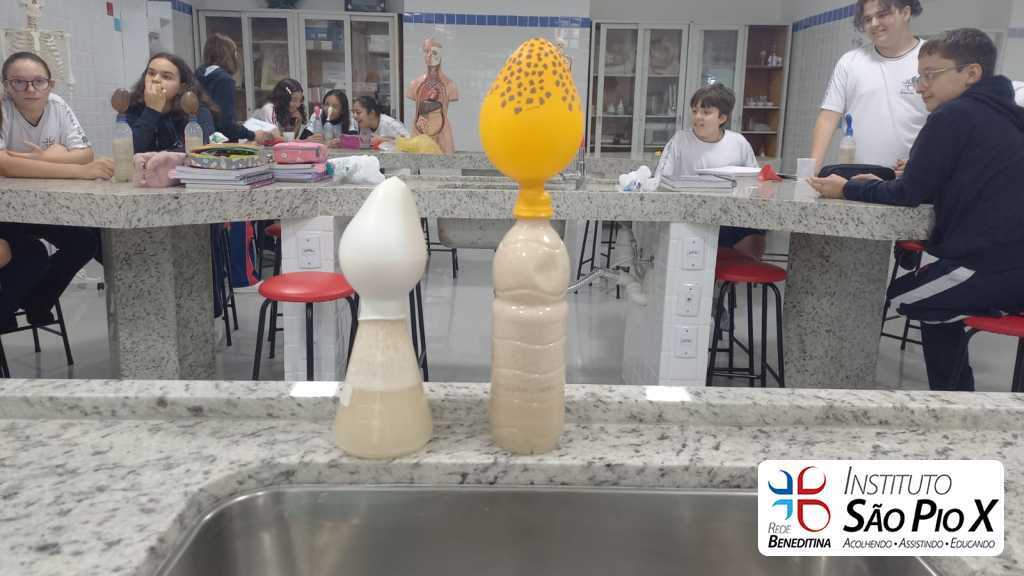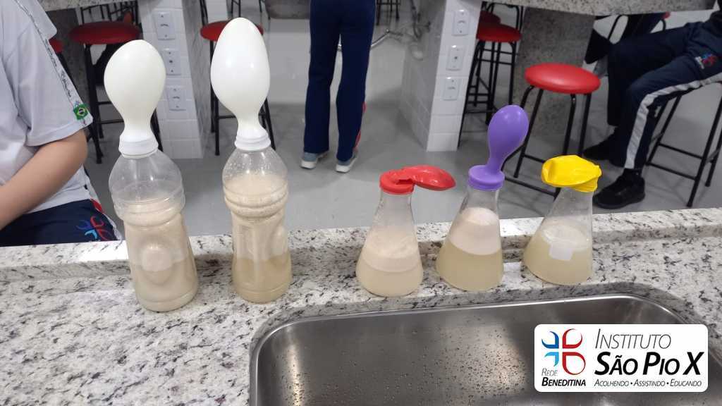 Durante a aula prática sobre fermentação alcoólica os alunos do 7° ano A e 7° ano B puderam observar a capacidade de leveduras liberarem gás carbônico e álcool durante a fermentação.