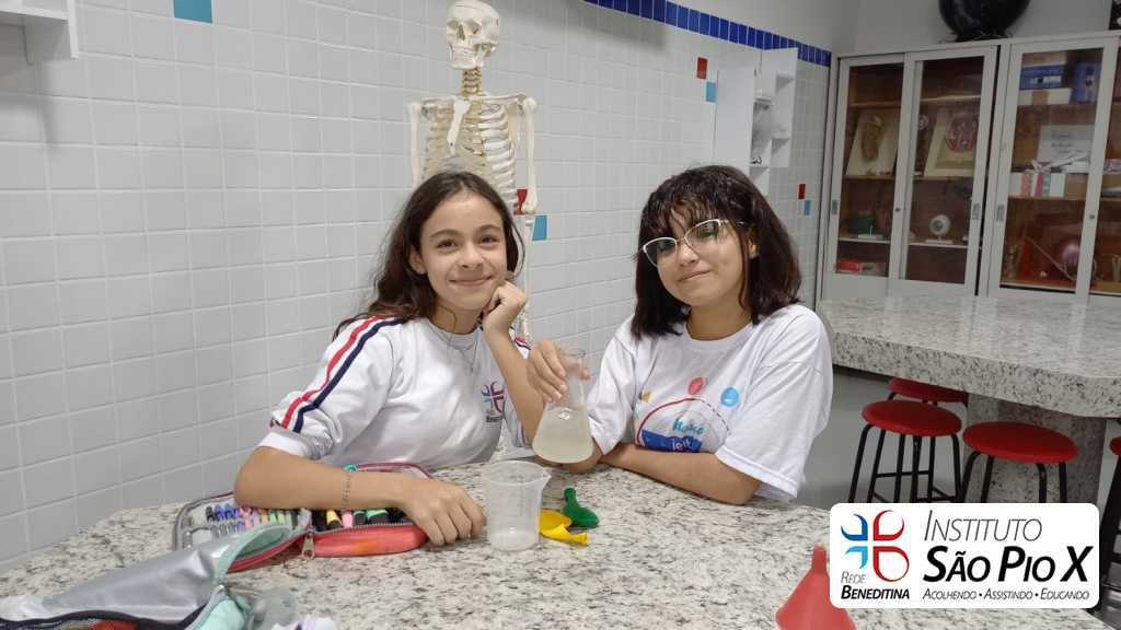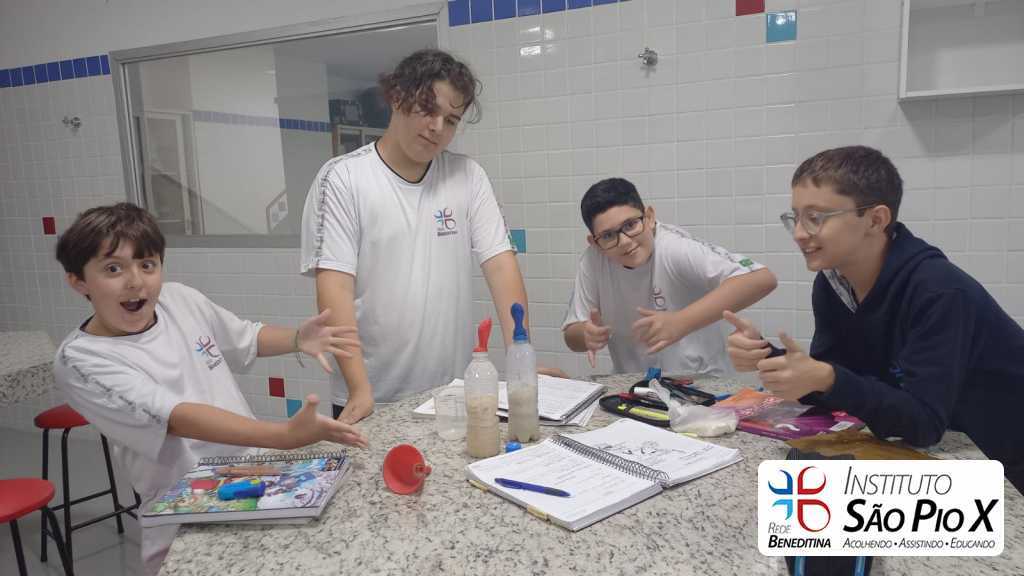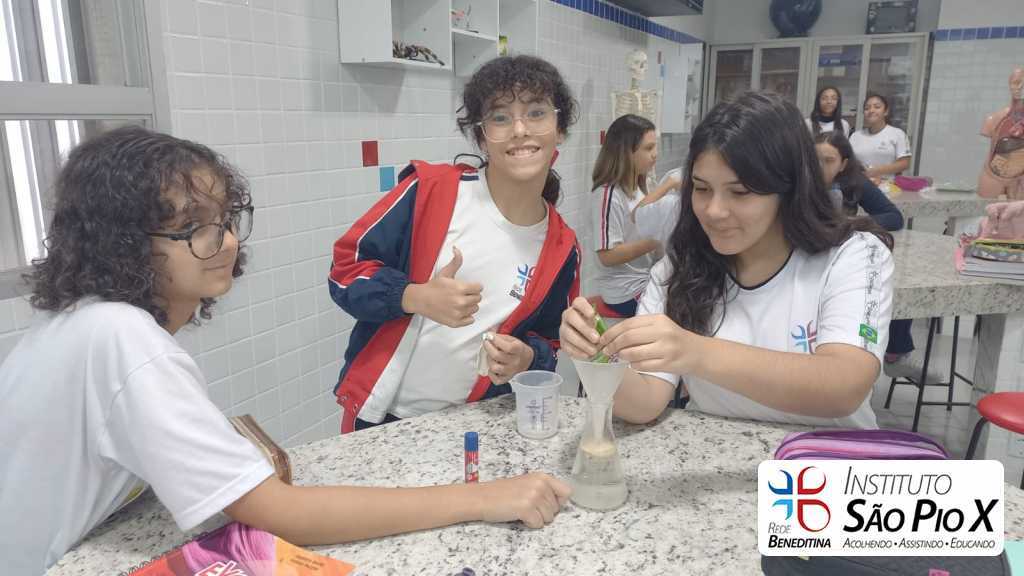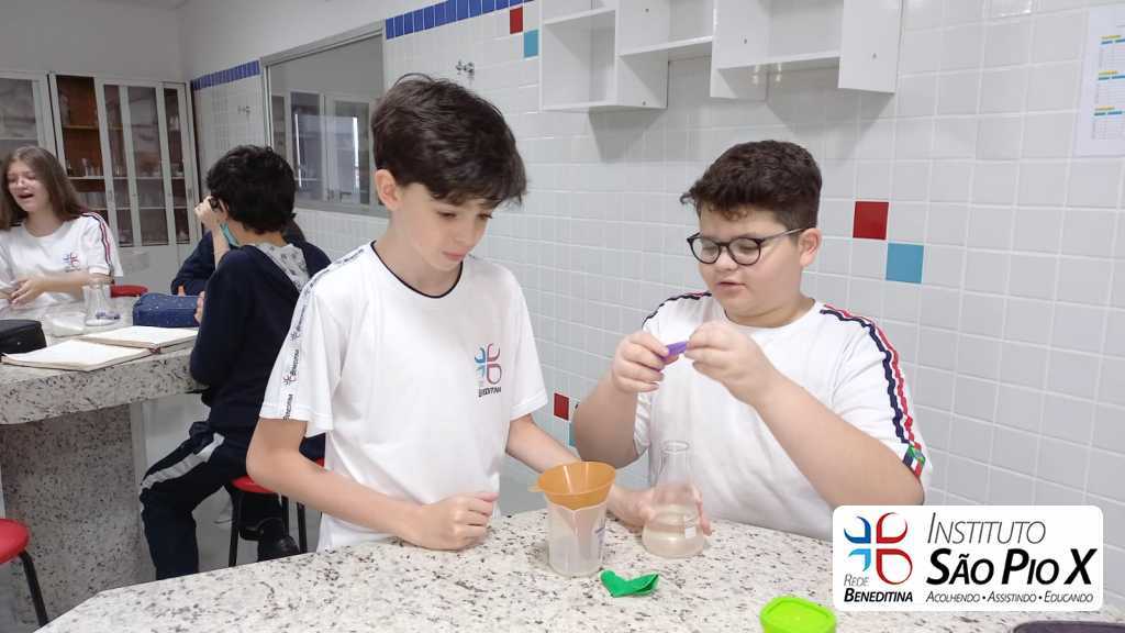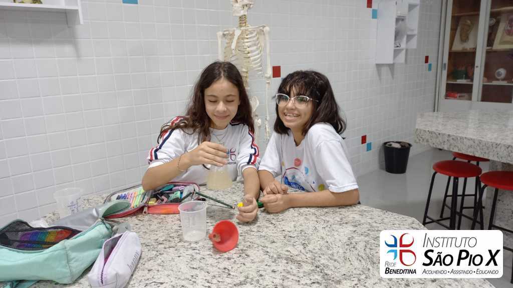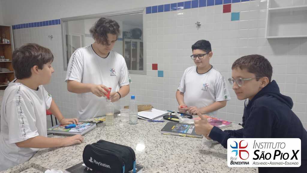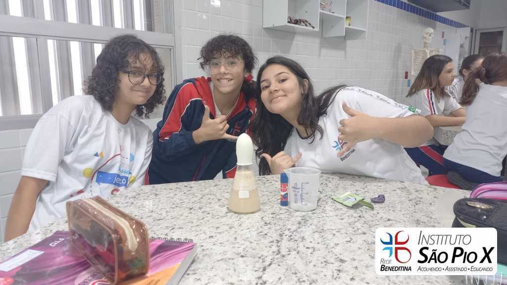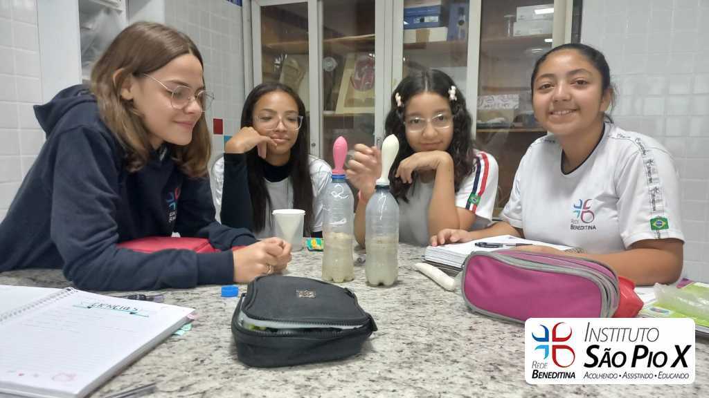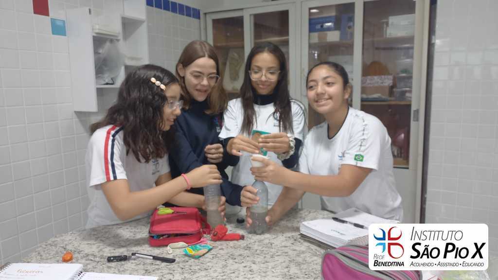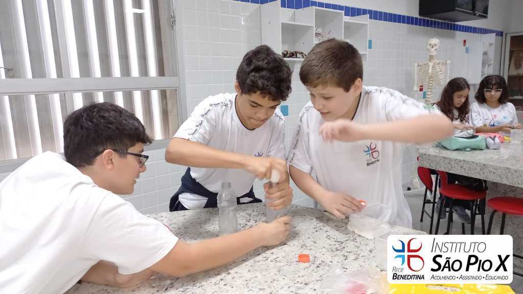 Durante a aula prática sobre fermentação alcoólica os alunos do 7° ano A e 7° ano B puderam observar a capacidade de leveduras liberarem gás carbônico e álcool durante a fermentação.
