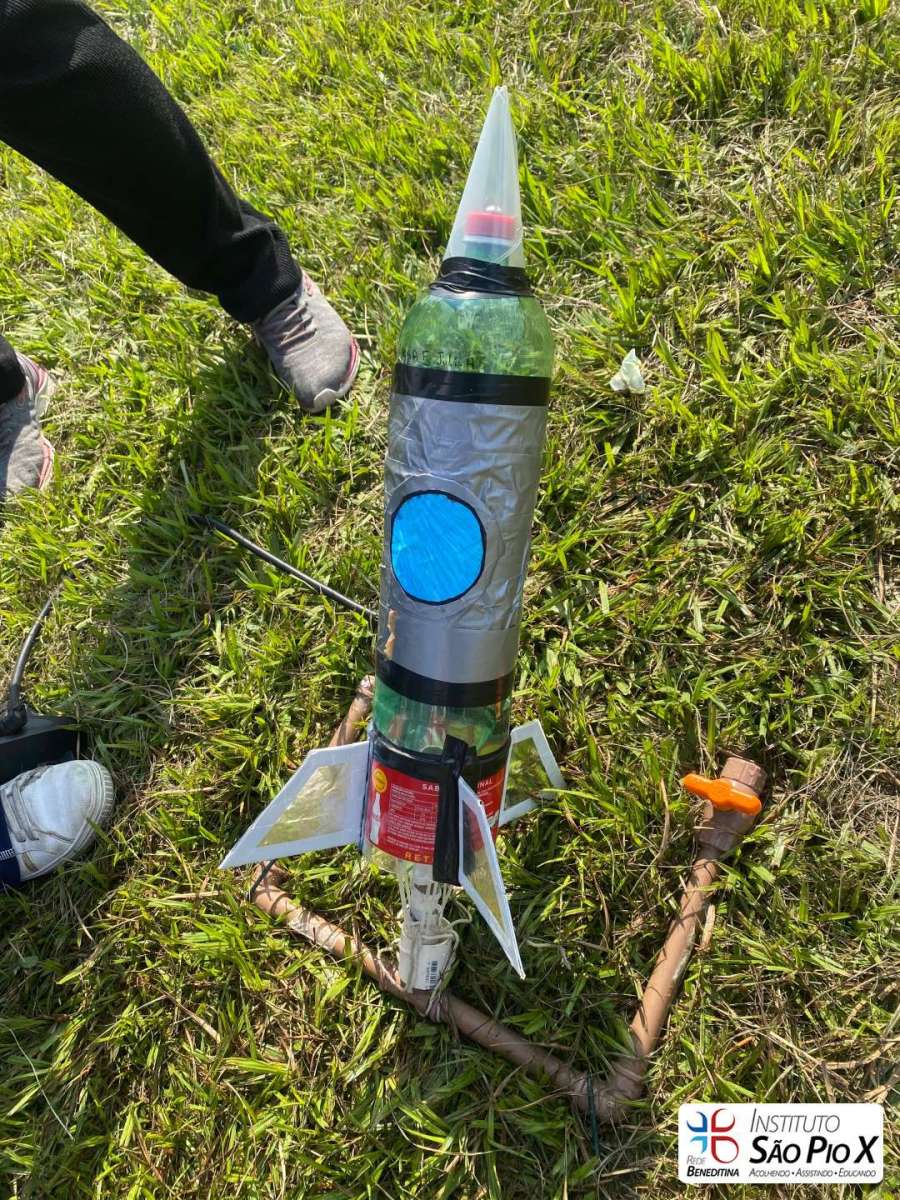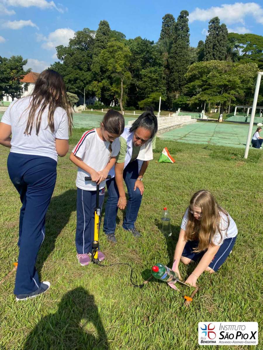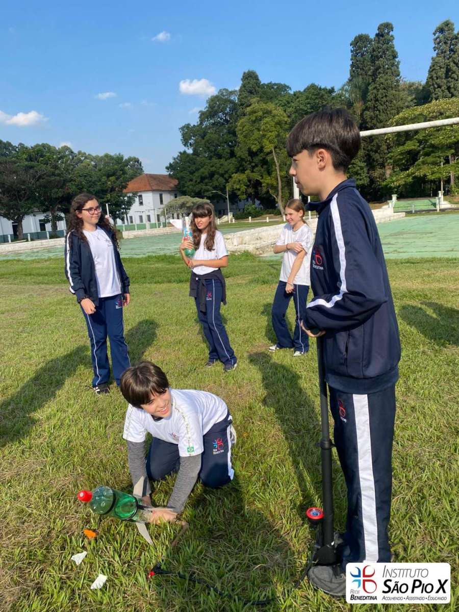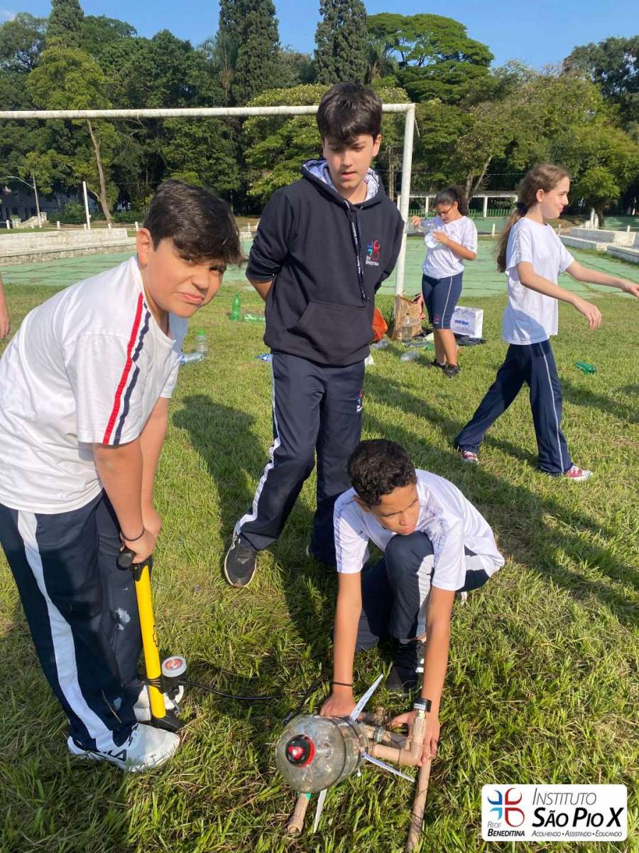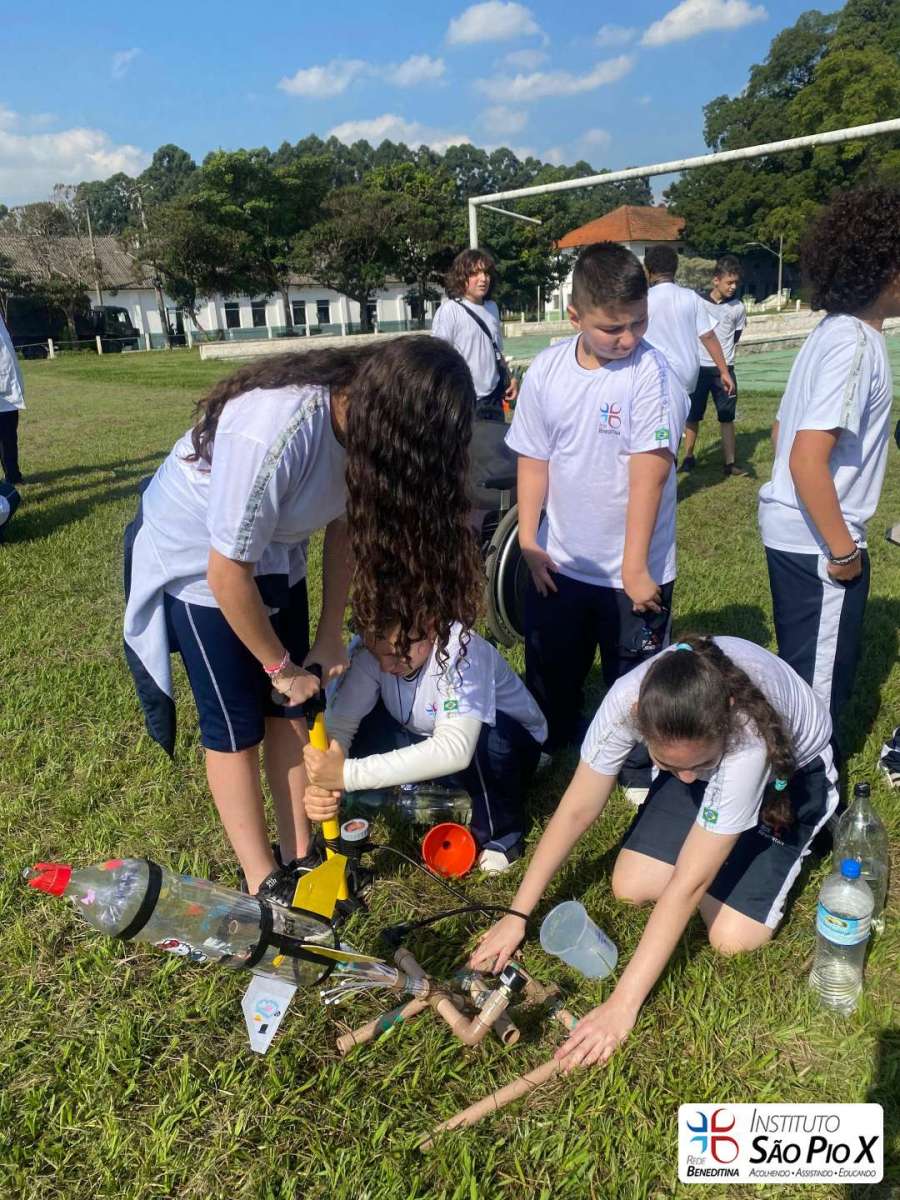 Durante o evento, realizaram o lançamento de foguetes feitos com garrafa PET, em estágio único (nível 3), utilizando ar comprimido e água como propulsores.