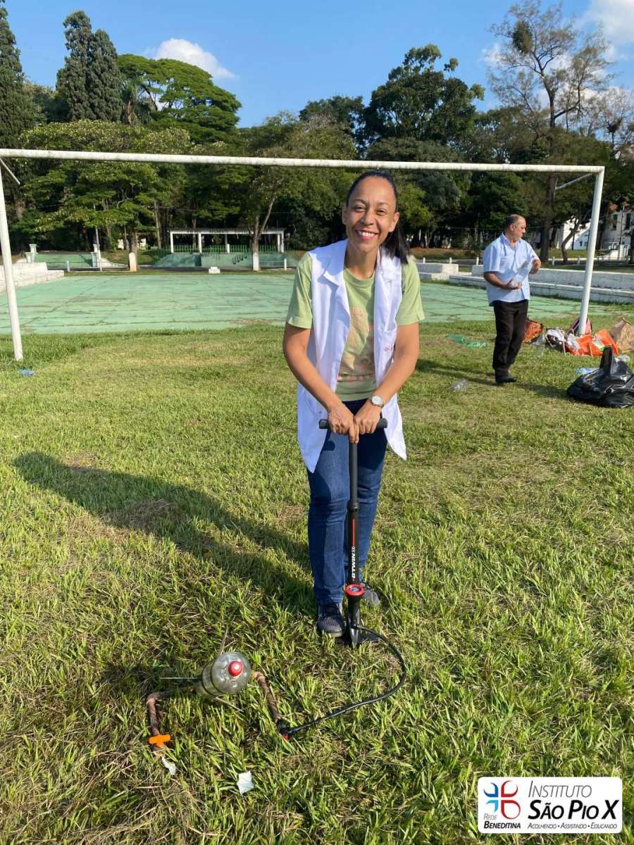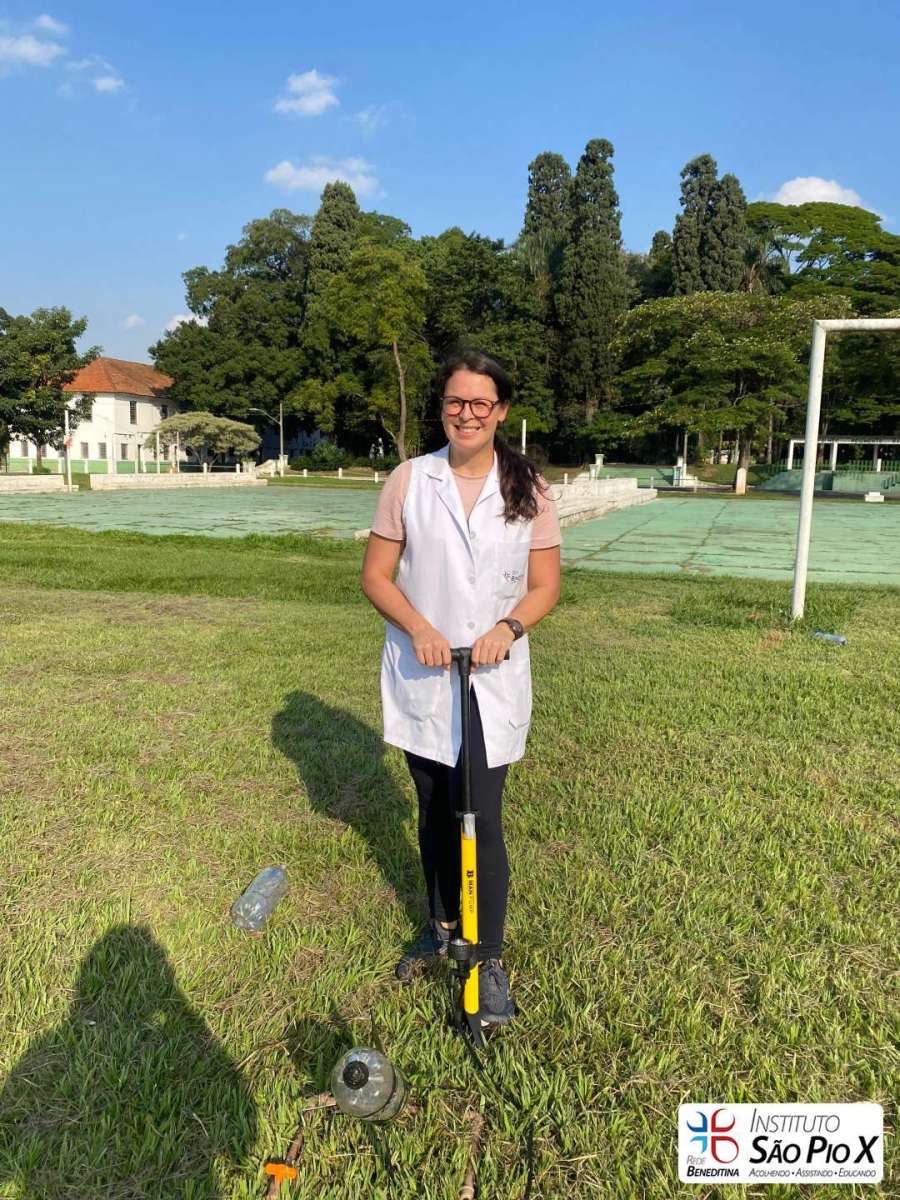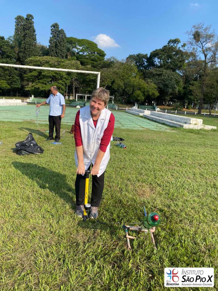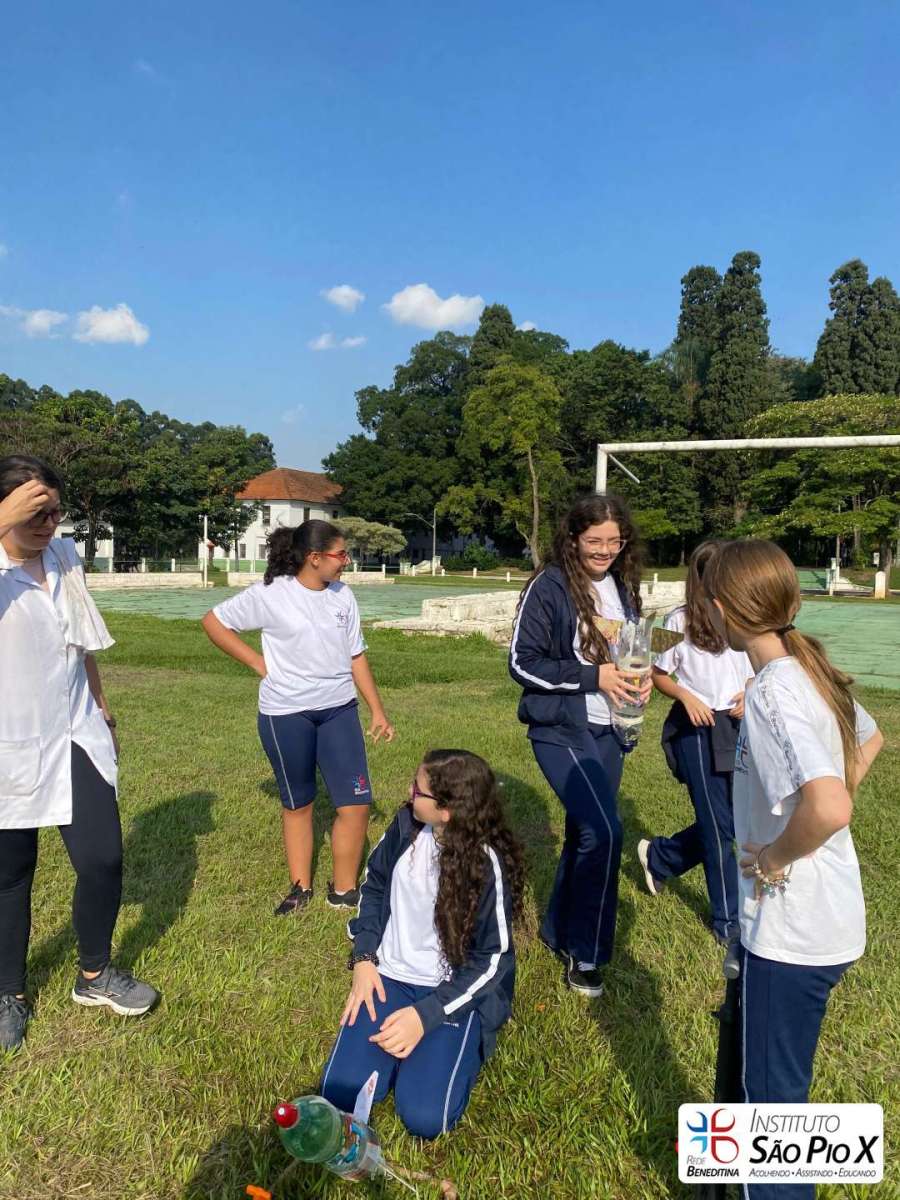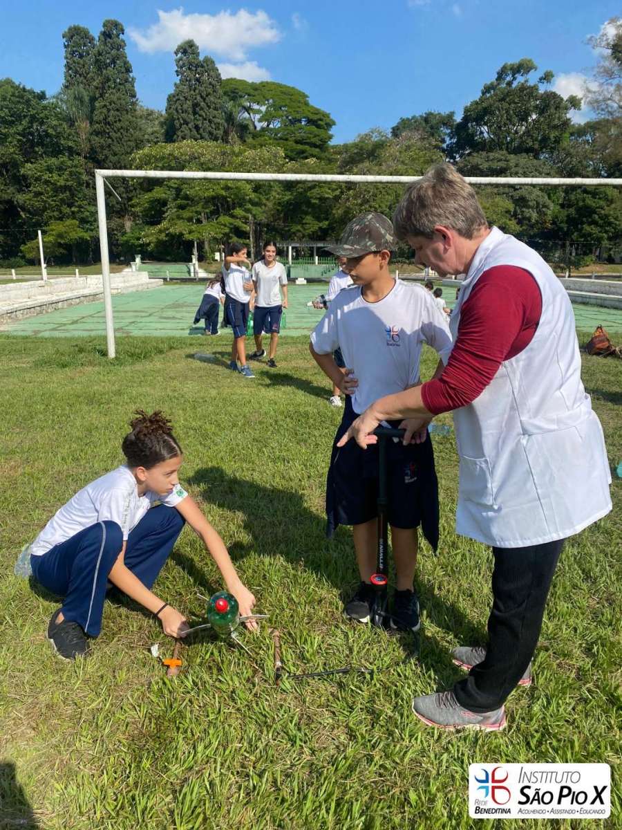 Durante o evento, realizaram o lançamento de foguetes feitos com garrafa PET, em estágio único (nível 3), utilizando ar comprimido e água como propulsores.