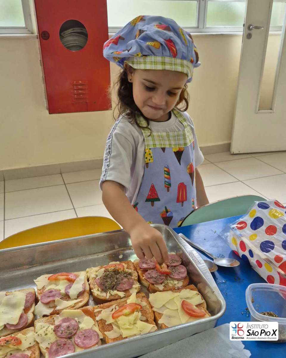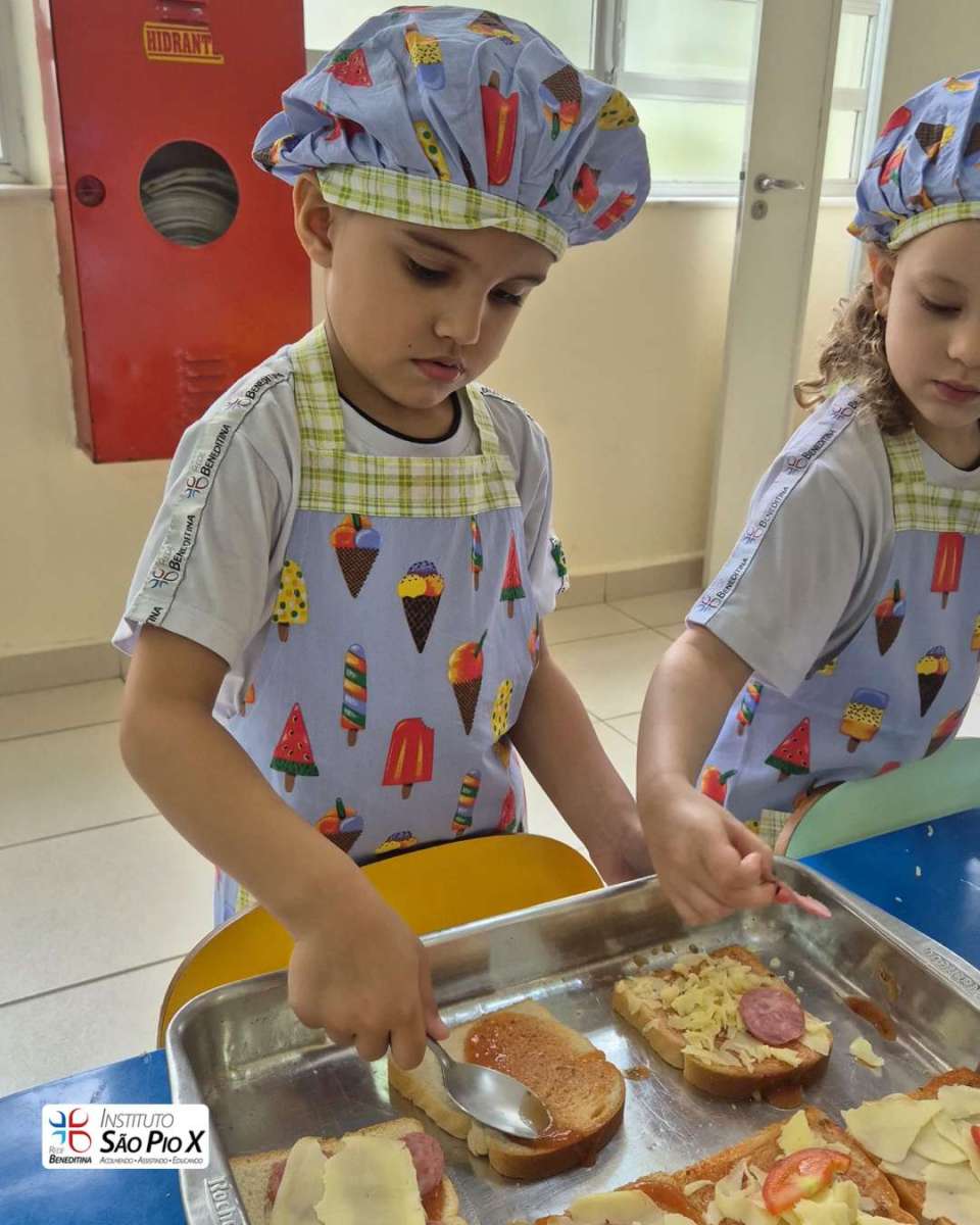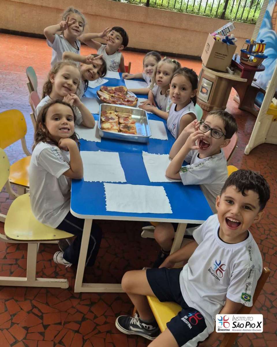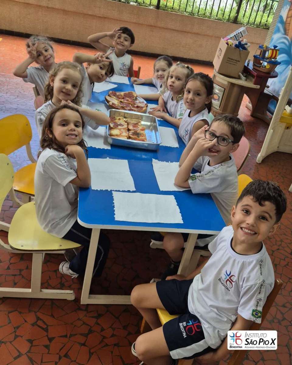 Cada criança montou a sua, escolhendo os ingredientes e participando de todo o processo. Depois, levamos ao forno e chegou a melhor parte: experimentar o que preparamos!