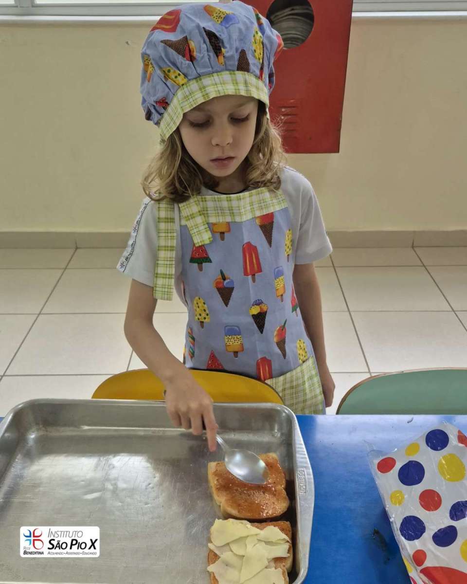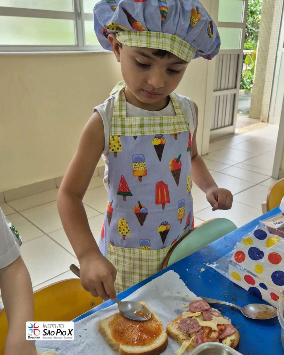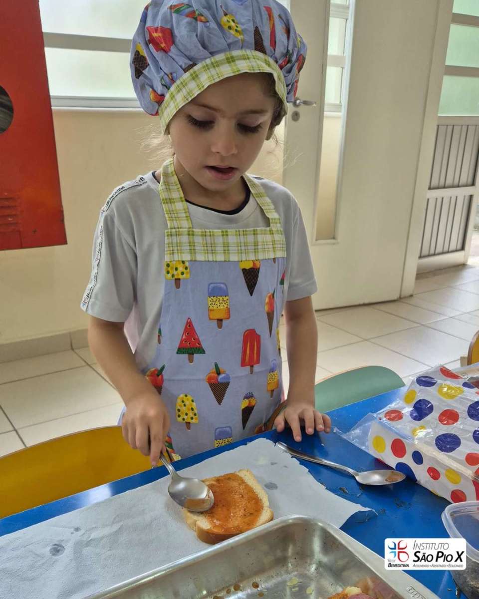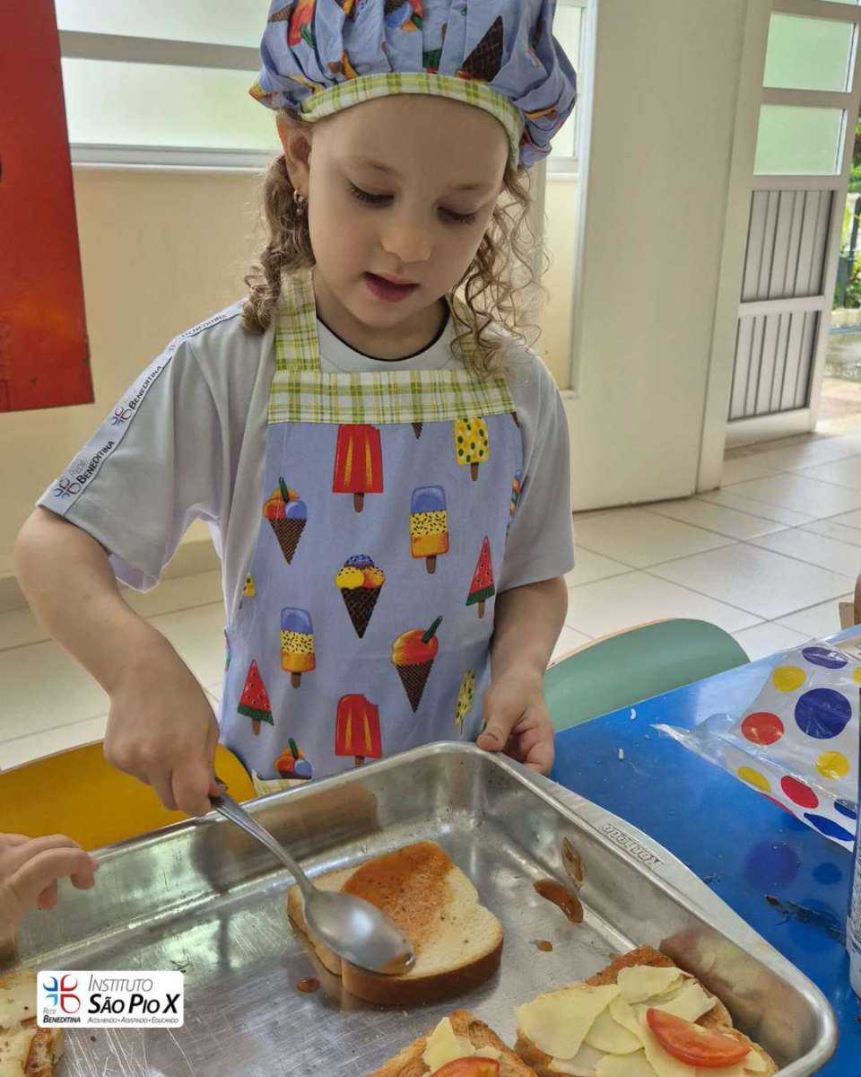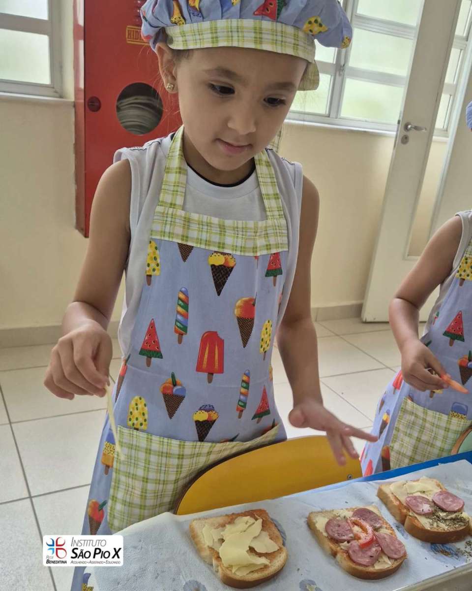 Cada criança montou a sua, escolhendo os ingredientes e participando de todo o processo. Depois, levamos ao forno e chegou a melhor parte: experimentar o que preparamos!