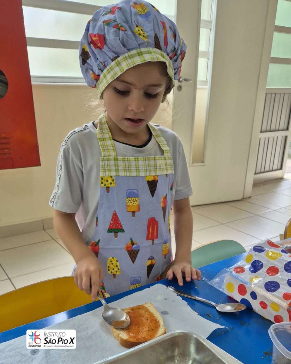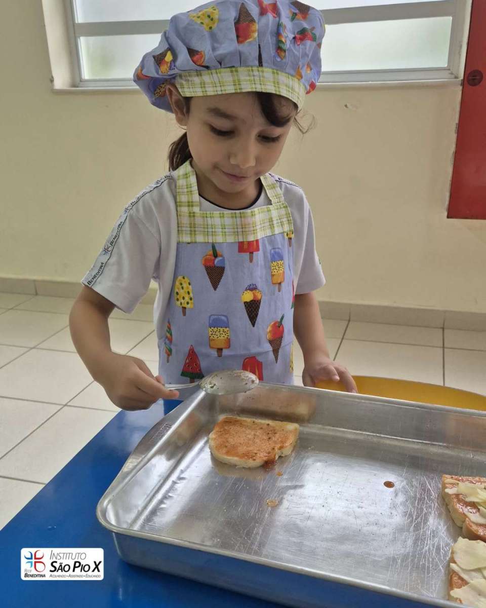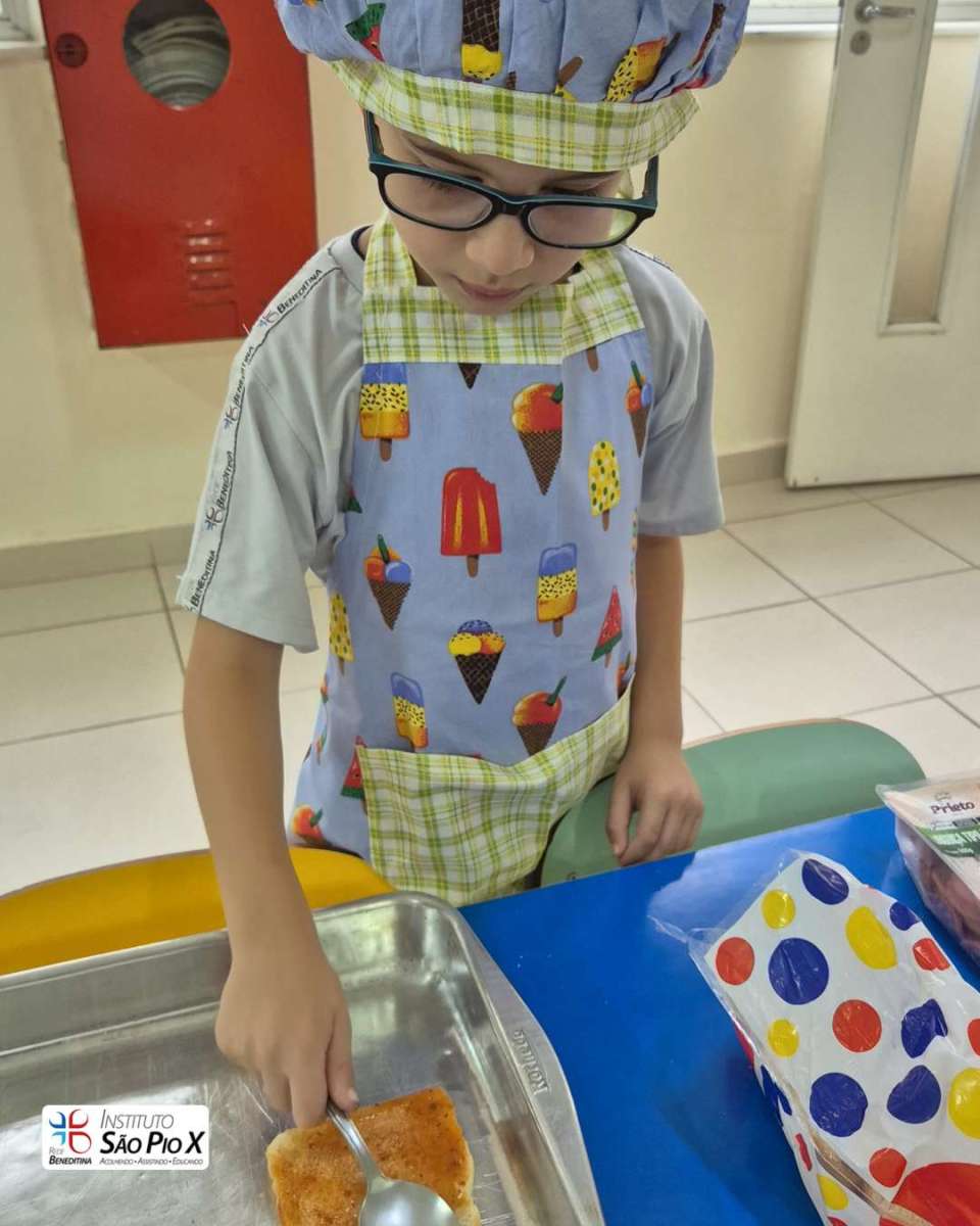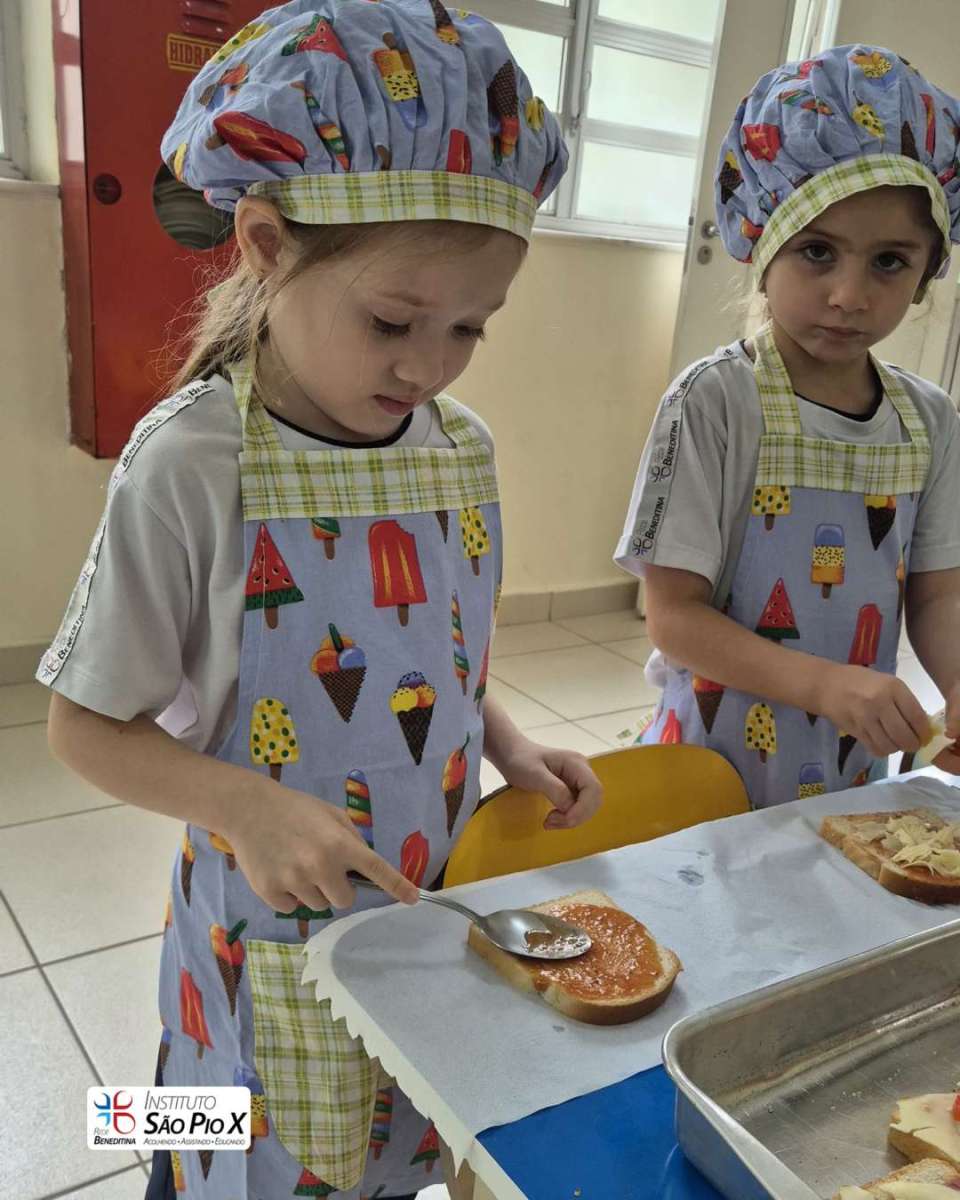 Cada criança montou a sua, escolhendo os ingredientes e participando de todo o processo. Depois, levamos ao forno e chegou a melhor parte: experimentar o que preparamos!