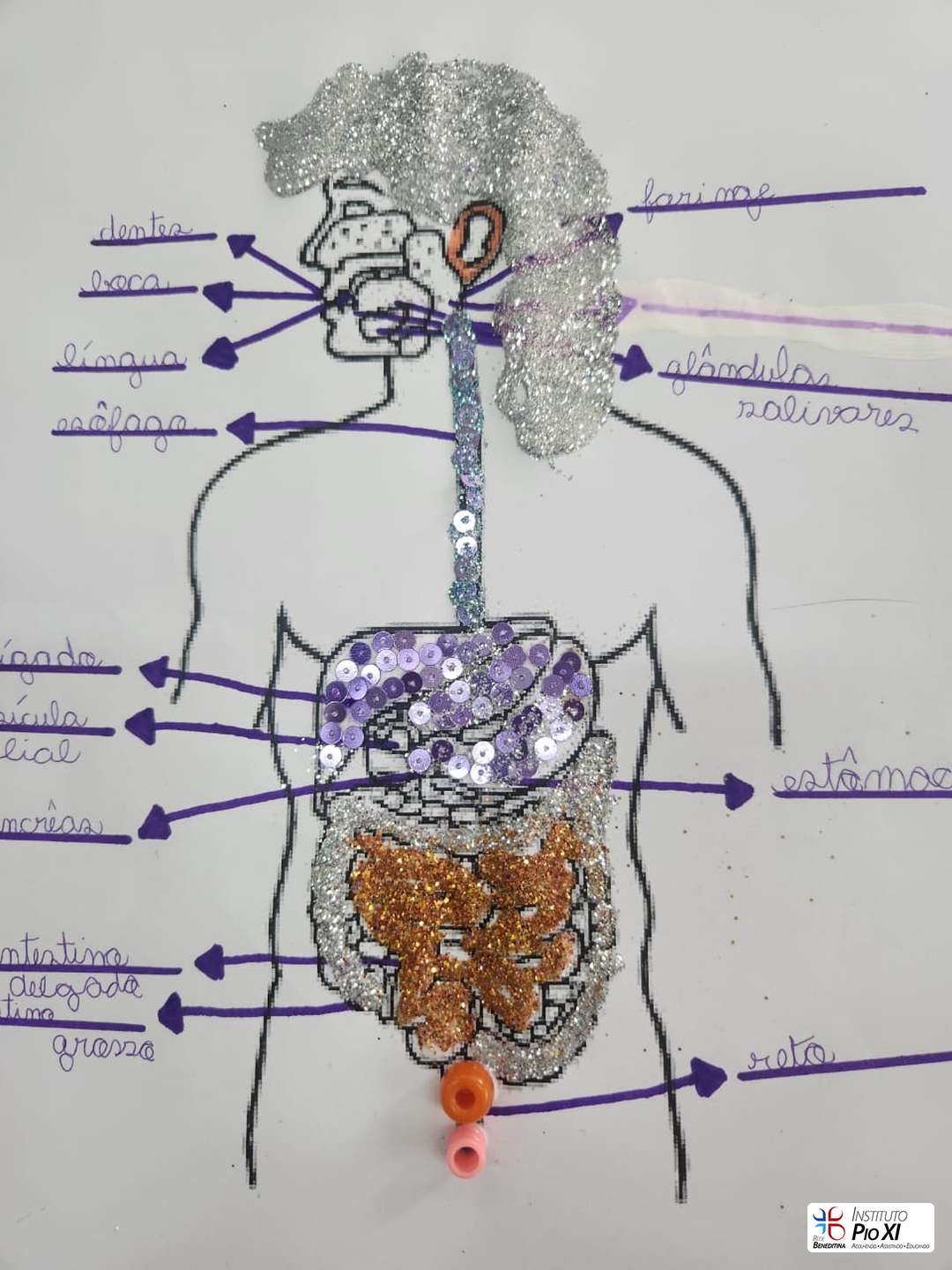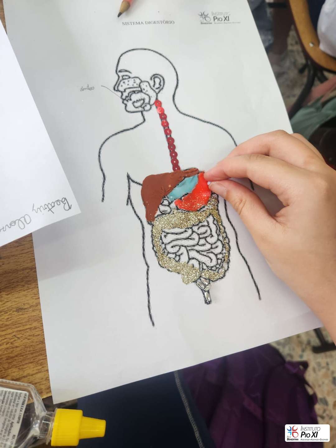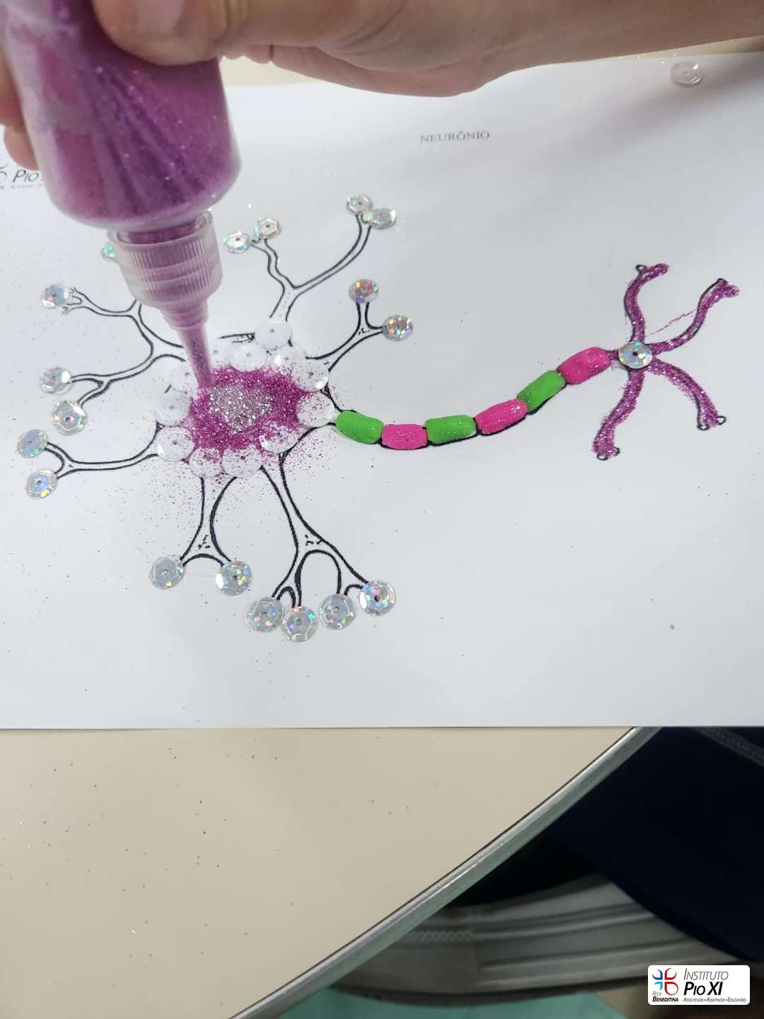Na aula de Ciências do 6º ano, os alunos representaram em alto relevo o sistema digestório, o sistema urinário e o neurônio do sistema nervoso usando massinha de modelar, purpurina, lantejoulas, miçangas, lápis de cor e canetinha.