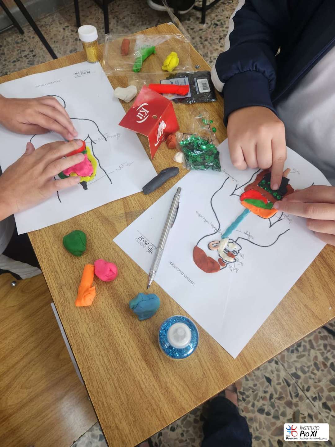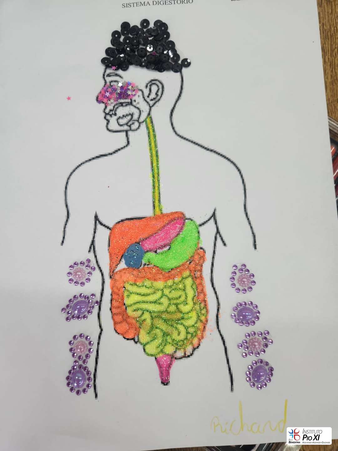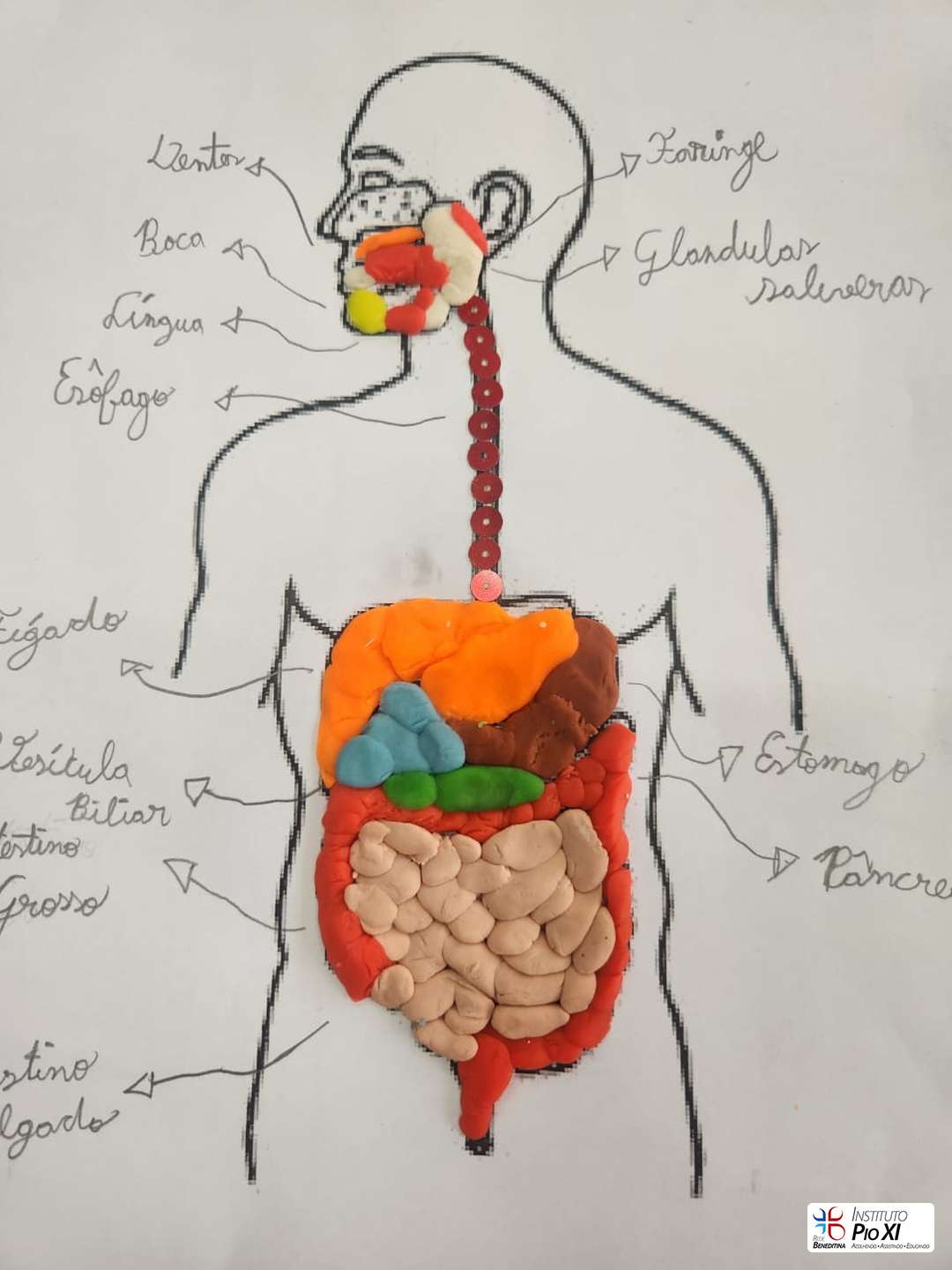 Na aula de Ciências do 6º ano, os alunos representaram em alto relevo o sistema digestório, o sistema urinário e o neurônio do sistema nervoso usando massinha de modelar, purpurina, lantejoulas, miçangas, lápis de cor e canetinha.