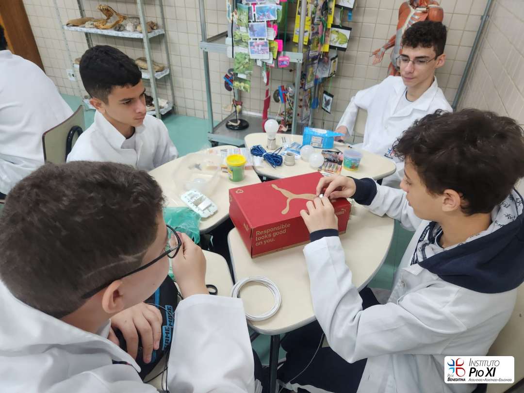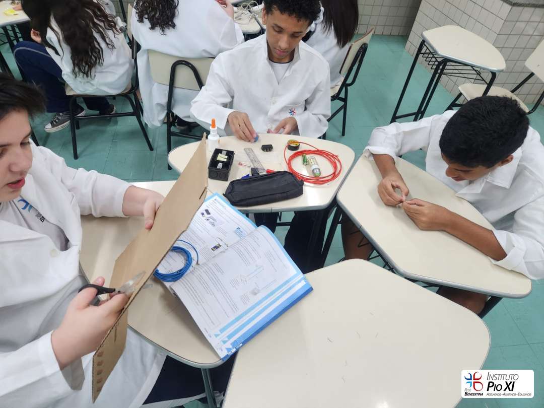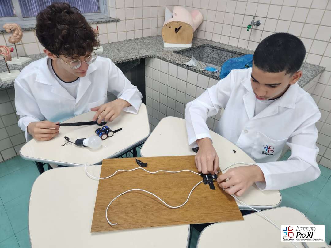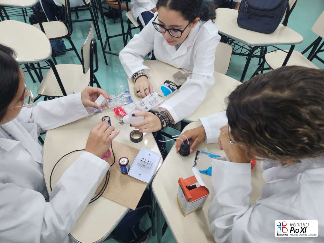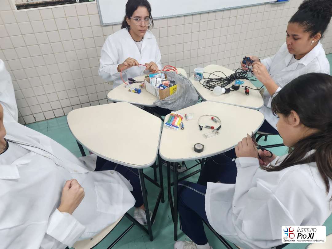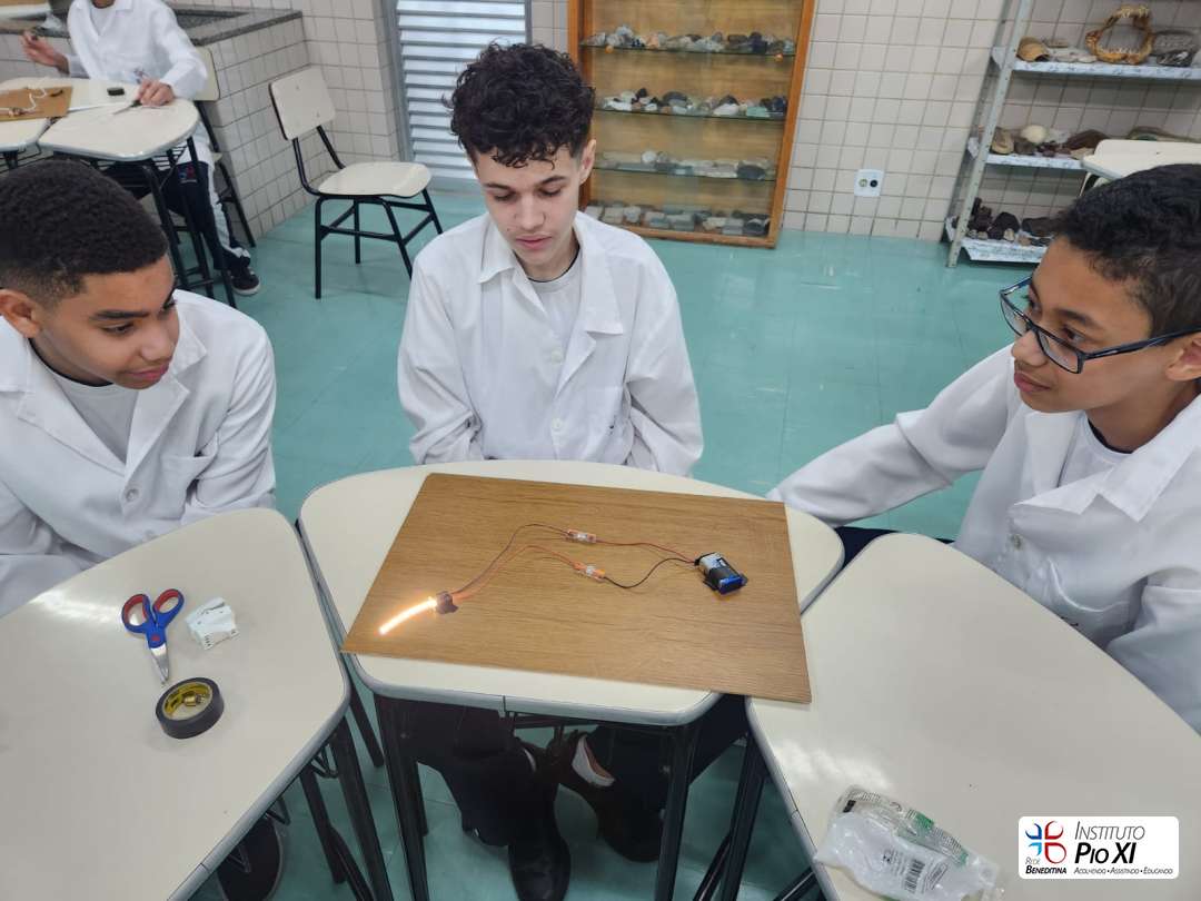 Na prática de Ciências, os alunos do 8º ano montaram circuitos elétricos simples com pilhas, fios e lâmpadas.