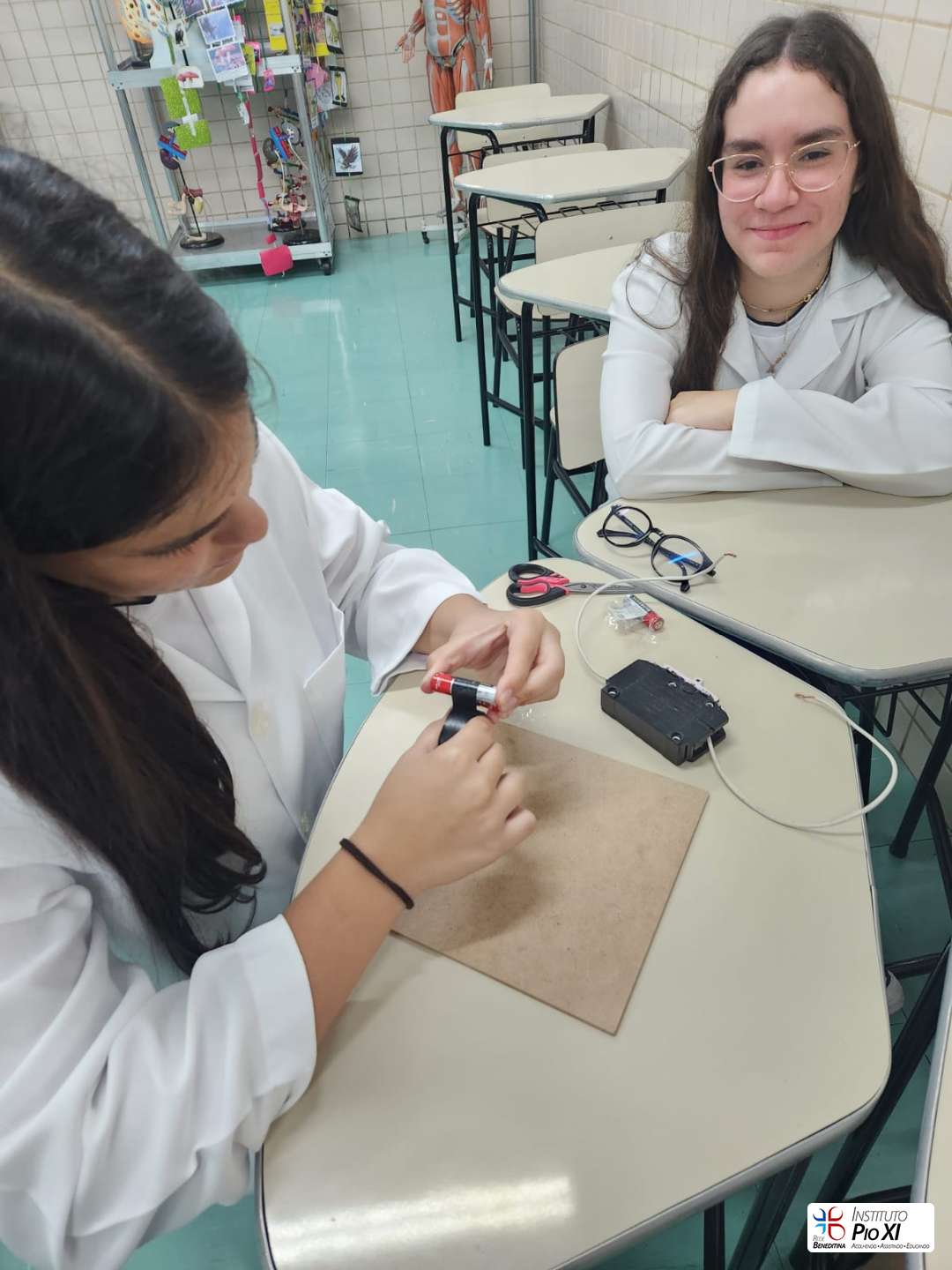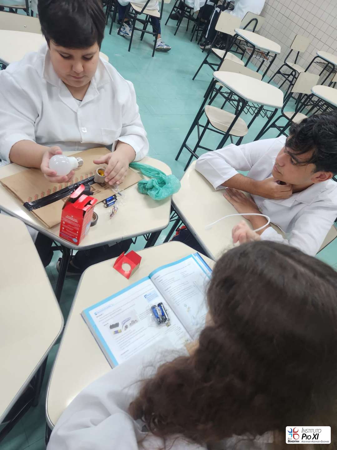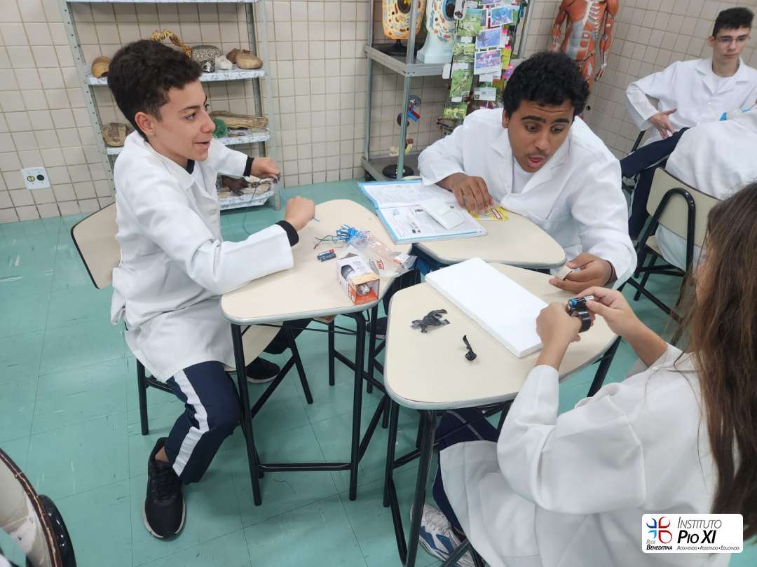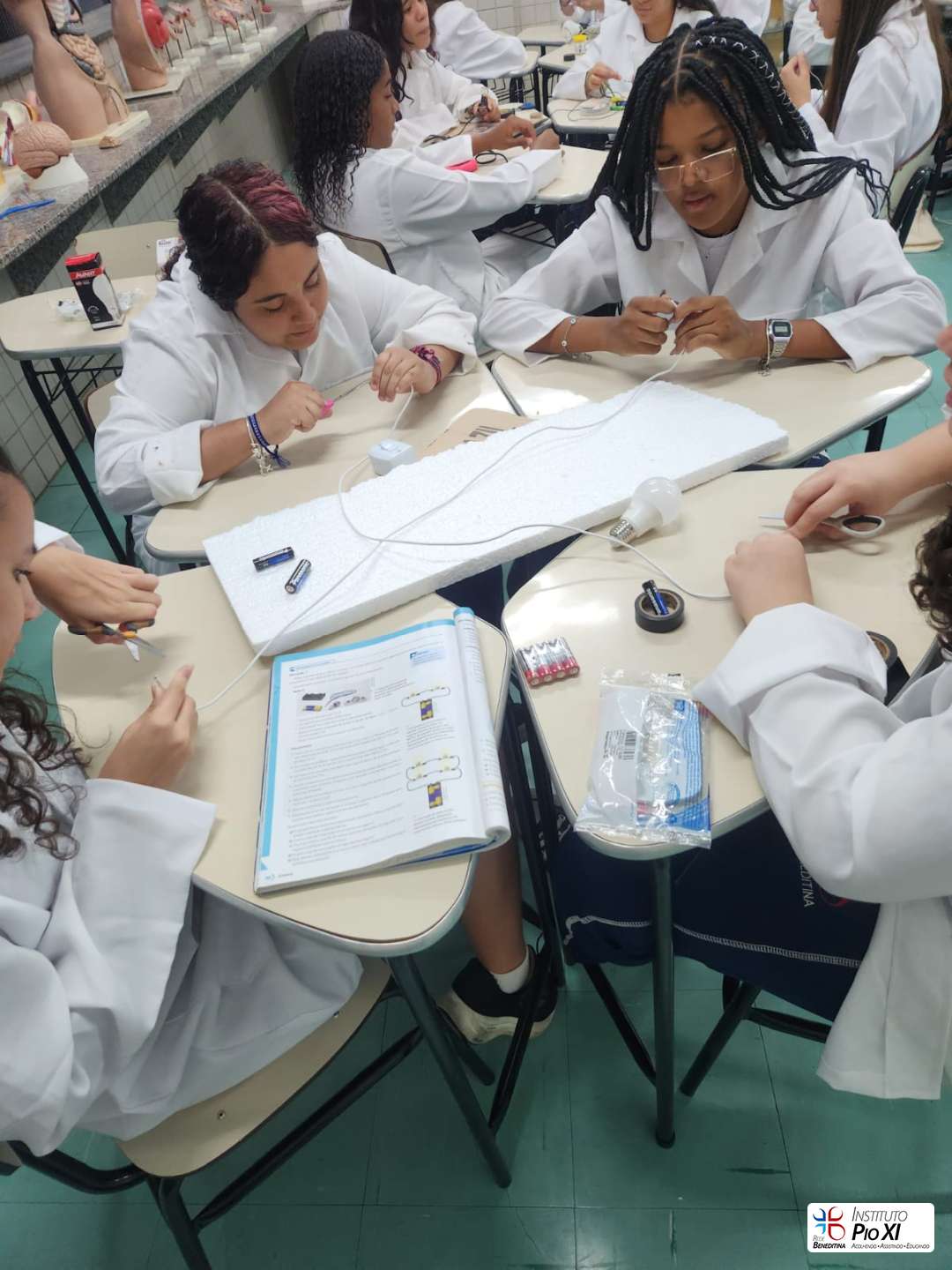 Na prática de Ciências, os alunos do 8º ano montaram circuitos elétricos simples com pilhas, fios e lâmpadas.