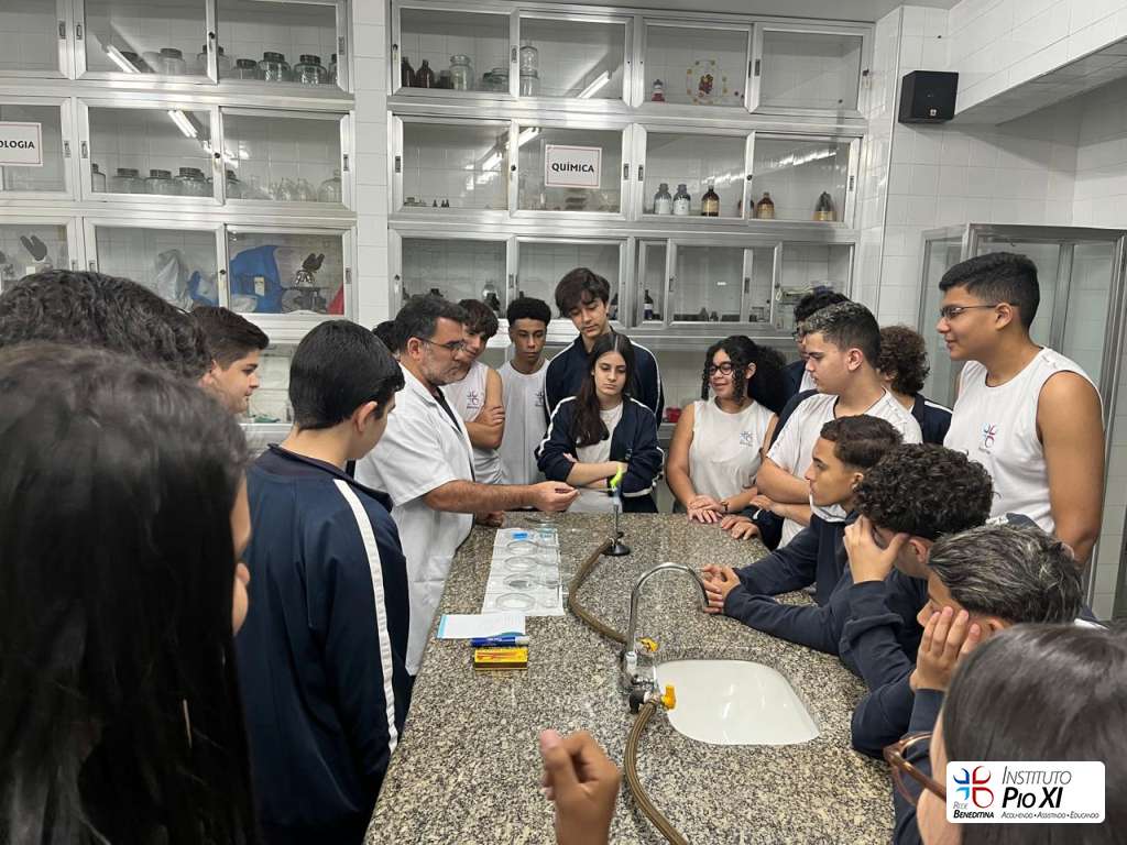 Neste momento, os estudantes apenas observaram as demonstrações, acompanhando atentamente cada experimento. É importante lembrar que, nas aulas práticas de laboratório, o uso do jaleco e da calça comprida estheré indispensável para garantir a segurança de todos.