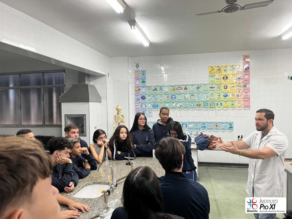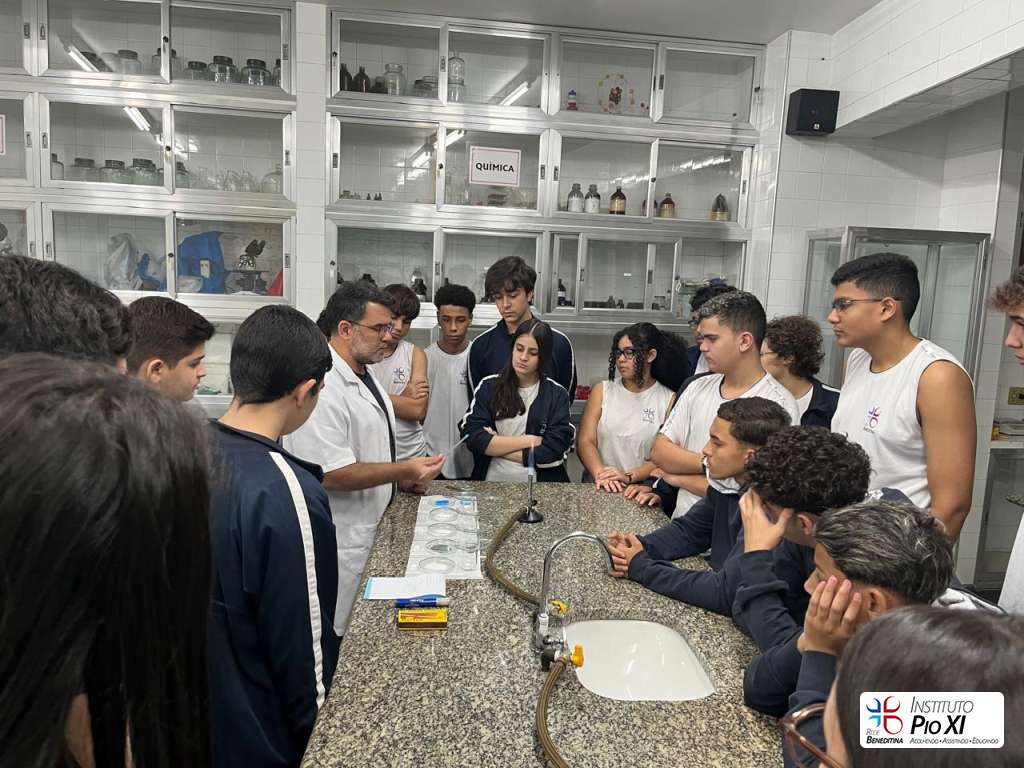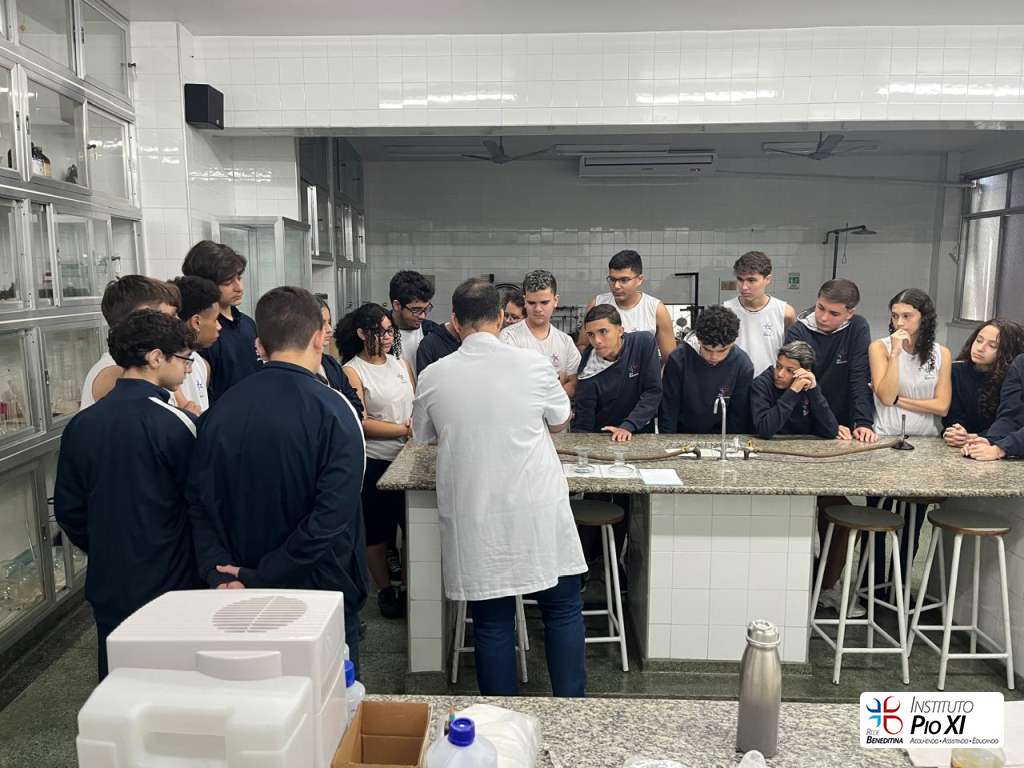 Neste momento, os estudantes apenas observaram as demonstrações, acompanhando atentamente cada experimento. É importante lembrar que, nas aulas práticas de laboratório, o uso do jaleco e da calça comprida estheré indispensável para garantir a segurança de todos.