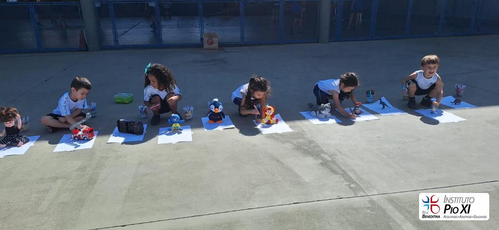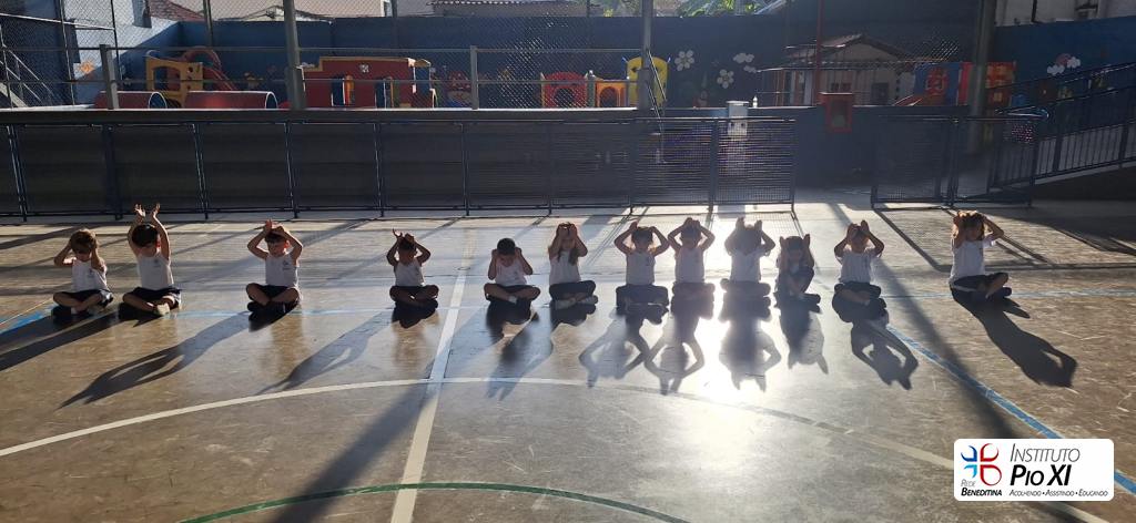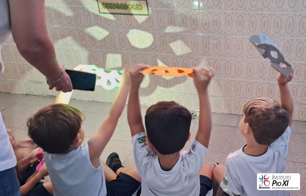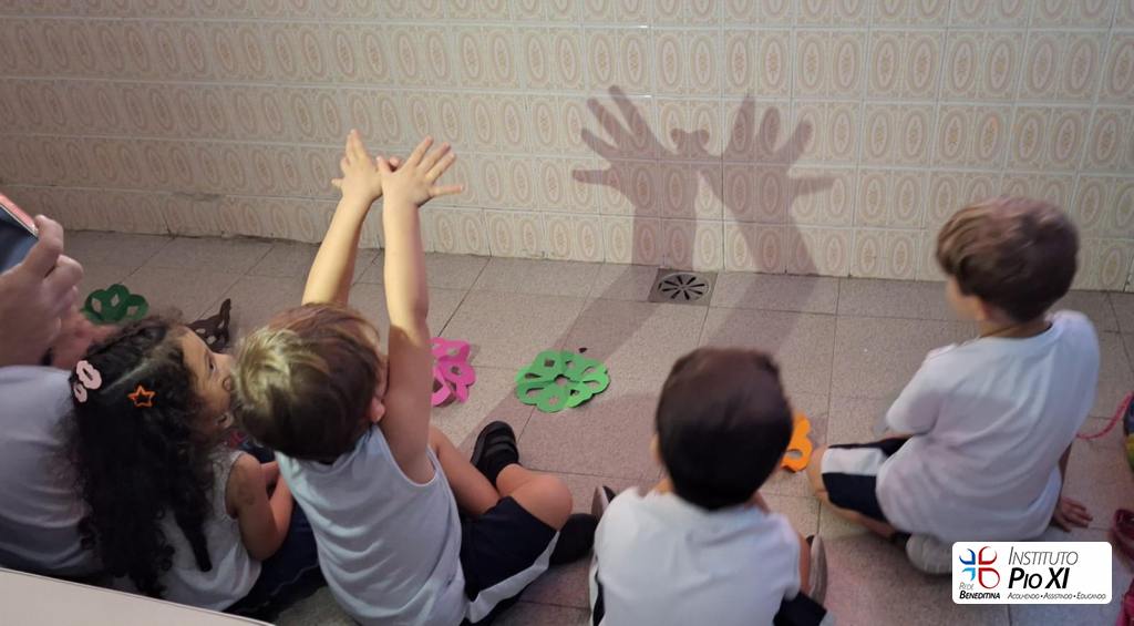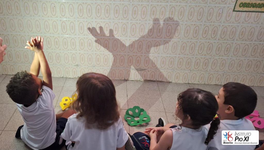 A turma do maternal 2, orientada pela professora Carla, explorou diversas formas de brincar com a sombra, desenvolvendo a imaginação, concentração, conceitos matemáticos.