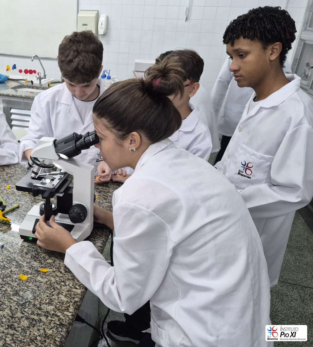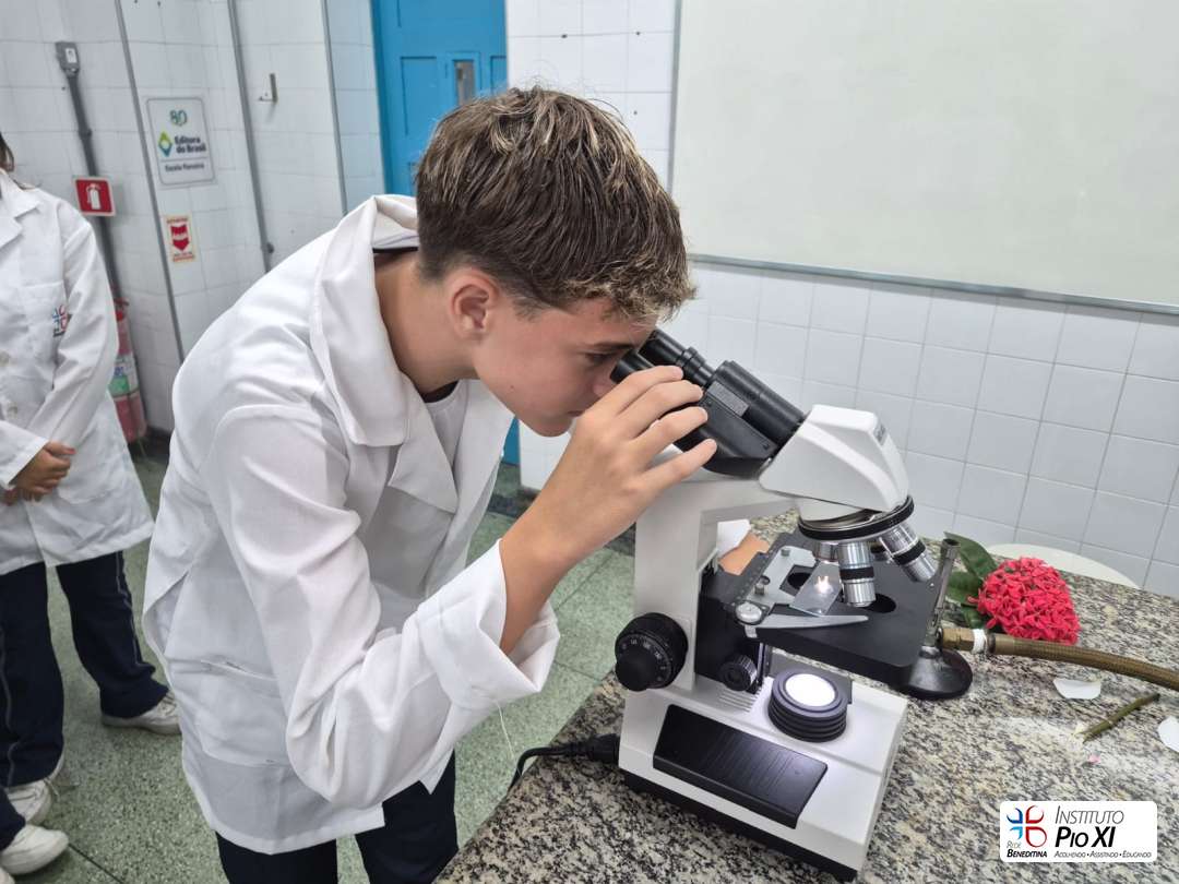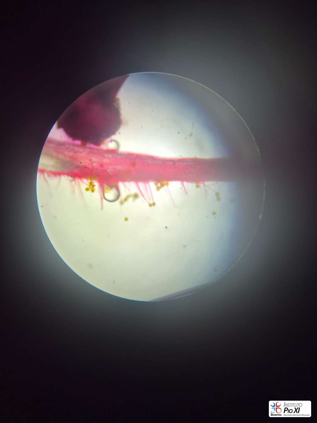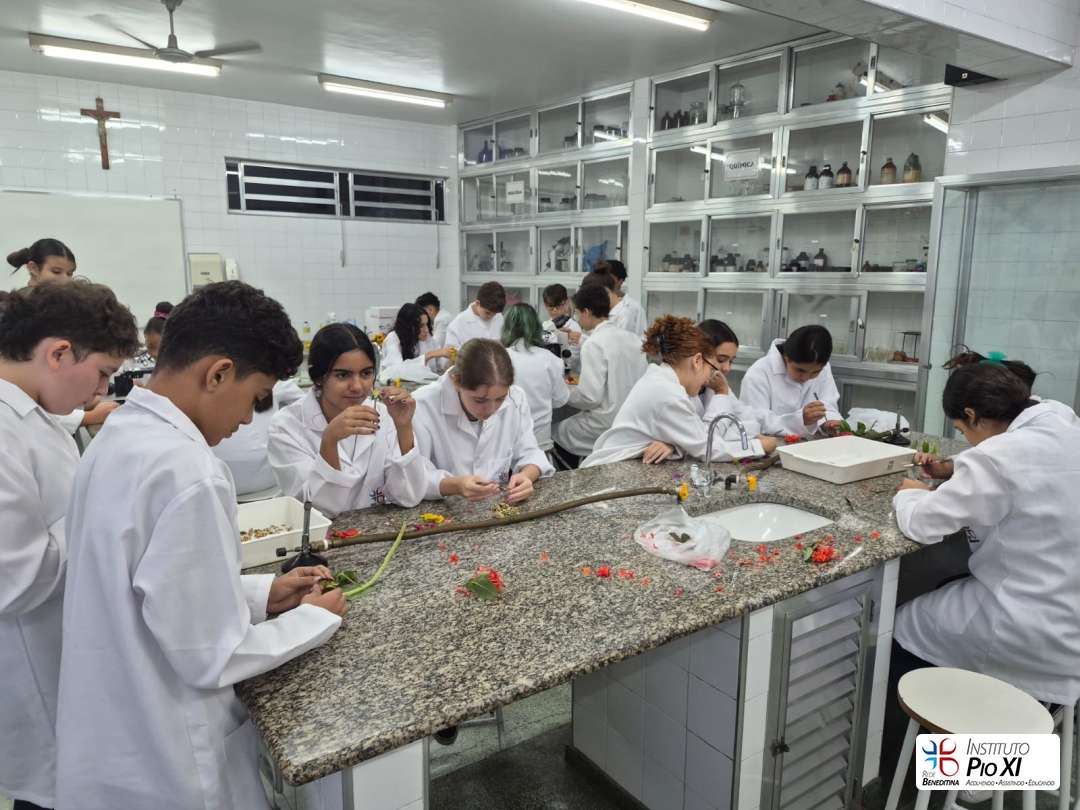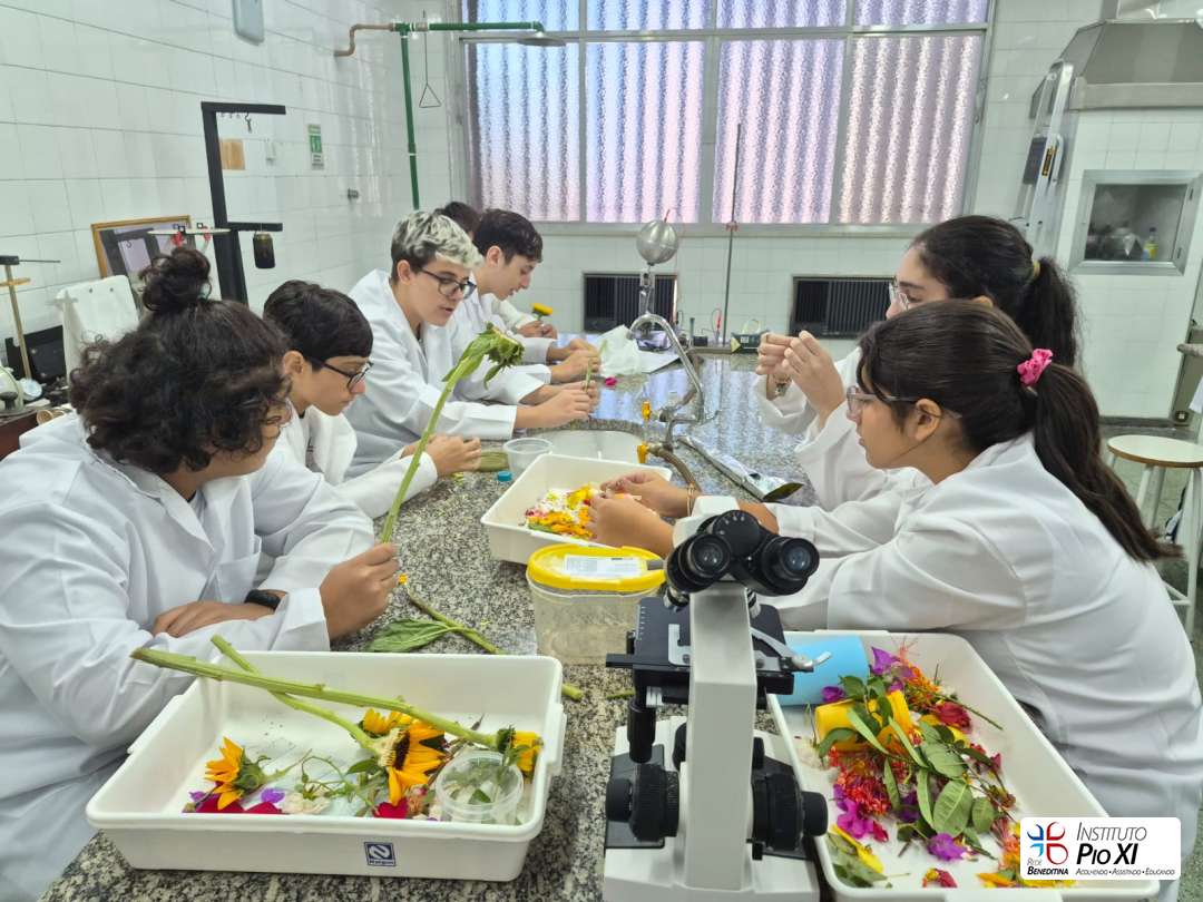 Os alunos do 8º ano realizaram a dissecação de flores para investigar suas partes reprodutivas e, em seguida, observaram as estruturas ao microscópio. Durante a prática, puderam visualizar grãos de pólen, estruturas filamentosas da flor e, com bastante riqueza de detalhes, a antera com seus sacos polínicos — região responsável pela produção do pólen.