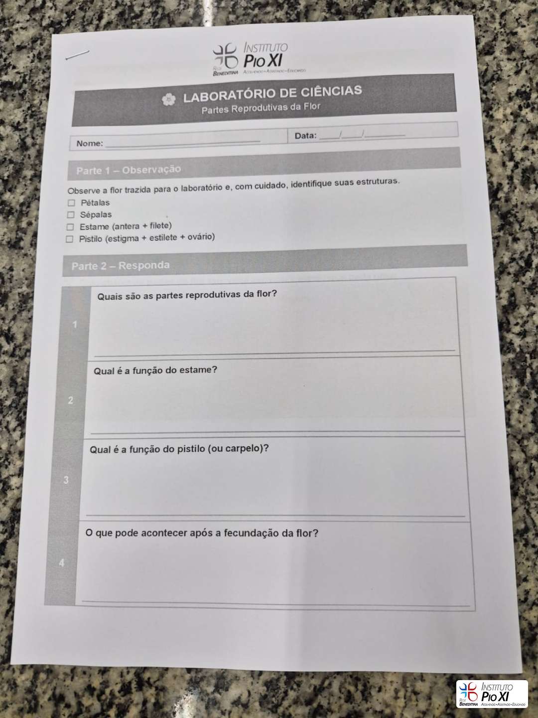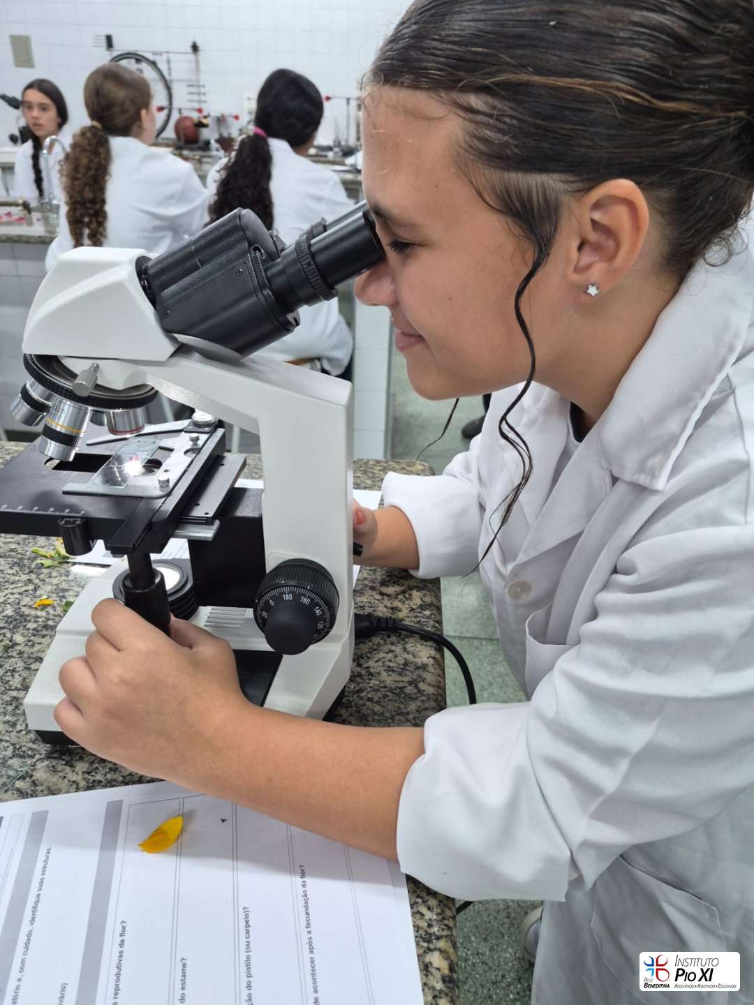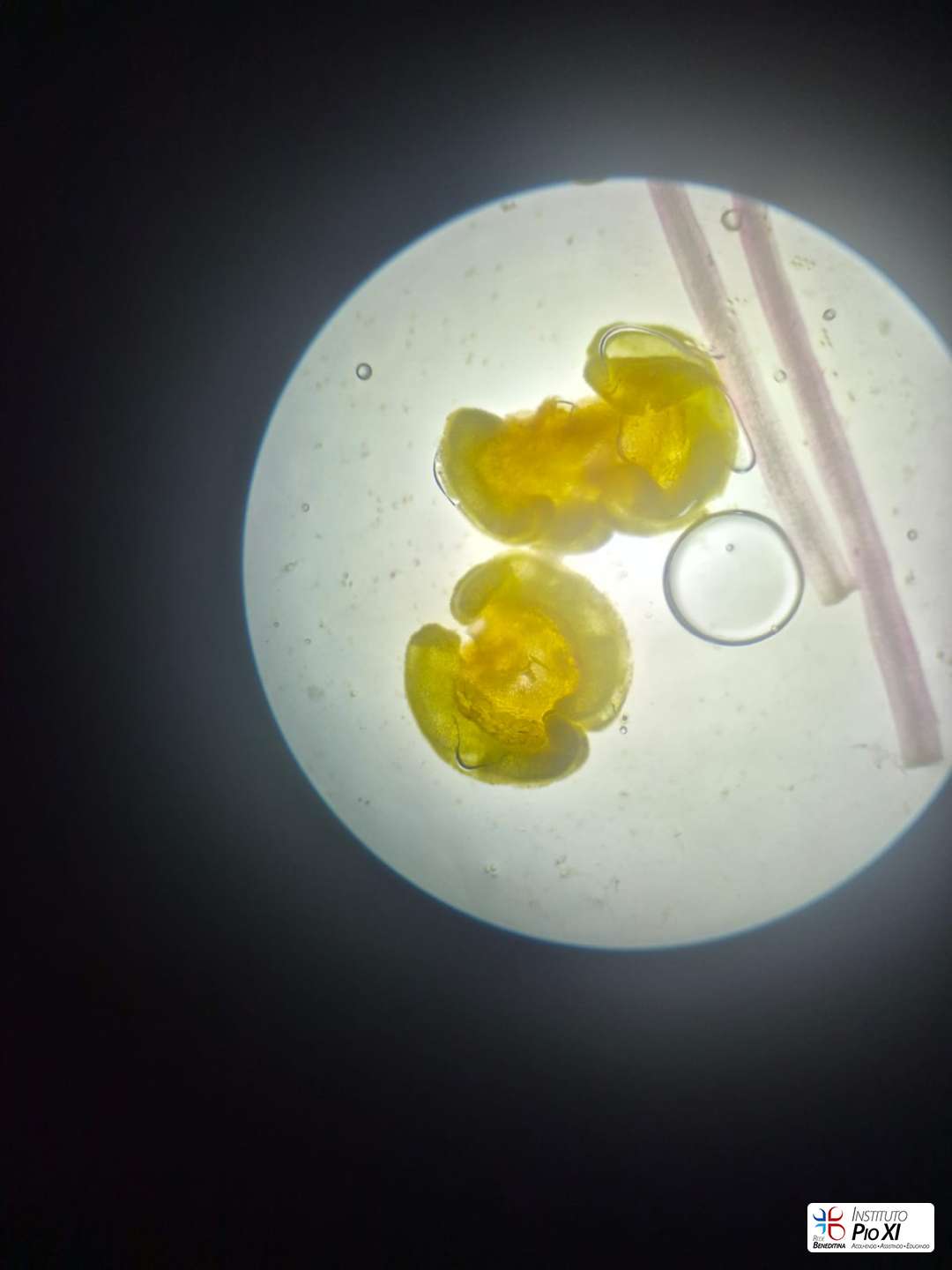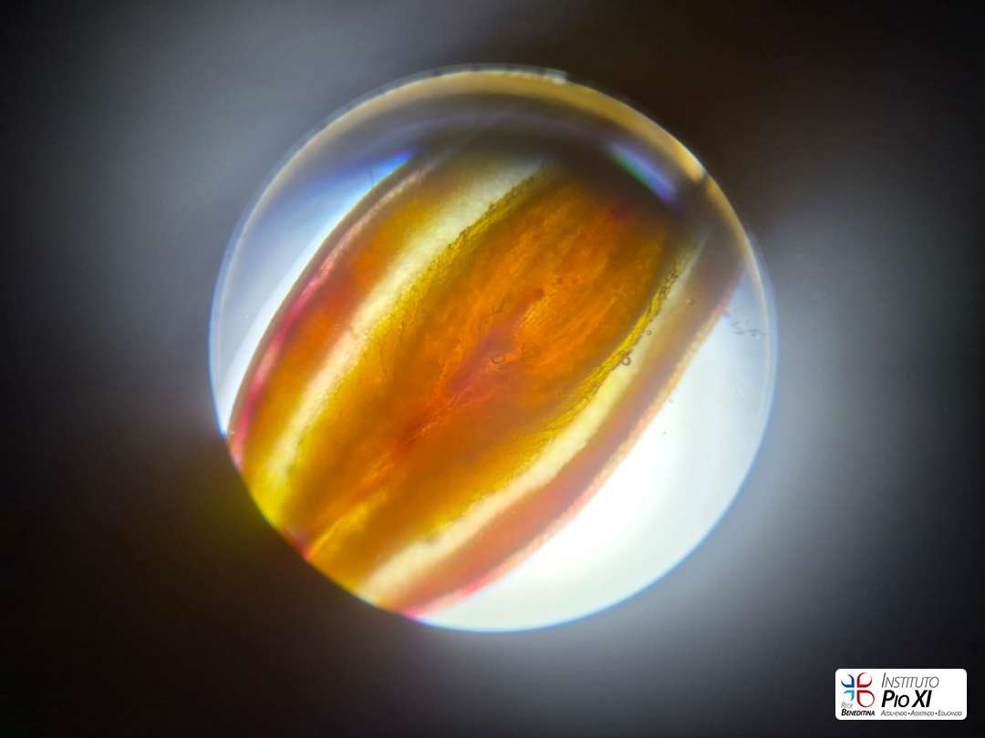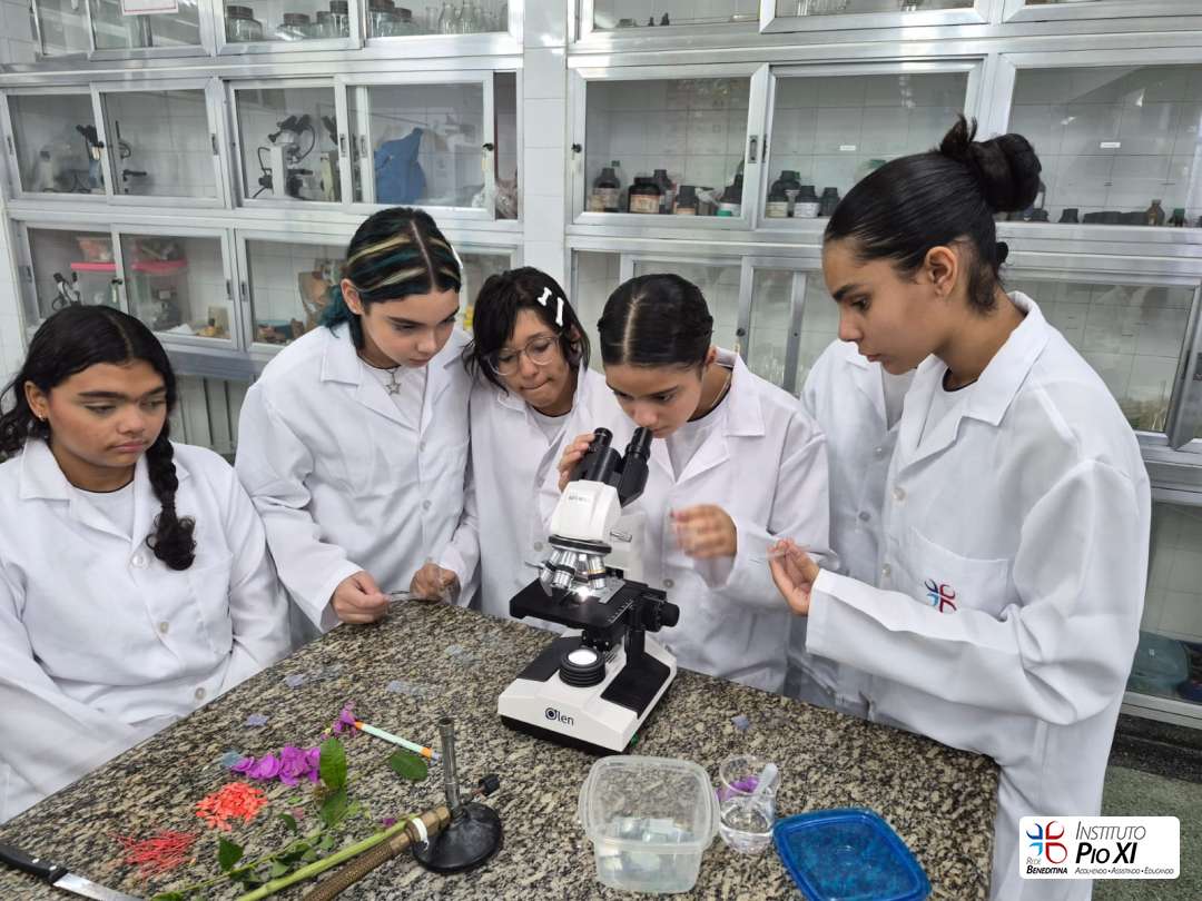 Os alunos do 8º ano realizaram a dissecação de flores para investigar suas partes reprodutivas e, em seguida, observaram as estruturas ao microscópio. Durante a prática, puderam visualizar grãos de pólen, estruturas filamentosas da flor e, com bastante riqueza de detalhes, a antera com seus sacos polínicos — região responsável pela produção do pólen.