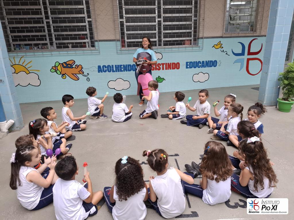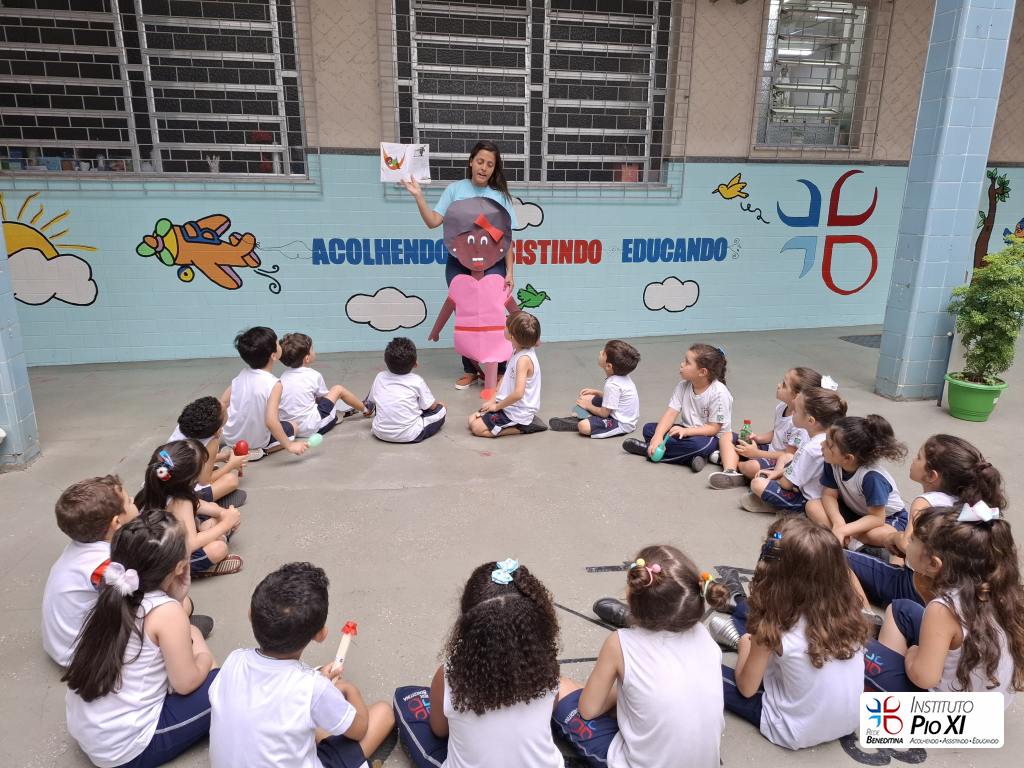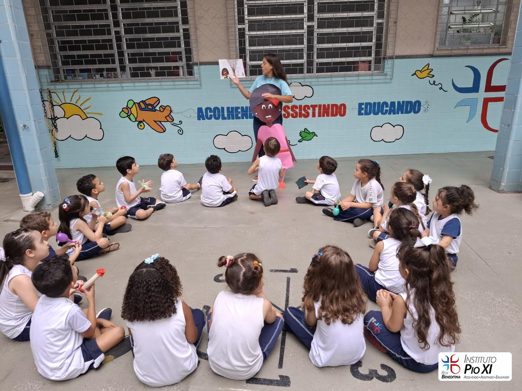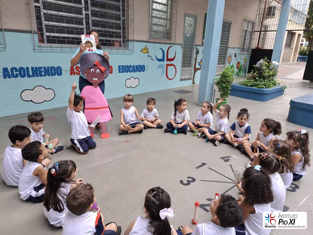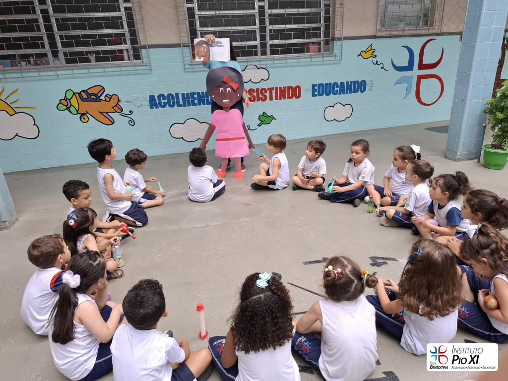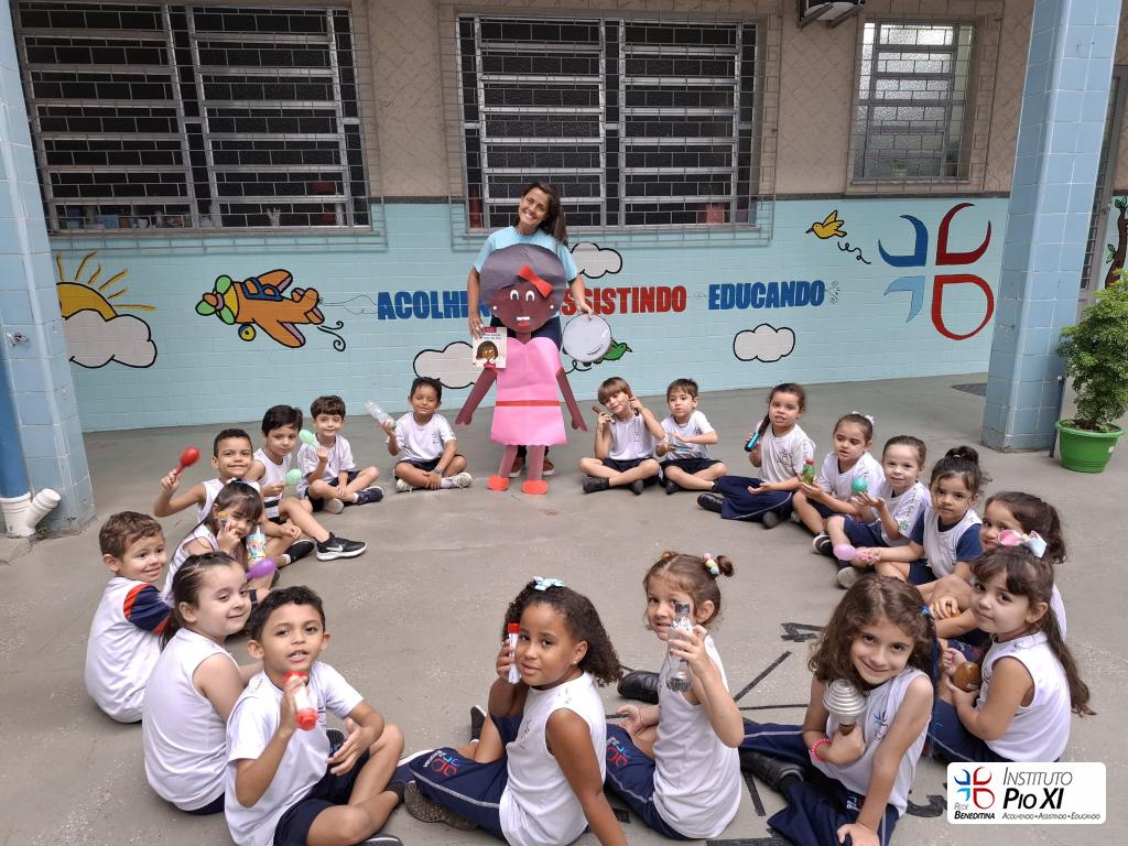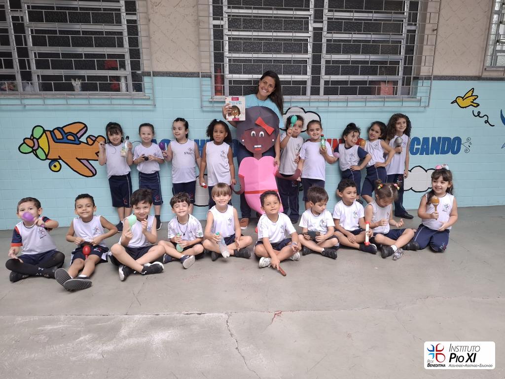 Tiveram participações especiais na história “Menina bonita do laço de fita”: tocaram seus instrumentos musicais confeccionados com materiais recicláveis e da nossa escola para cantar e tocar nos refrões.