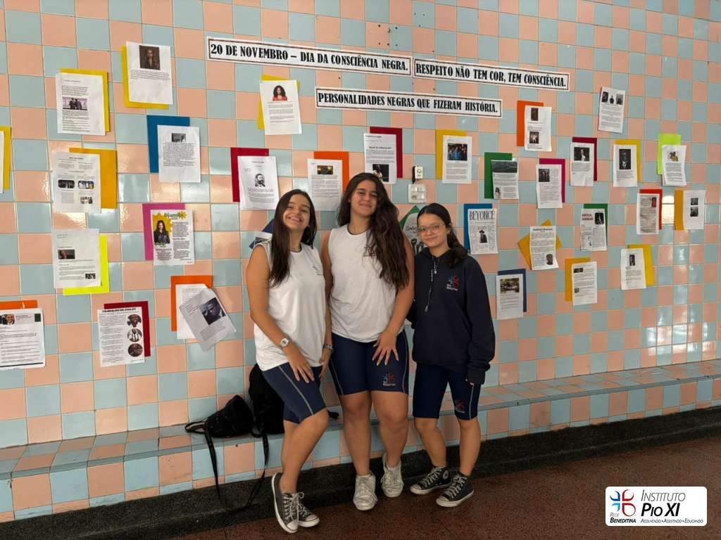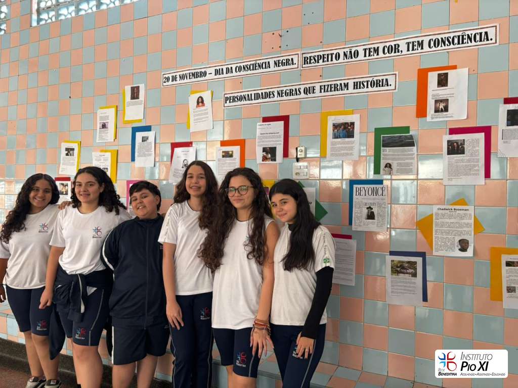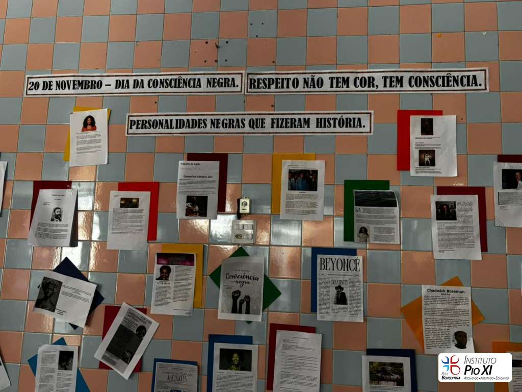 O mês de novembro também foi marcado com o dia da consciência negra. Os alunos do 8º ano, com o apoio da equipe de linguagens, montaram uma exposição para destacar e valorizar a história e as conquistas de personalidades negras.