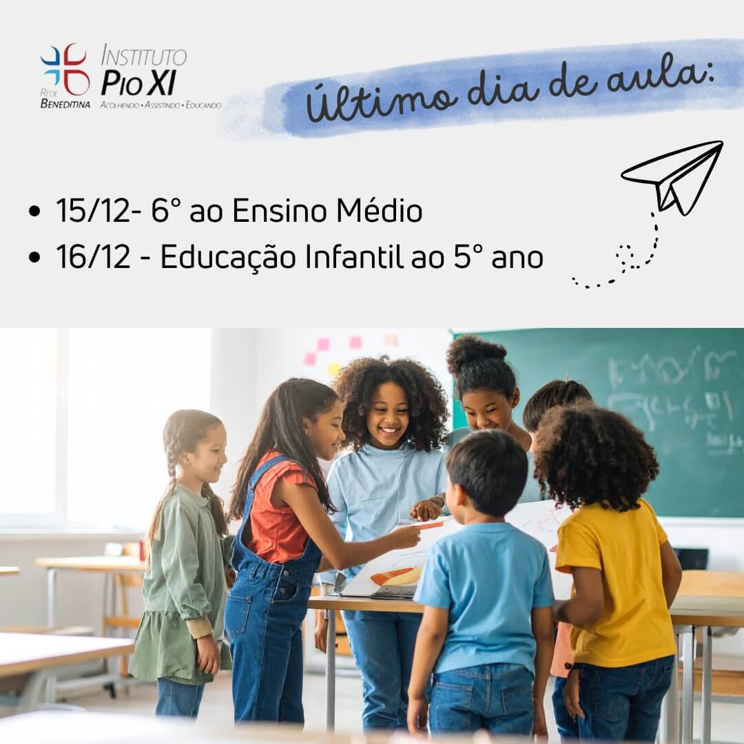 Estamos chegando ao fim de mais um ano letivo repleto de aprendizagens, desafios superados e muitas conquistas. Informamos abaixo as datas dos últimos dias de aula de cada segmento:
