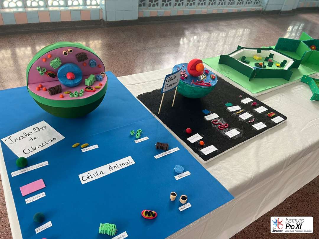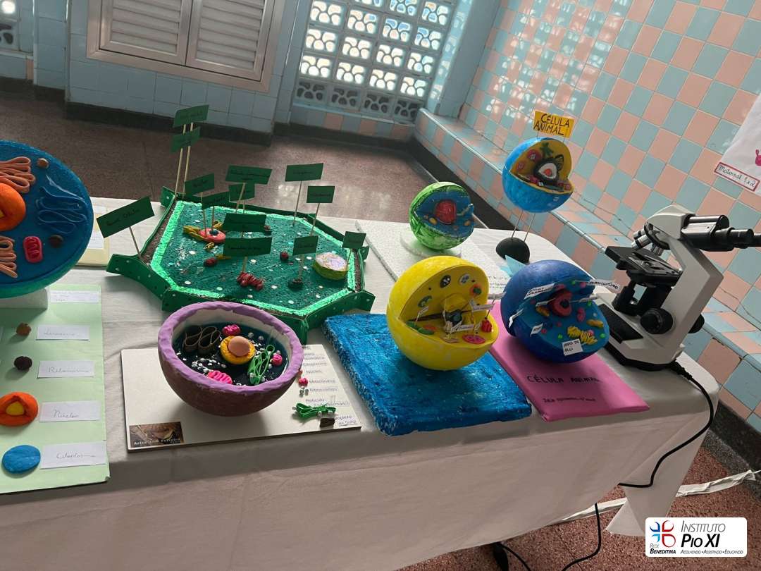 Durante a exposição, foi possível observar representações ricas e detalhadas de células animais e vegetais, mostrando as diferenças e estruturas de forma clara, criativa e cheia de significado. Para enriquecer ainda mais a experiência, os alunos também realizaram a visualização da célula vegetal no microscópio, conectando suas produções com a realidade científica de forma prática e fascinante.