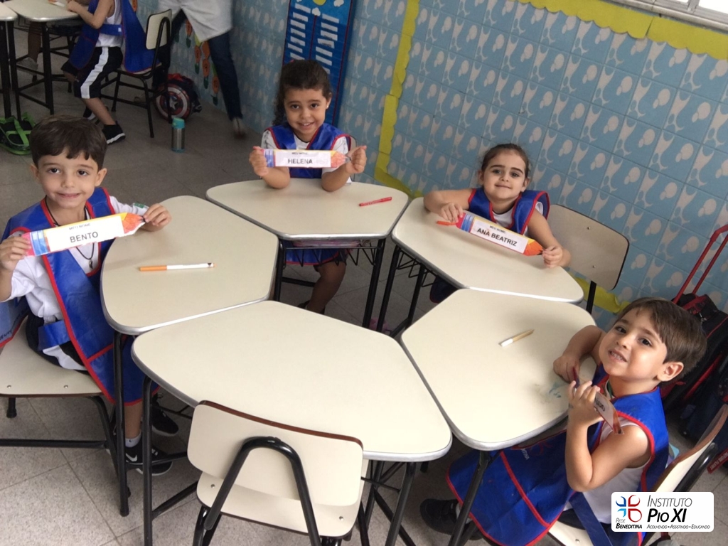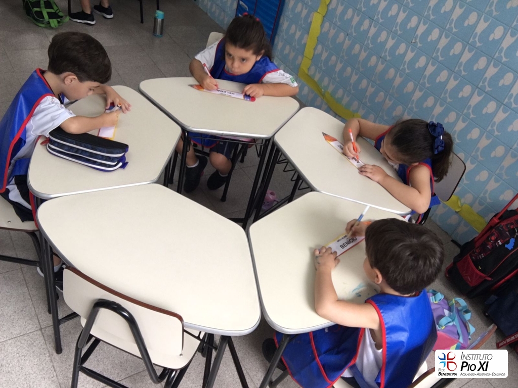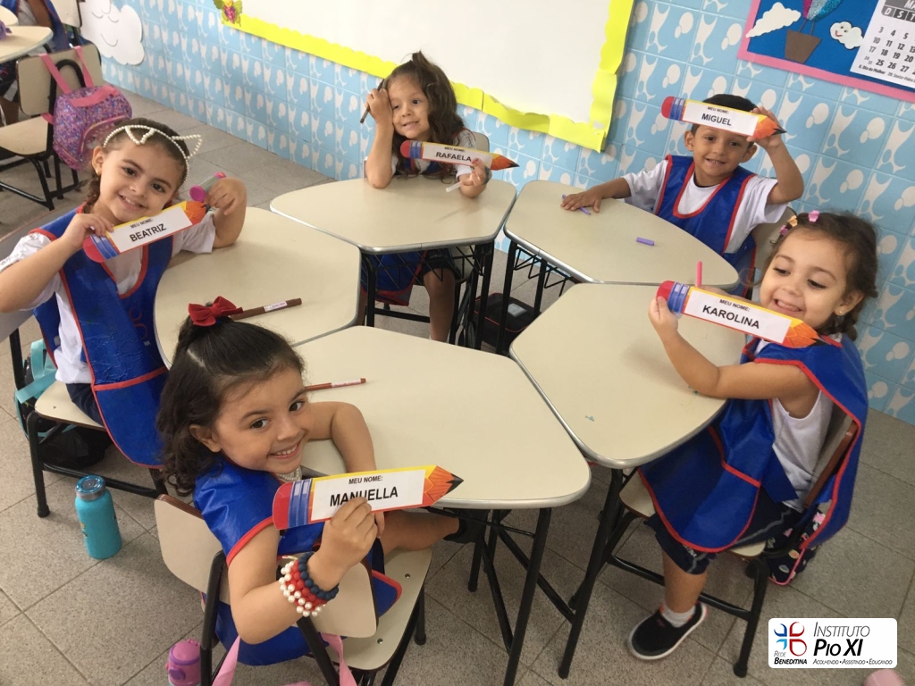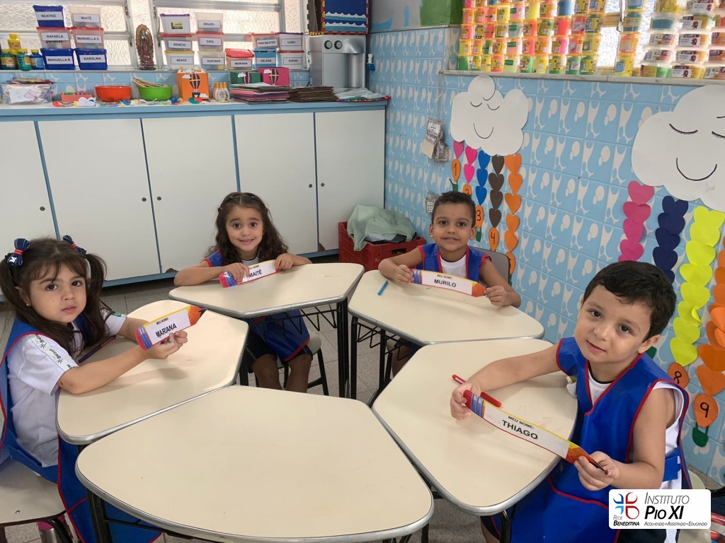 Os alunos do Pré 1, orientados pela professora Gabriella, estão aprendendo a escrita do nome.