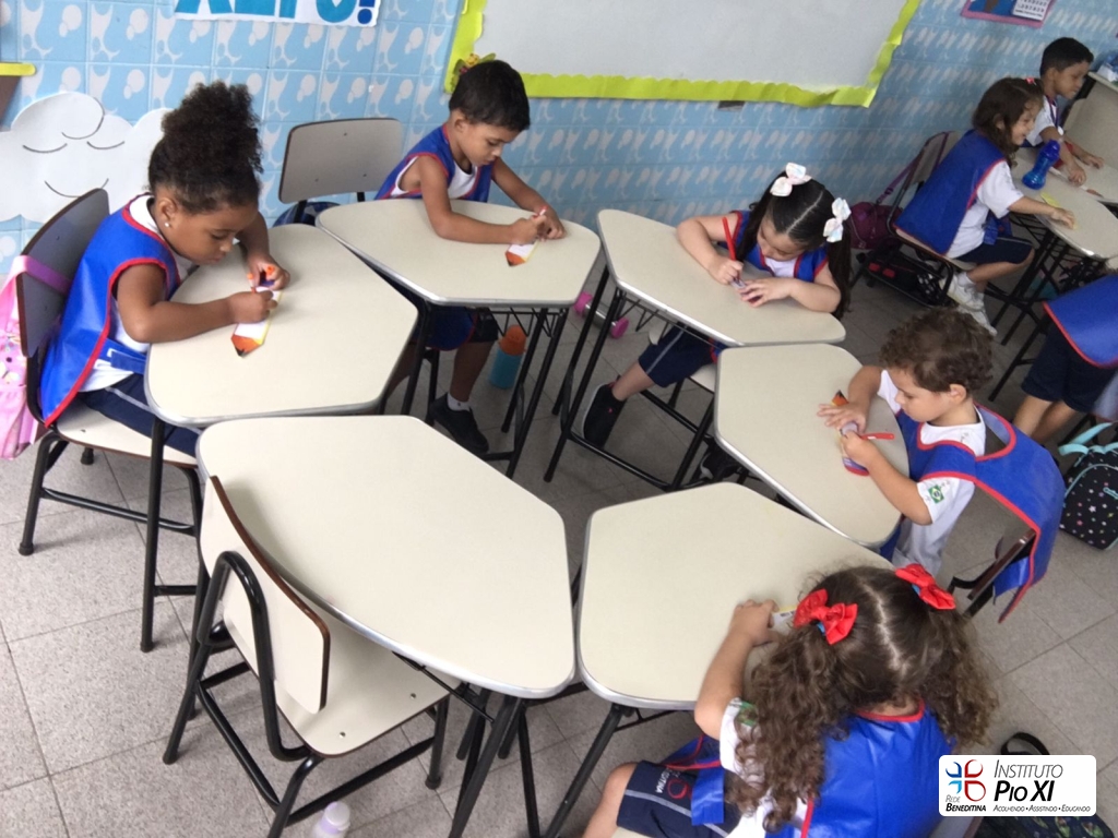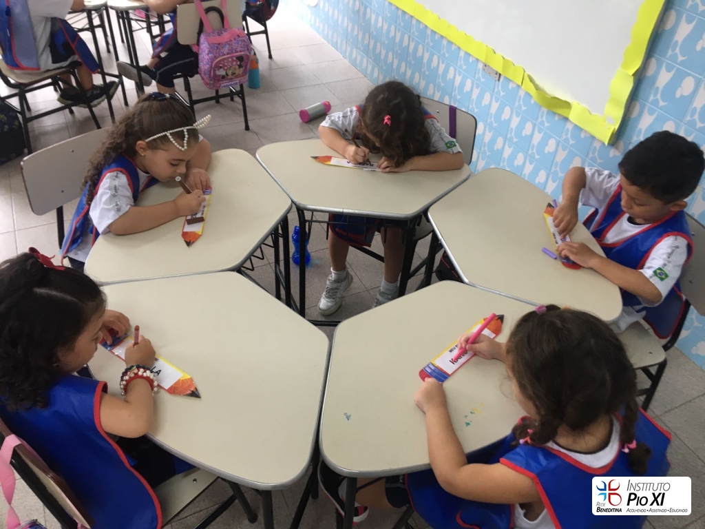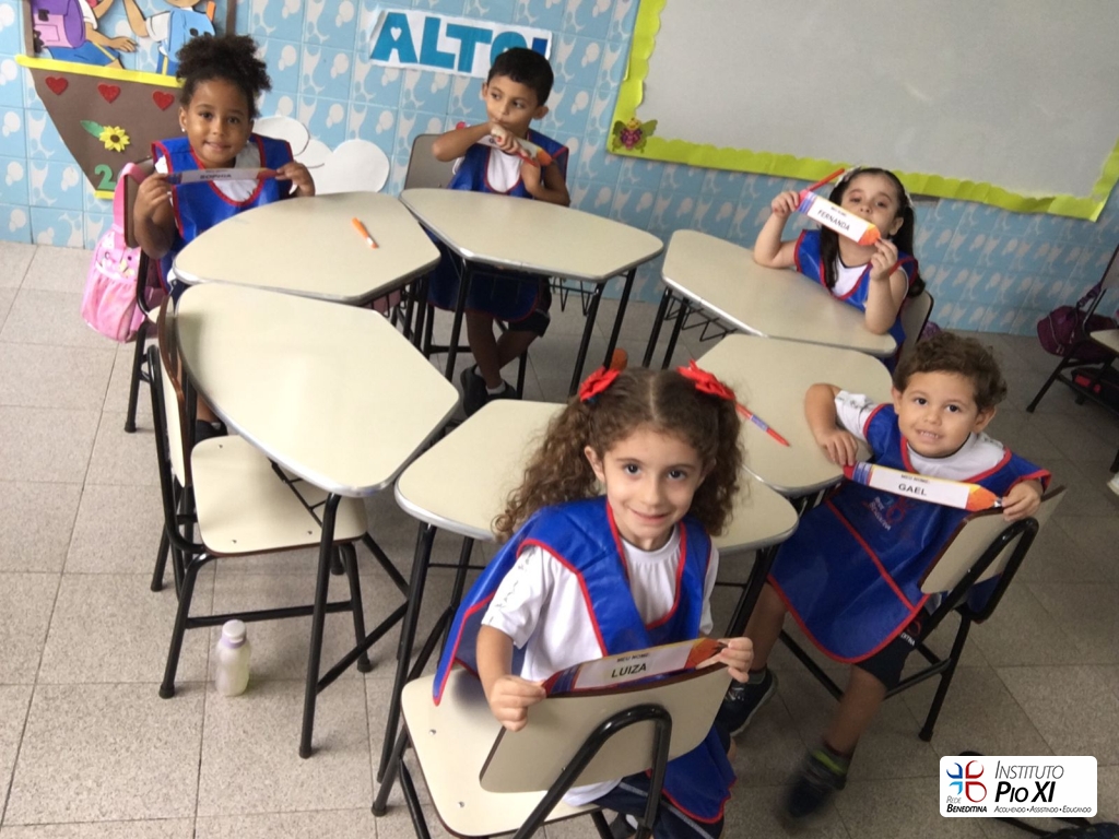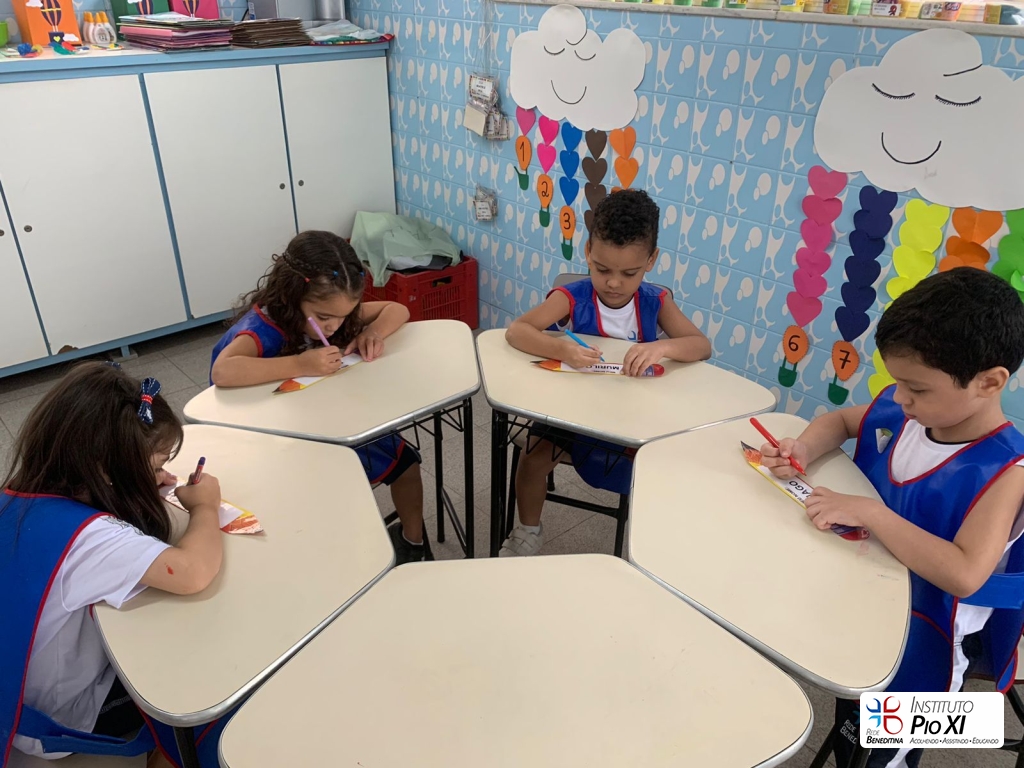 Os alunos do Pré 1, orientados pela professora Gabriella, estão aprendendo a escrita do nome.