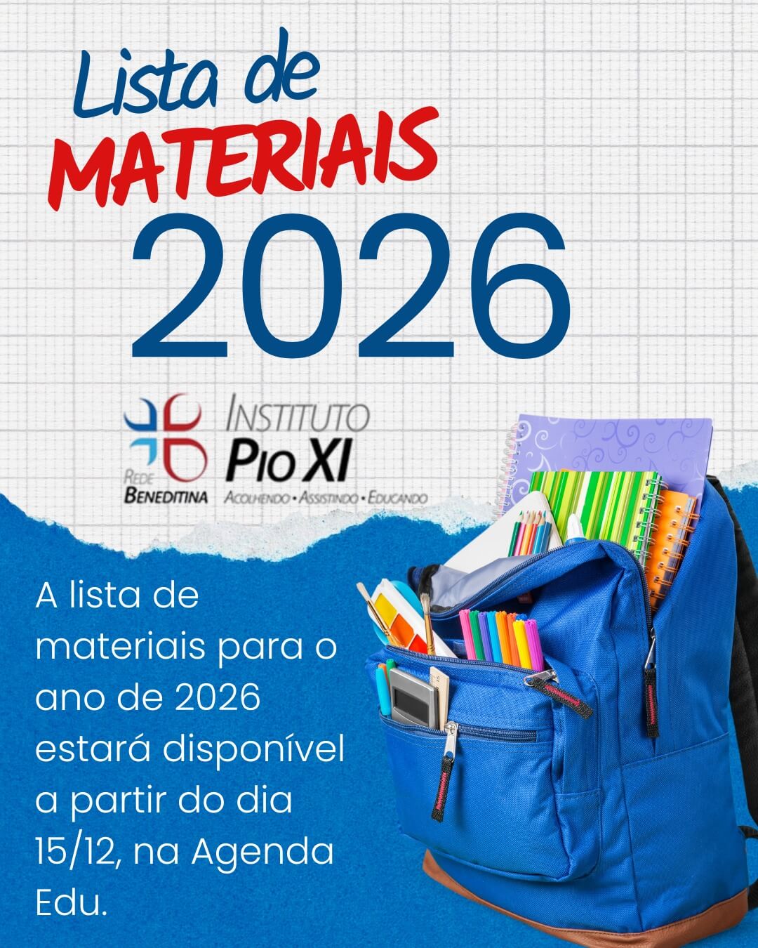 A lista de materiais escolares para o ano letivo de 2026 será disponibilizada a partir do dia 15 de dezembro na Agenda Edu.