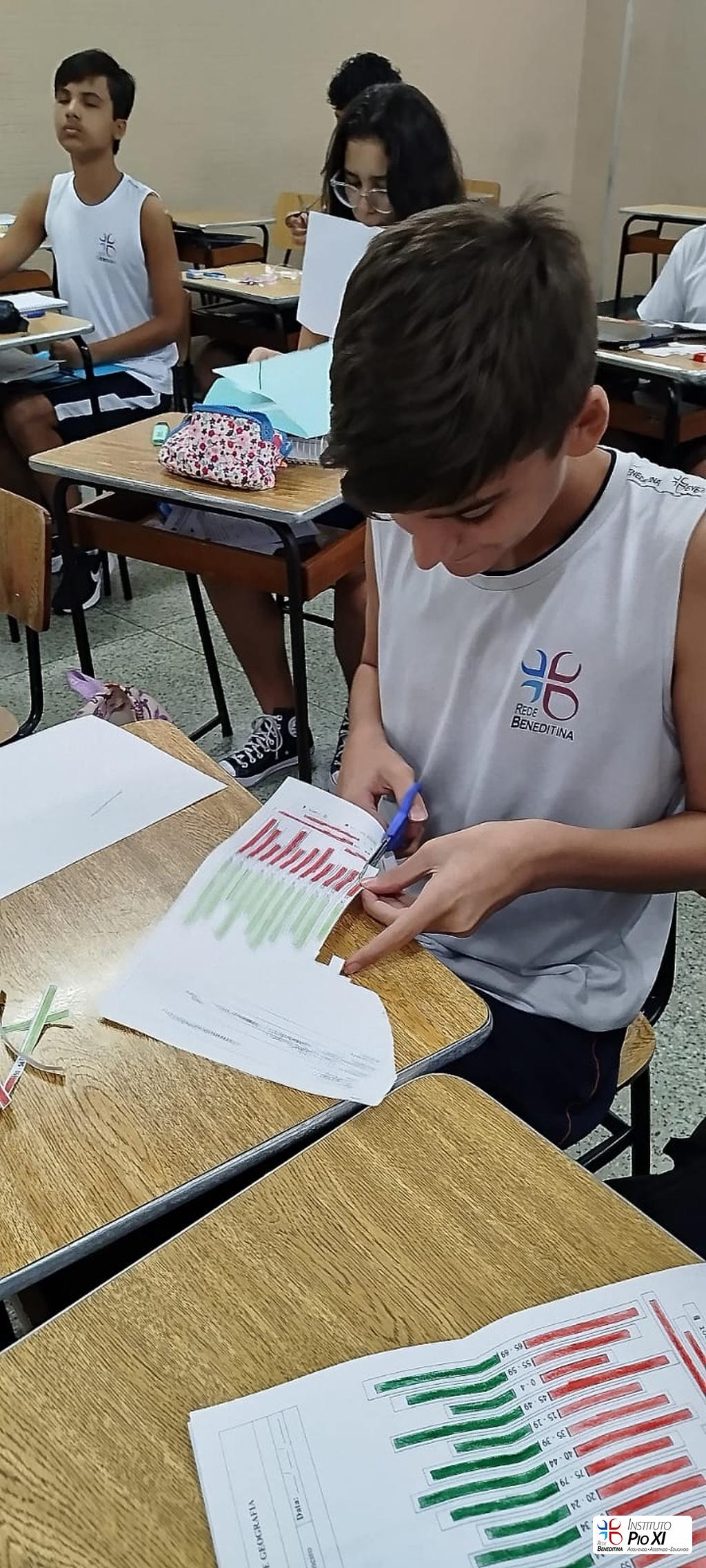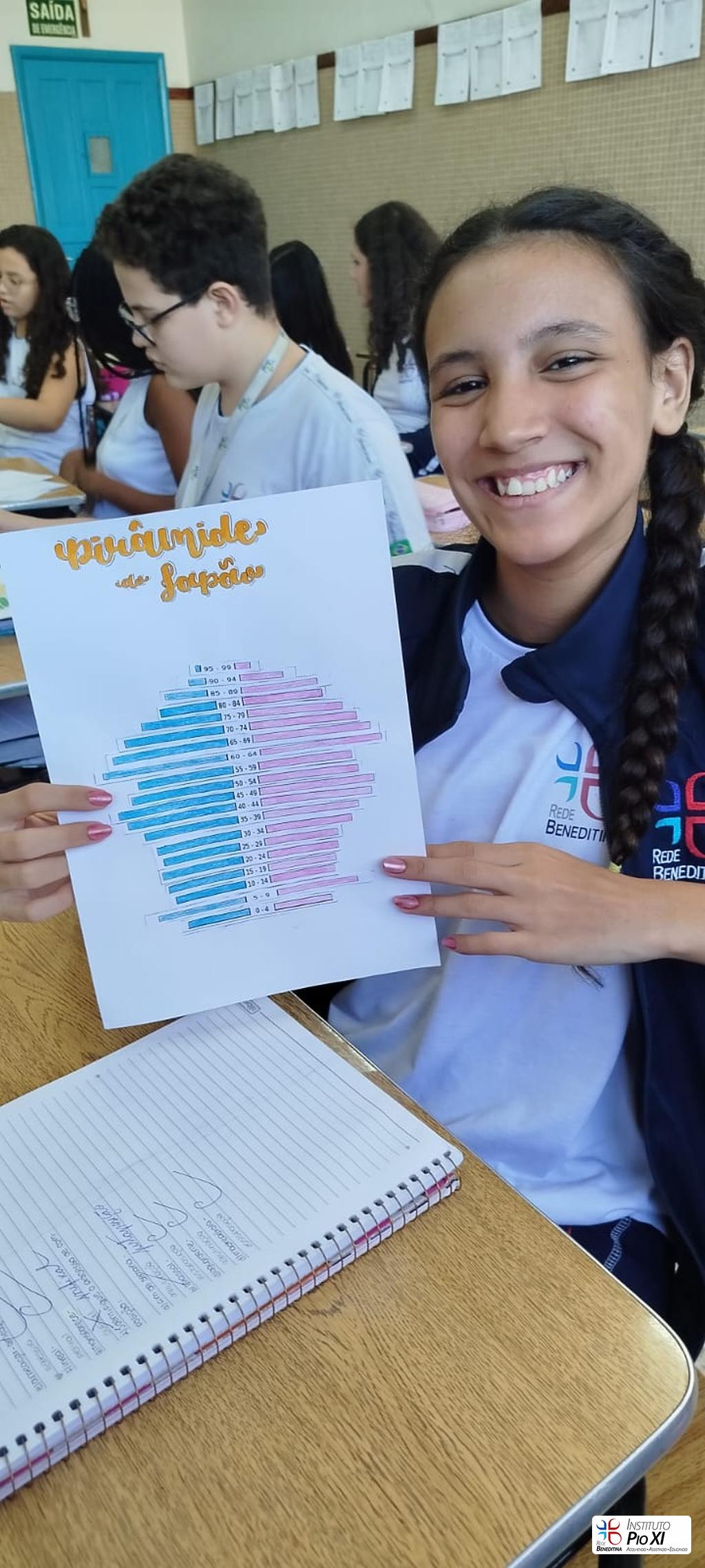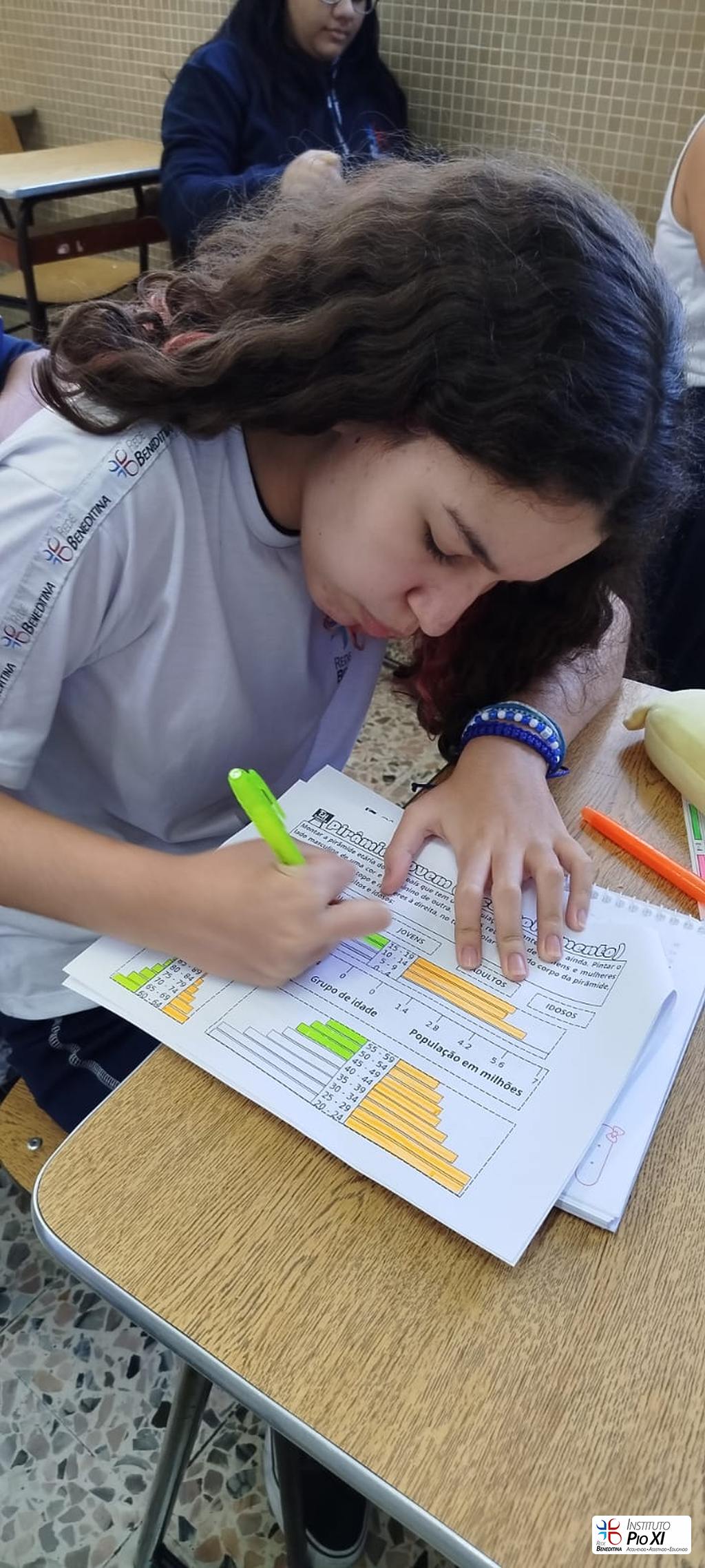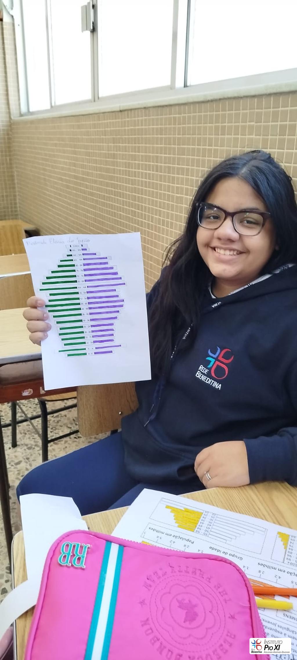 Durante a aula de geografia, os alunos do 8 ano, direcionados pela professora Taise, receberam como desafio confeccionar uma pirâmide etária do zero.