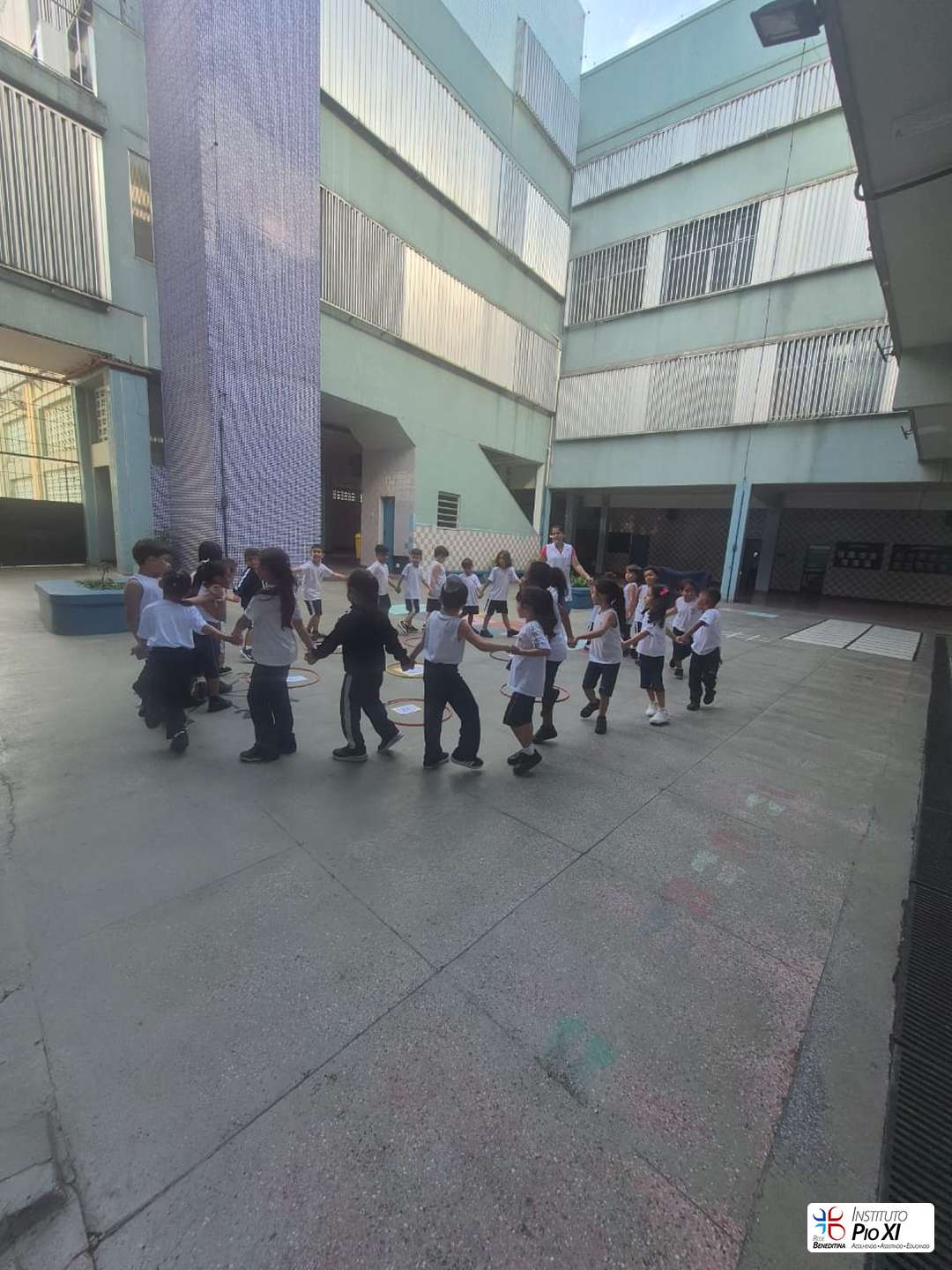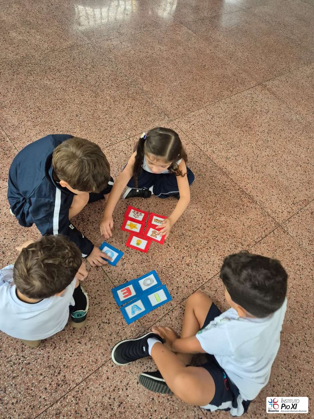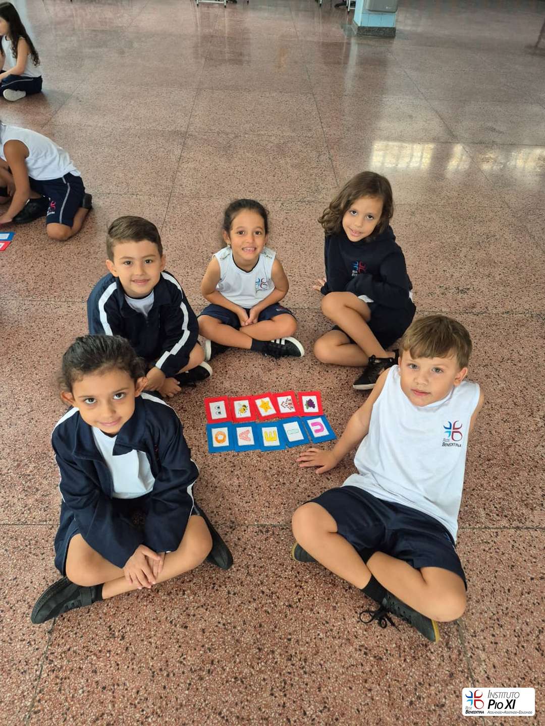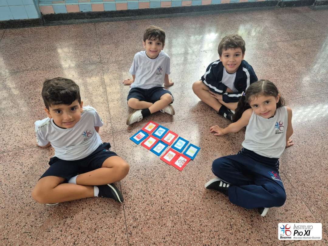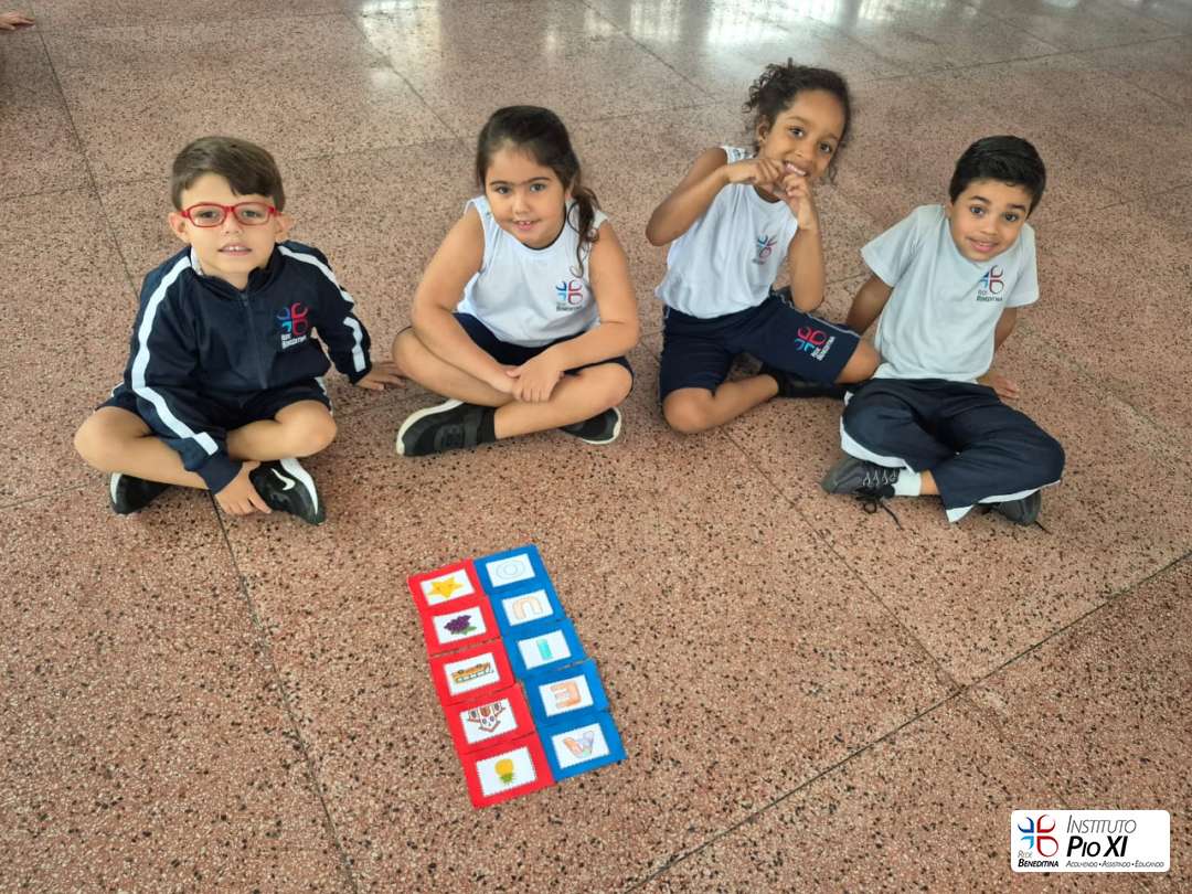 Os alunos do Pré 2, orientados pela professora Gabriella, revisaram as vogais por meio de um jogo da memória em grupo e da música dos encontros vocálicos, pulando nos bambolês conforme os sons falados pela professora.