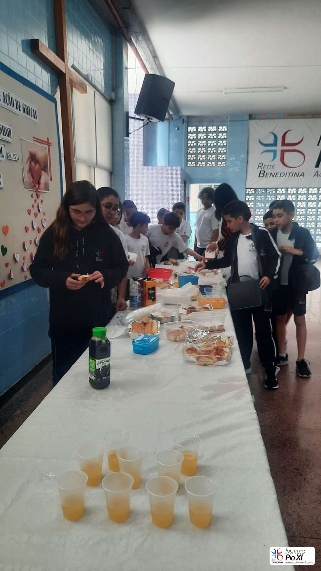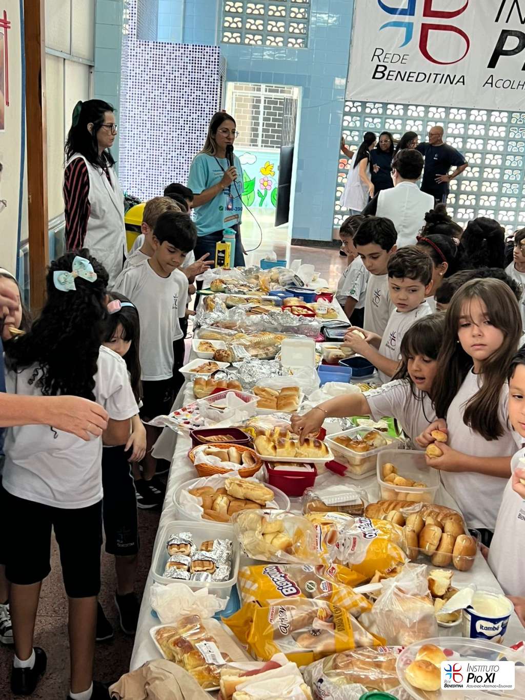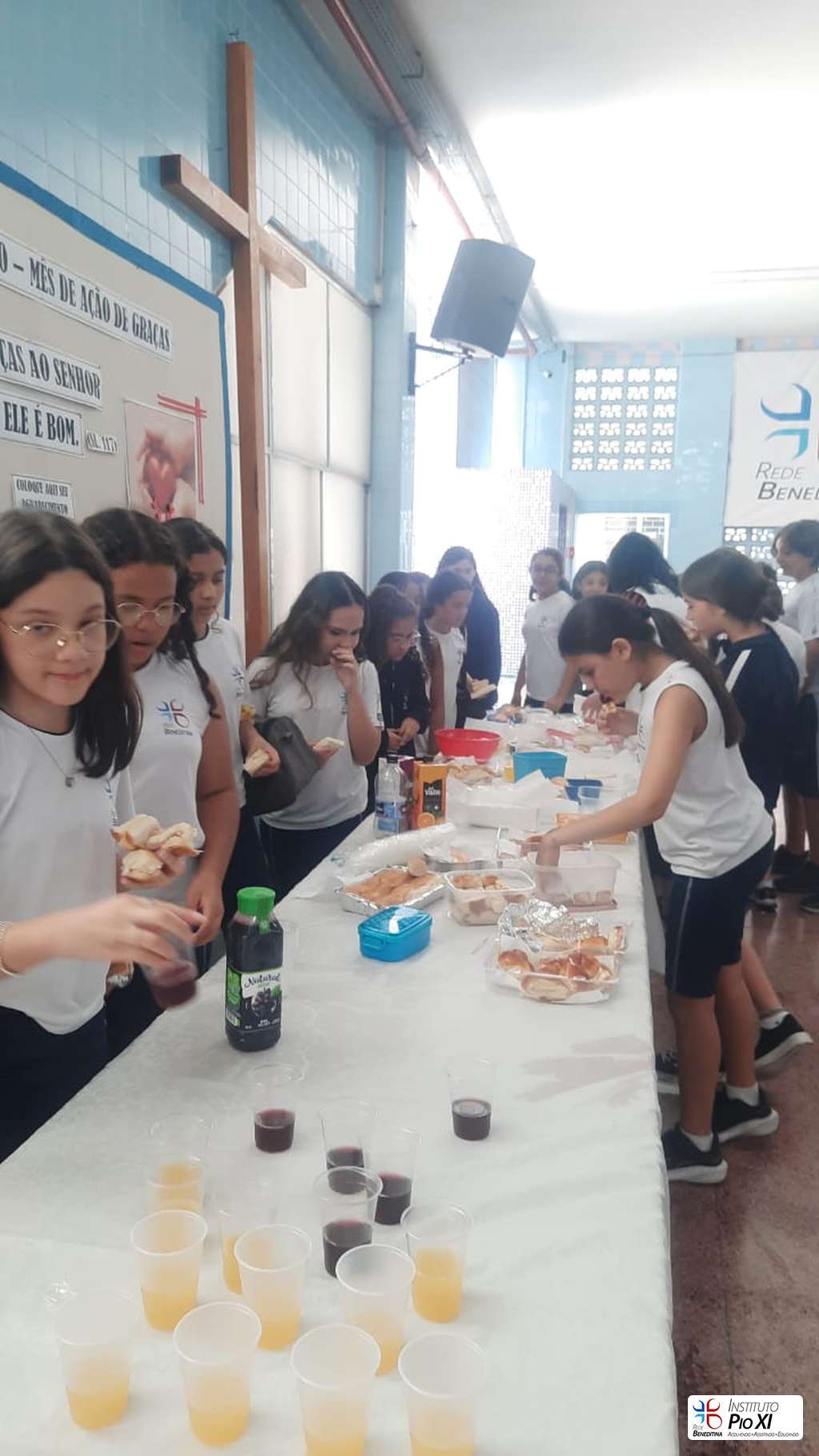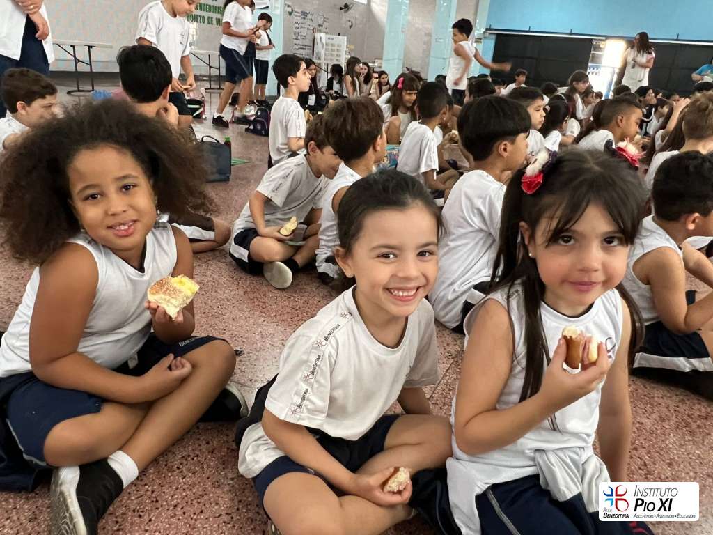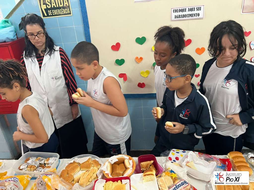 Na partilha do pão promovida pela equipe de Língua Inglesa, os alunos rezaram e agradeceram as bênçãos recebidas durante o ano.