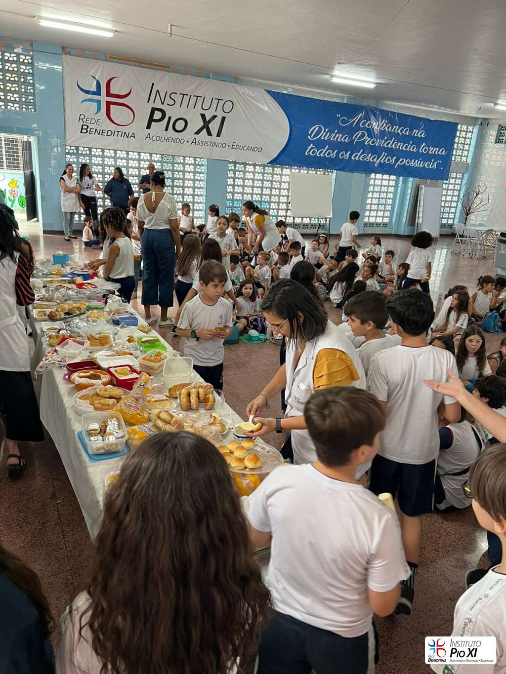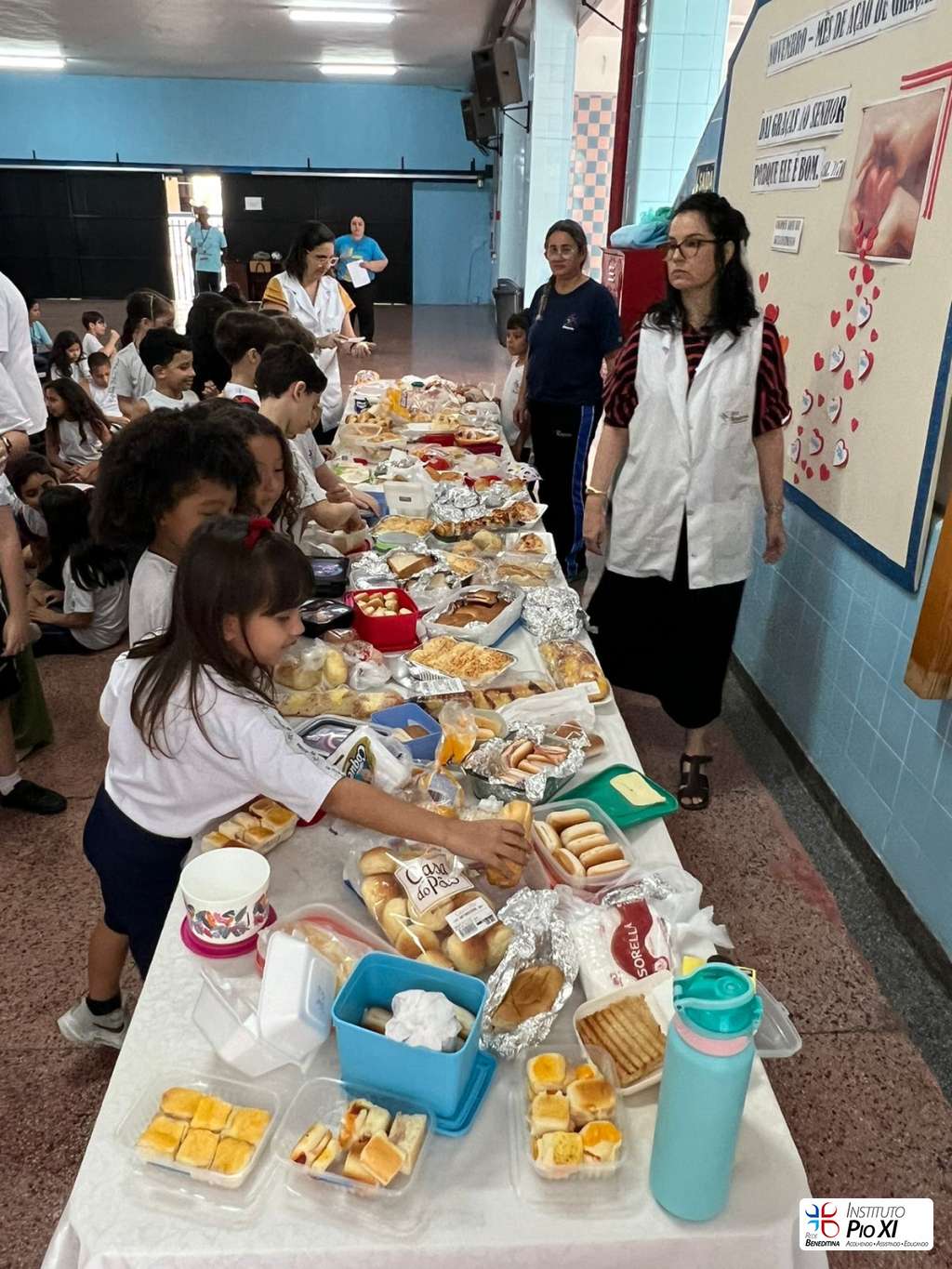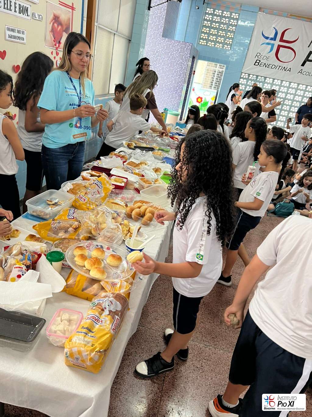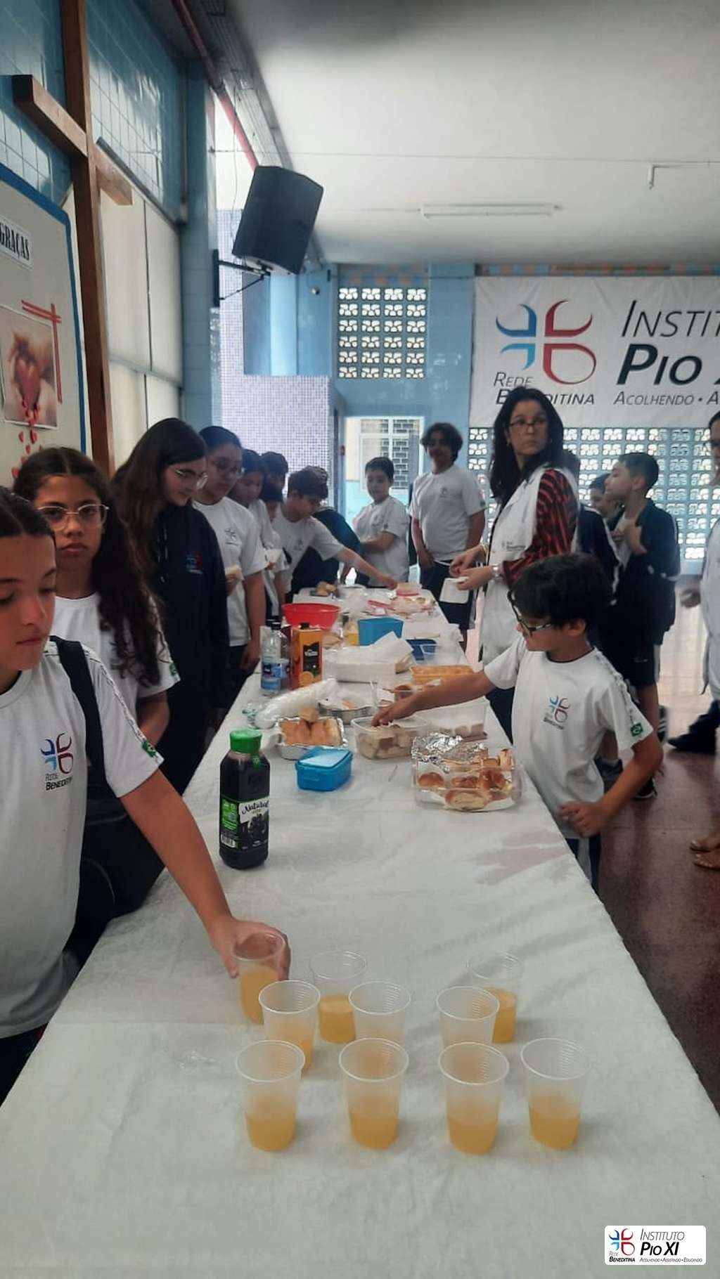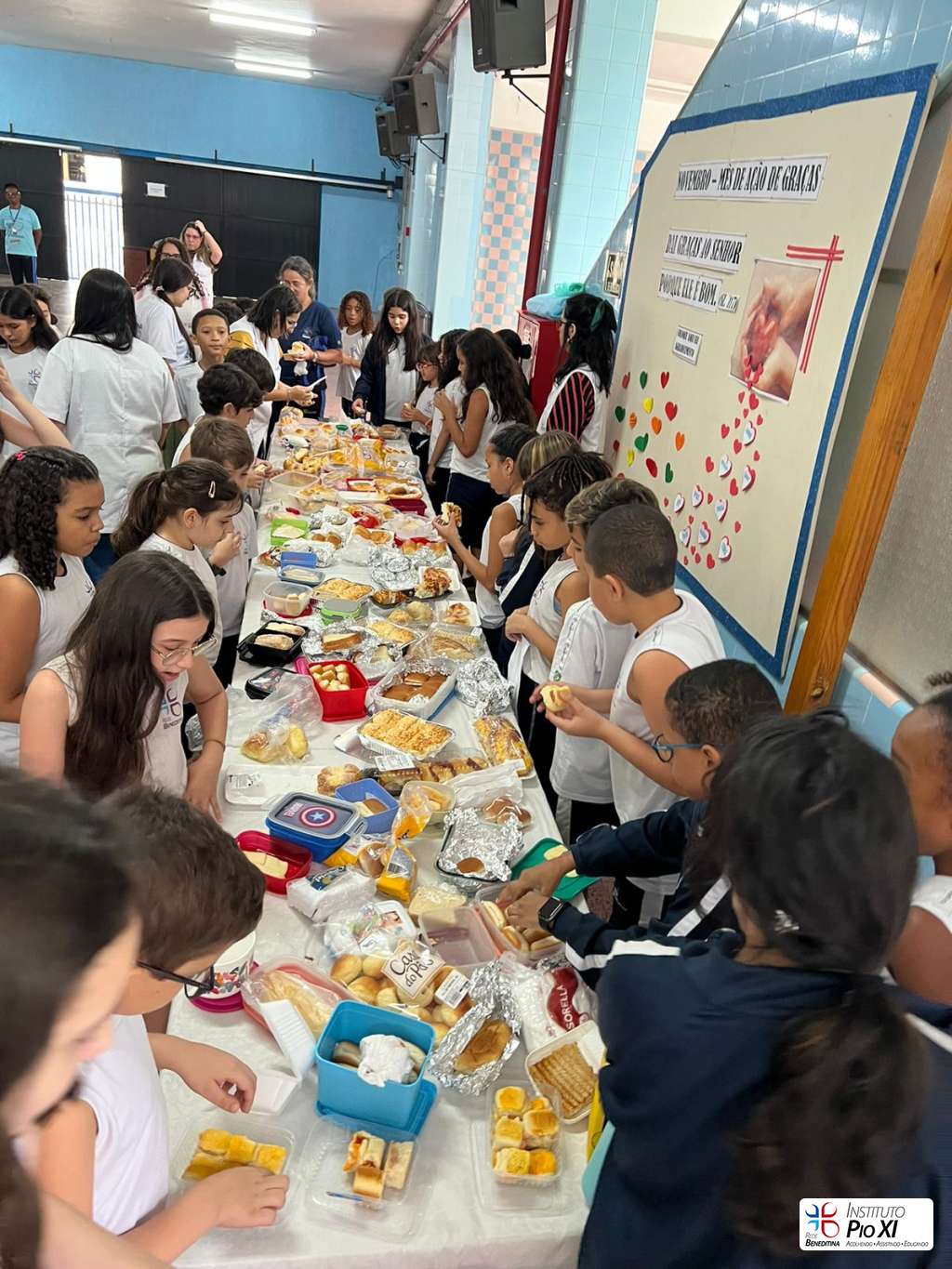 Na partilha do pão promovida pela equipe de Língua Inglesa, os alunos rezaram e agradeceram as bênçãos recebidas durante o ano.